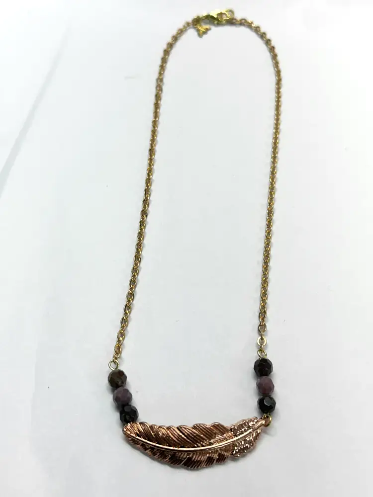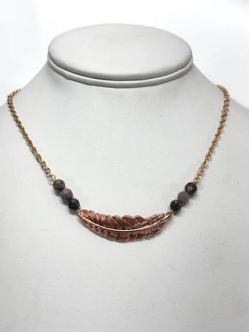 Vintage feather purple semi precious bead necklace. Gold tone chain with purple semi precious stone beads and rose gold feather charm. Vintage necklace. MN55G.