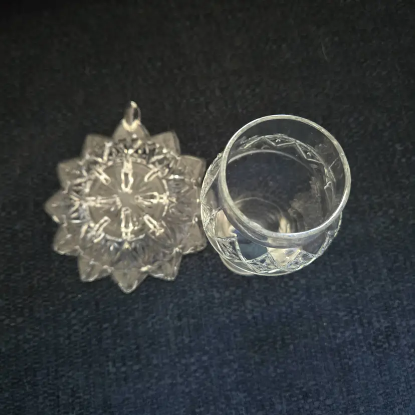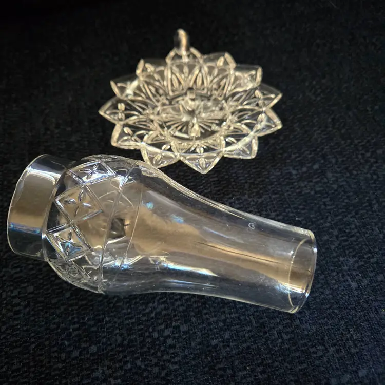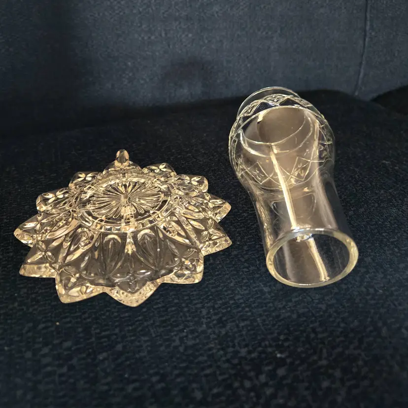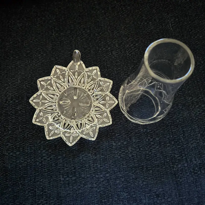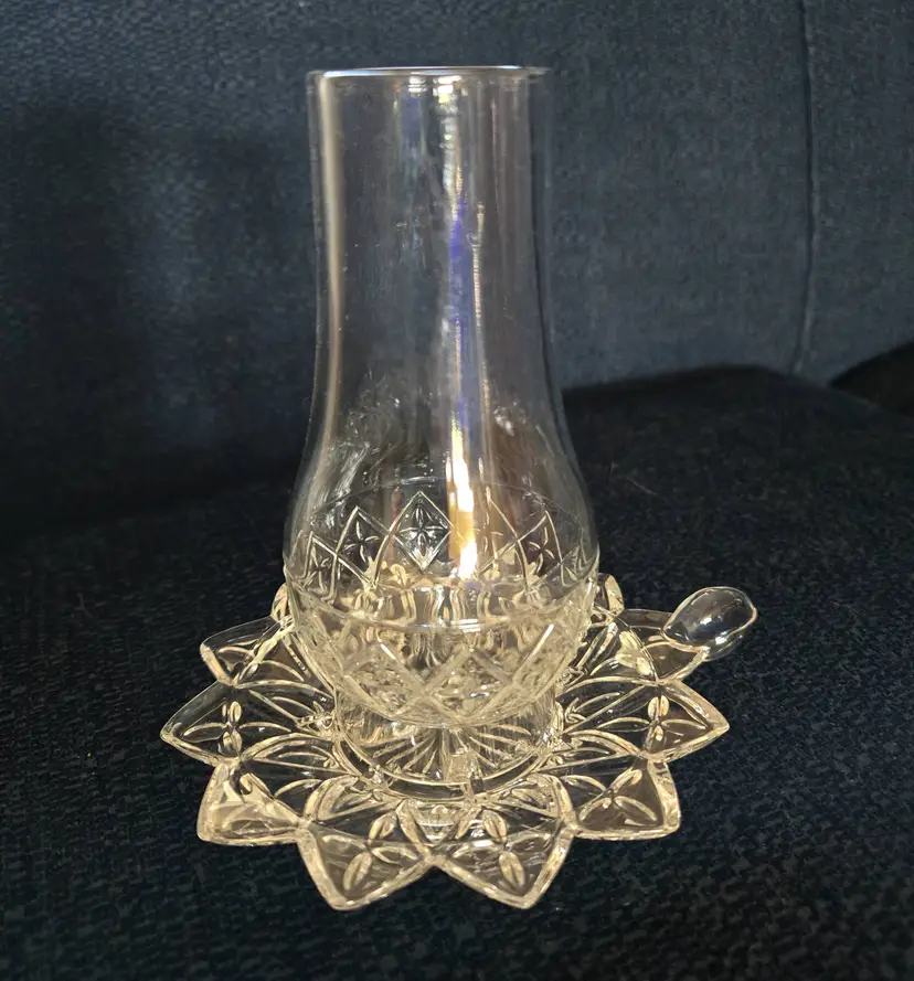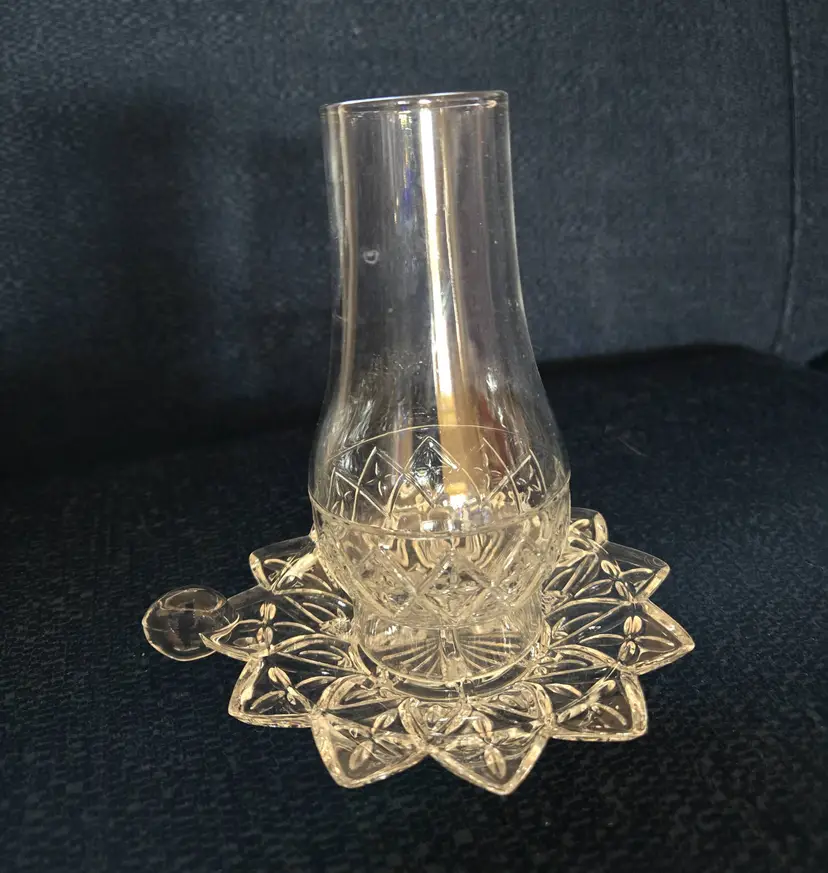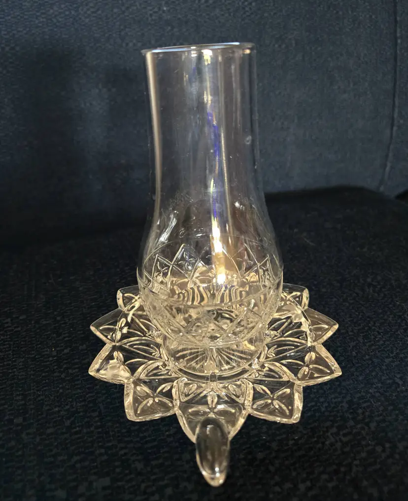 Features a two piece design with a glass base and removable hurricane shade. The base is approx. 5 1-4" wide from end to handle. The shade is 2 1/2" wide and 5" tall. Produced by the Federal Glass Co. around the 1960's. It holds a small taper, votive, or tea light candle. No chips, cracks, or repairs.