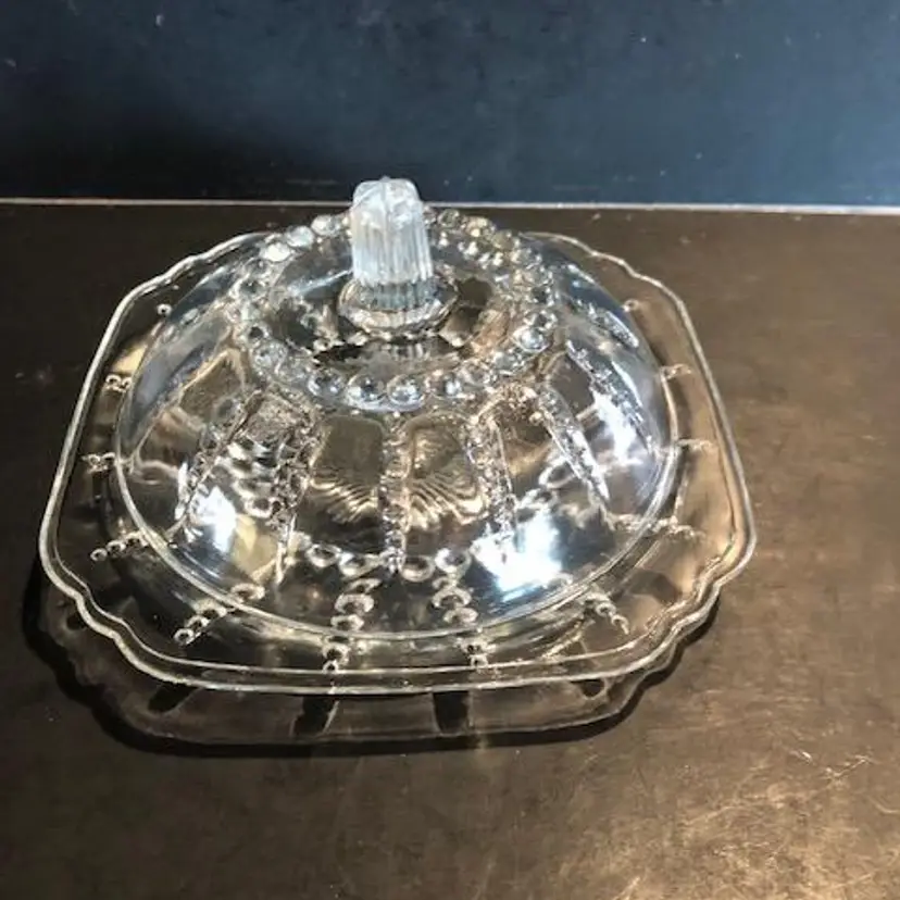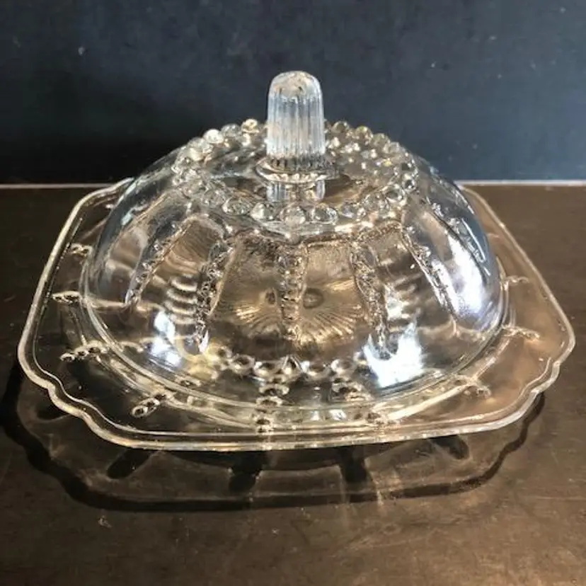 Vintage Federal Glass Columbia Clear Glass Beaded Covered Butter Dish. 3-1/2" tall, 6" wide. Good condition.