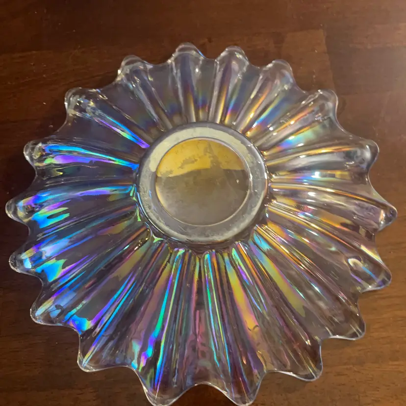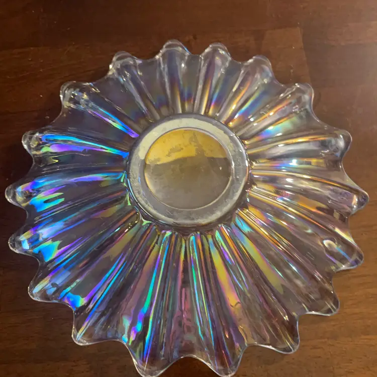 The 'Celestial' or 'Starburst' pattern, characterized by its radiating lines and iridescent sheen, is a prime example of Federal Glass's contribution to mid-century decorative glassware. These bowls were often used as centerpieces or decorative trays, adding a touch of glamour and color to home decor. The iridescent finish, achieved through a metallic salt treatment during the glassmaking process, gives the pieces a unique, shimmering quality that changes with the light.