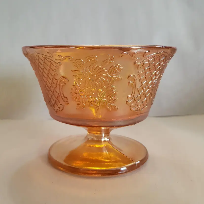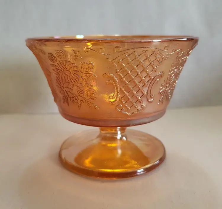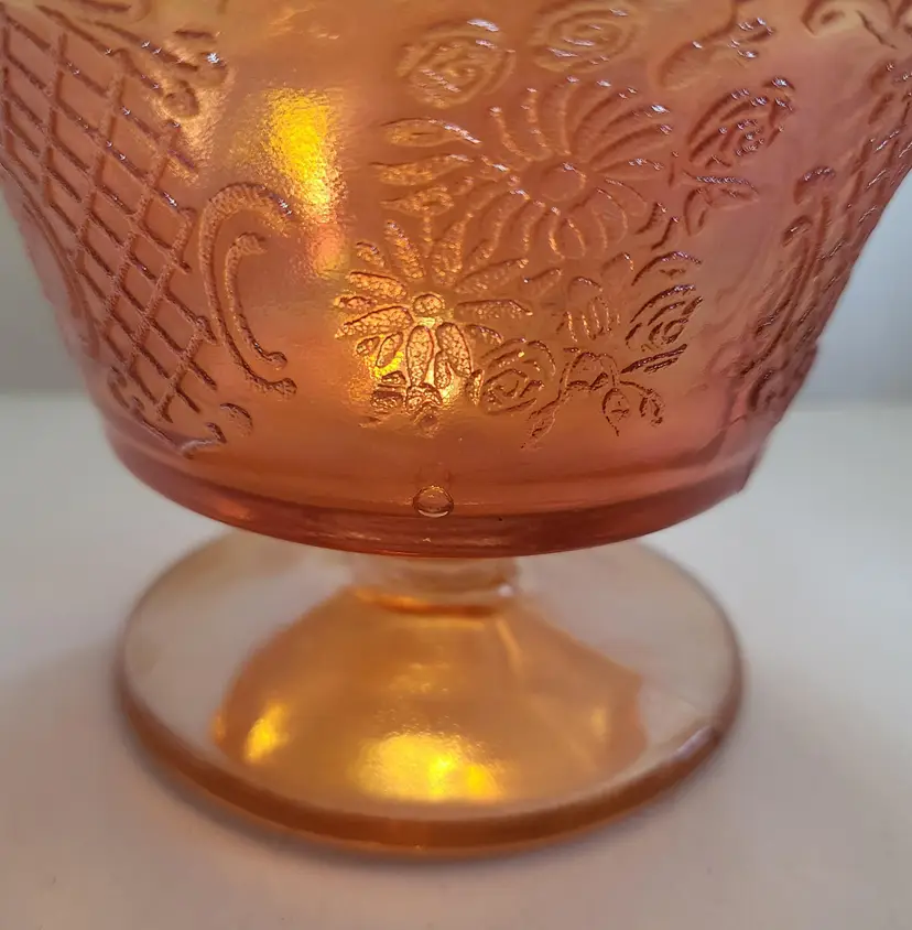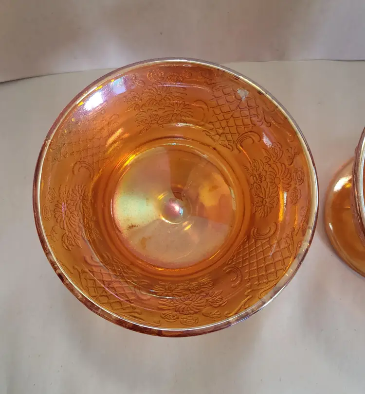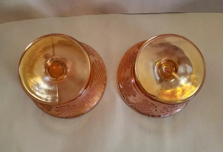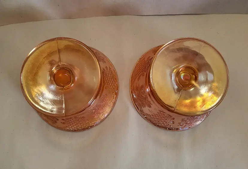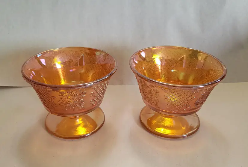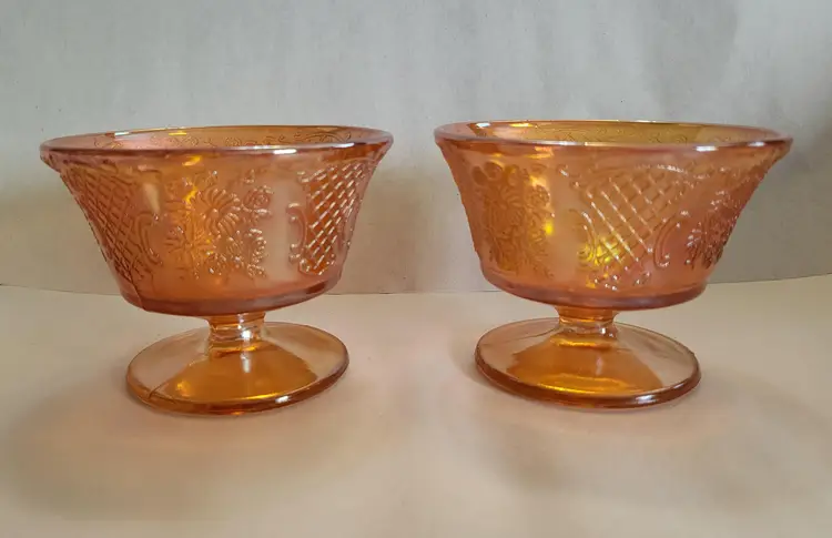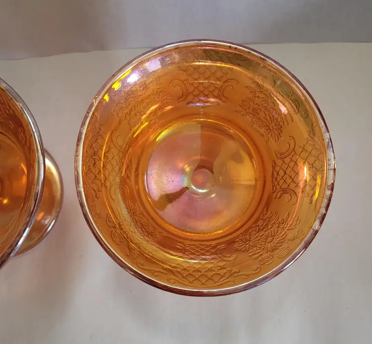 This listing is for a set of 2 iridescent dessert cups. They were made by Federal Glass in the 1930's. This pattern is called Normandie and the iridescent Marigold color is called Sunburst. The Normandie pattern was produced from 1933-1940.