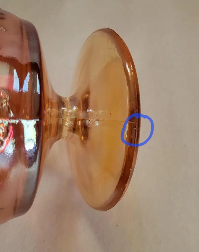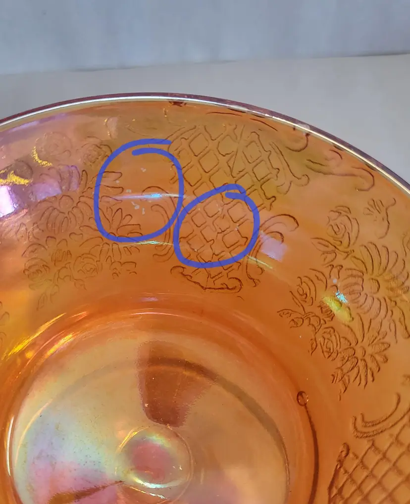 The cups are in great vintage condition. One of them has a bubble in the glass from production and a tiny nick on the base. They have a few small spots where the iridescent finish has worn off. (All shown in pictures)