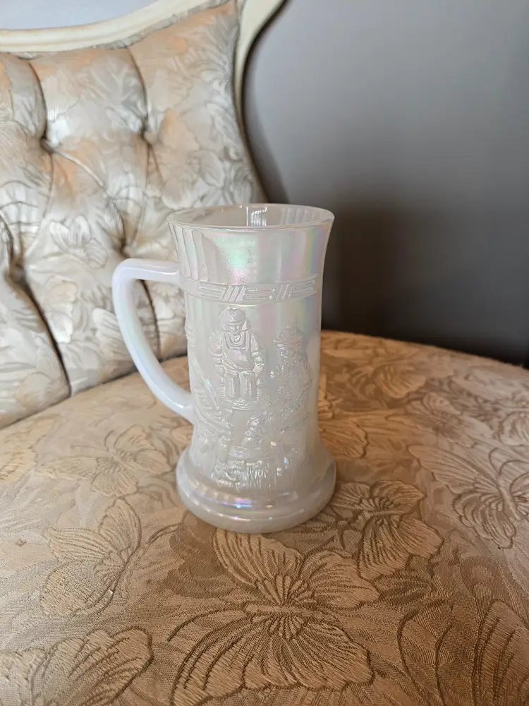 This vintage milk glass beer stein tankard is a perfect addition to any collection. Made by Federal Glass in the 1950s, this mug is a great example of tavern and pub culture. The opaque milk glass adds to the unique look and feel of this piece. The white color and Federal style make it a great decorative item for any home bar or kitchen. This stein is perfect for serving your favorite brew and would make a great gift for any collector or beer enthusiast.