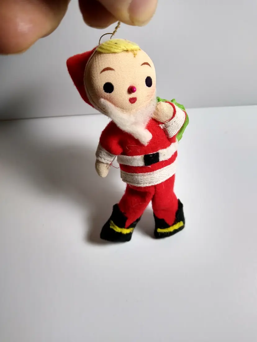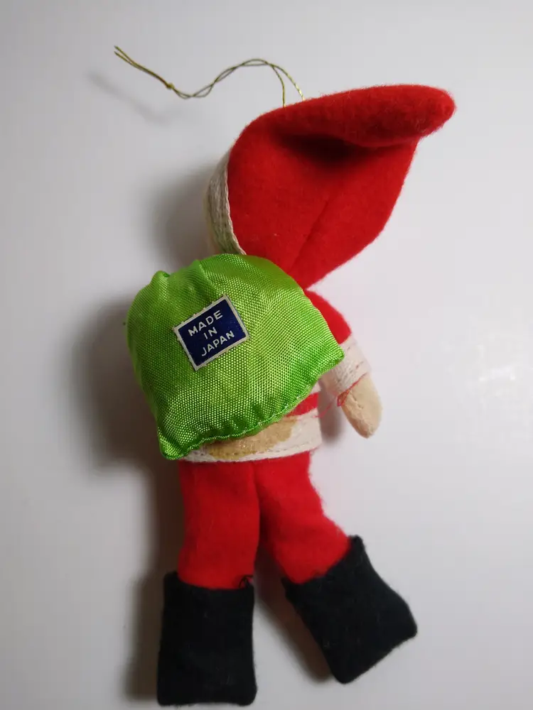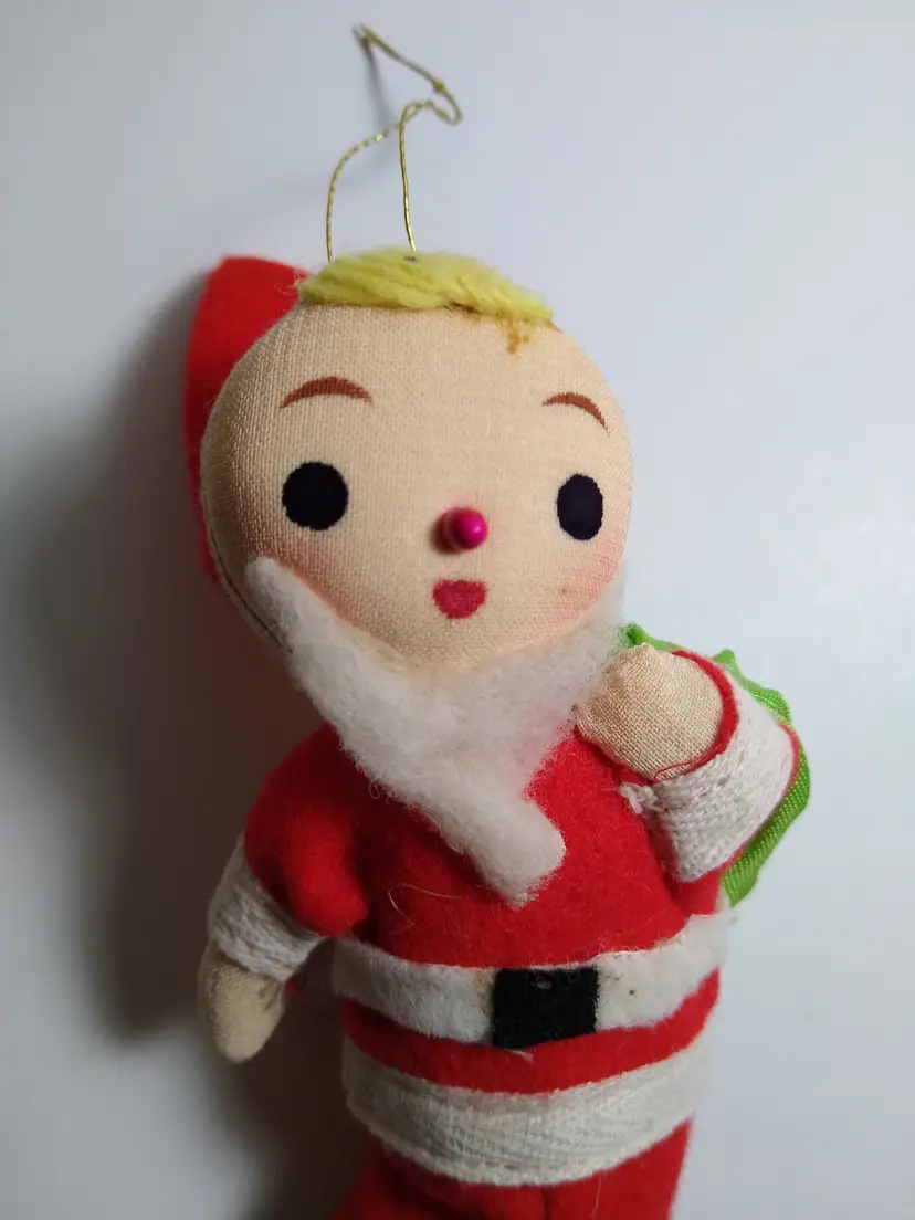Add a touch of nostalgic charm to your holiday decor with this delightful vintage Santa Claus ornament. Crafted from soft felt and fabric, this jolly Santa features a classic red suit with white trim, a fluffy white beard, and a cheerful painted face. He carries a green sack on his back, proudly displaying its 'Made in Japan' label. Perfect for collectors of mid-century Christmas items or anyone looking to bring a timeless festive spirit to their tree or display. This charming piece is in wonderful condition for its age and ready to hang.