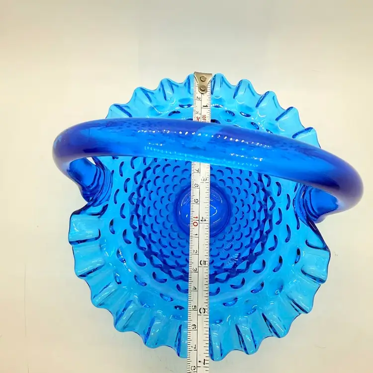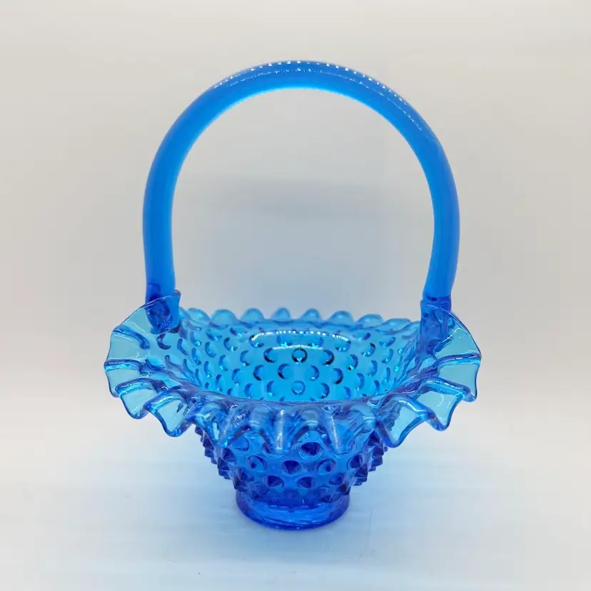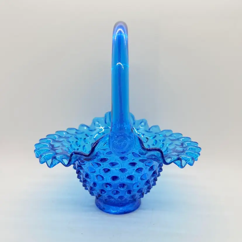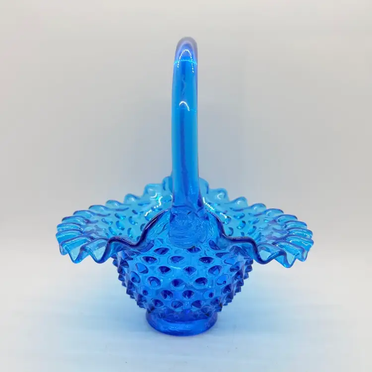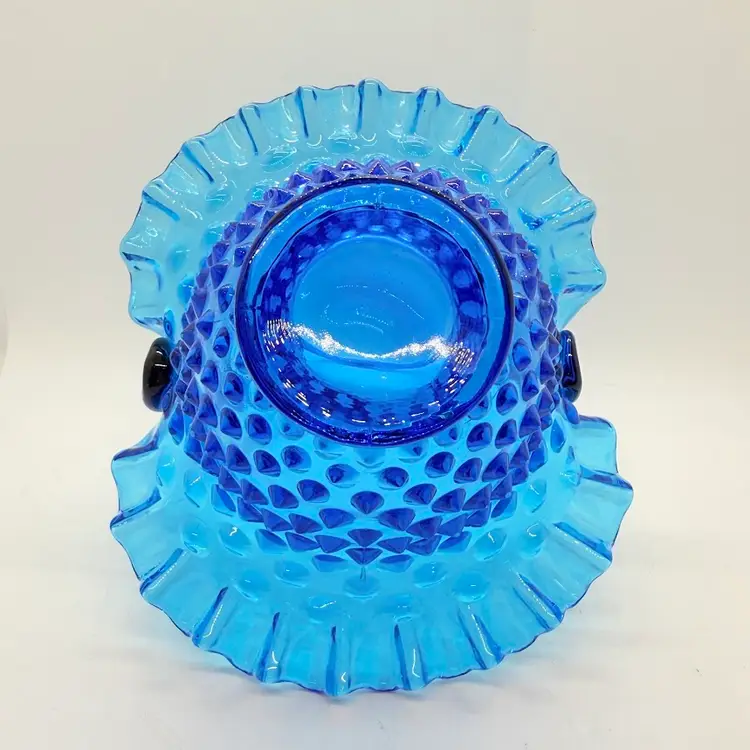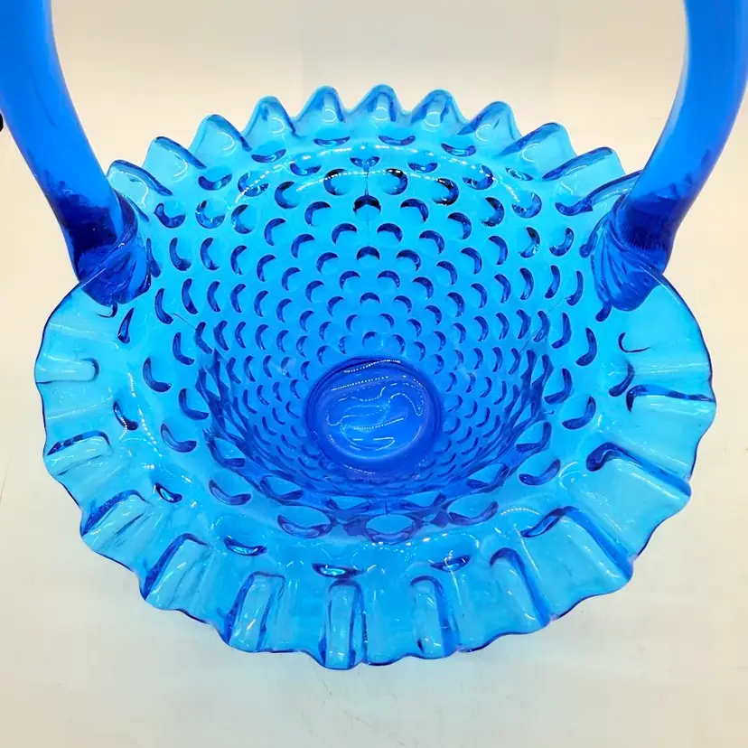 Vintage Fenton 7" Colonial Blue Hobnail Glass Basket Ruffled Edge 1970s. No chips or cracks. Signs of light wear and use. There is an inclusion in the glass on the handle. Please see pictures.