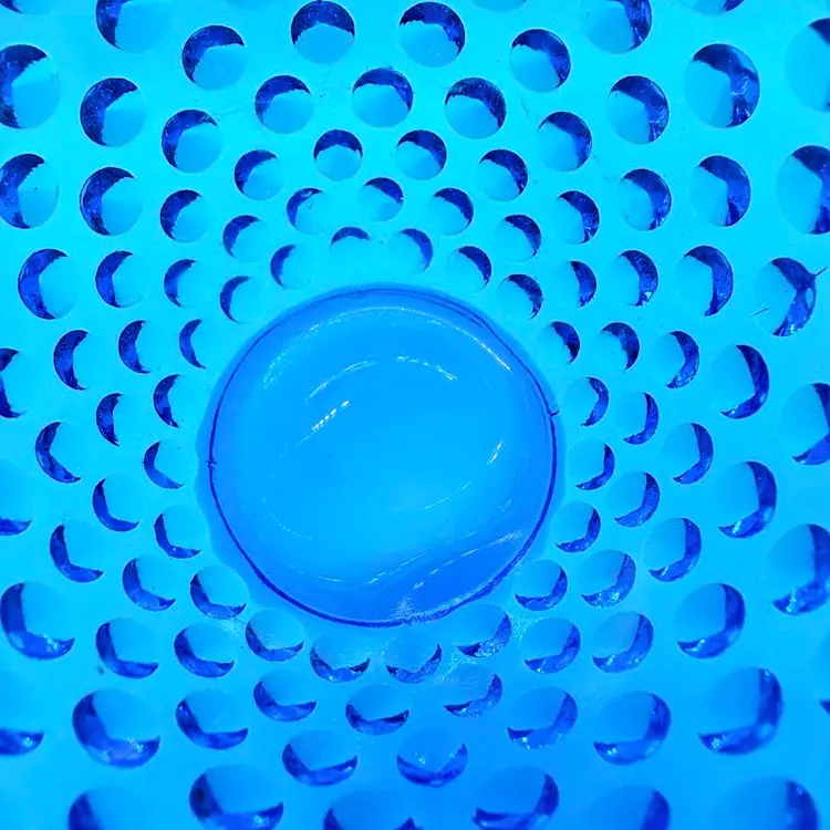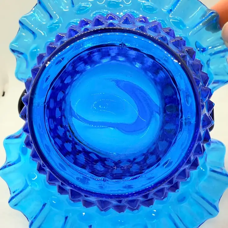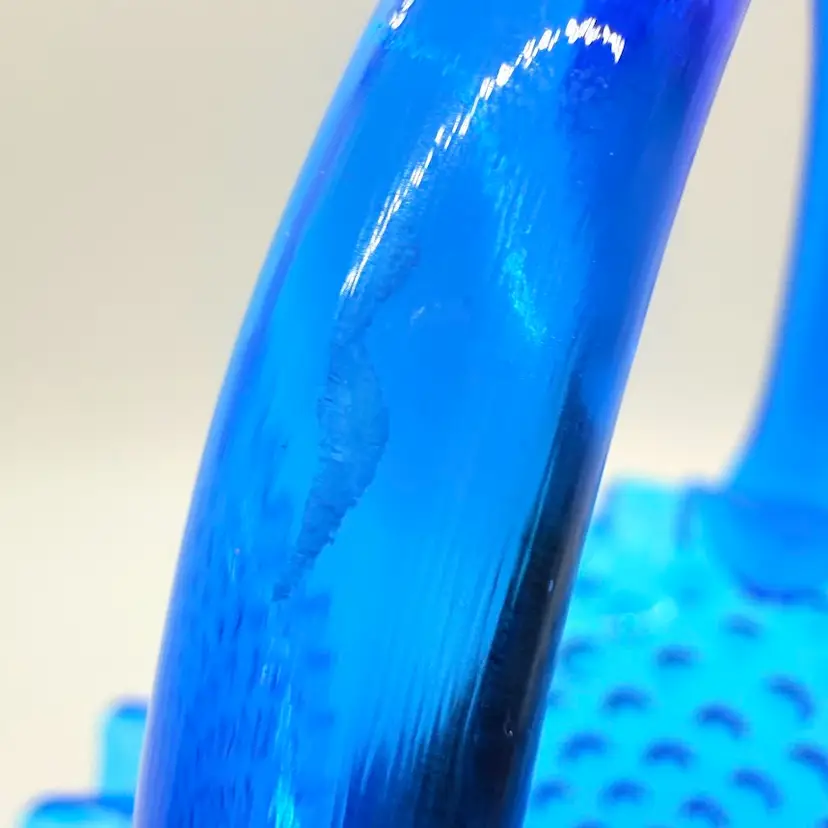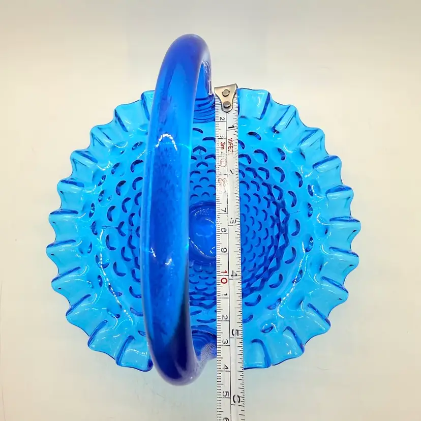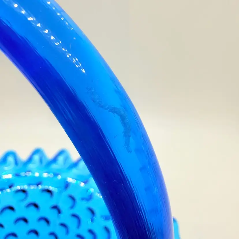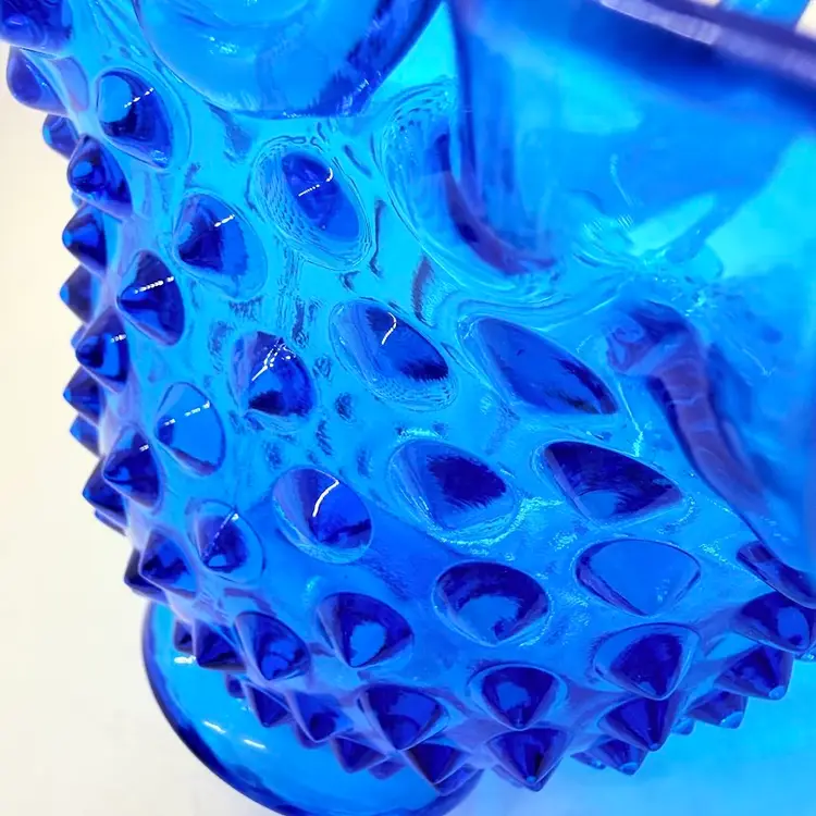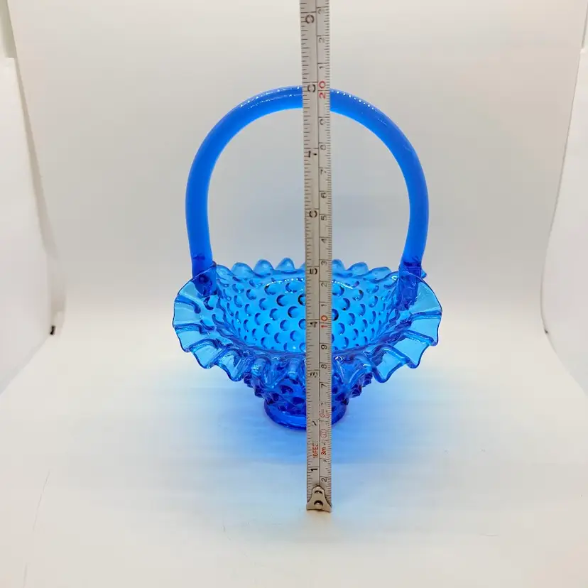Vintage Fenton 7" Colonial Blue Hobnail Glass Basket Ruffled Edge 1970s. No chips or cracks. Signs of light wear and use. There is an inclusion in the glass on the handle. Please see pictures.