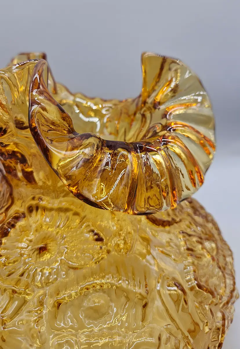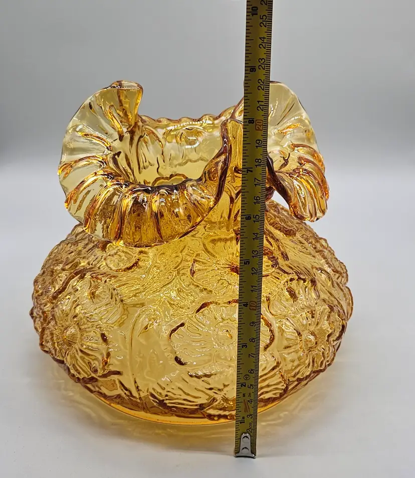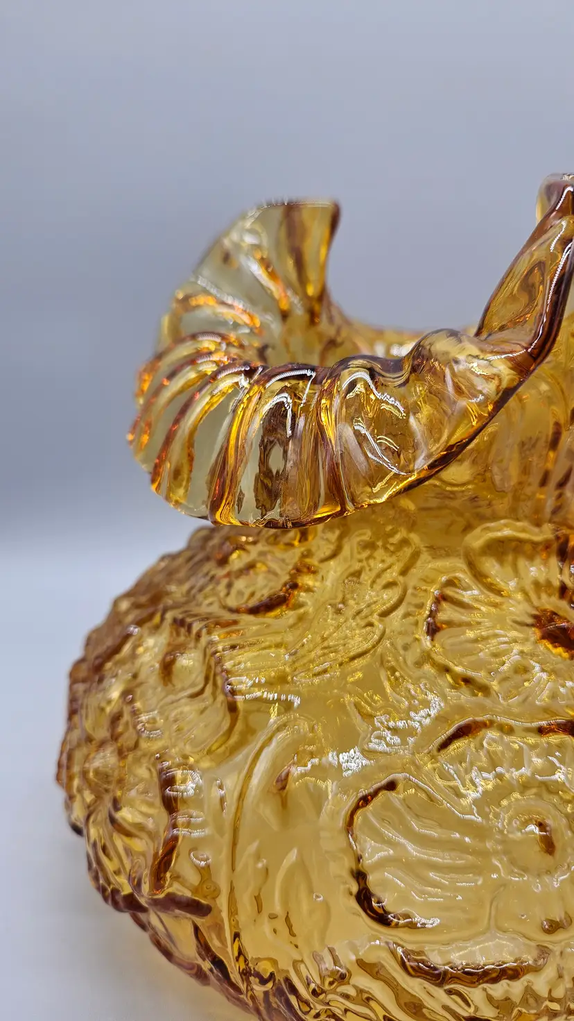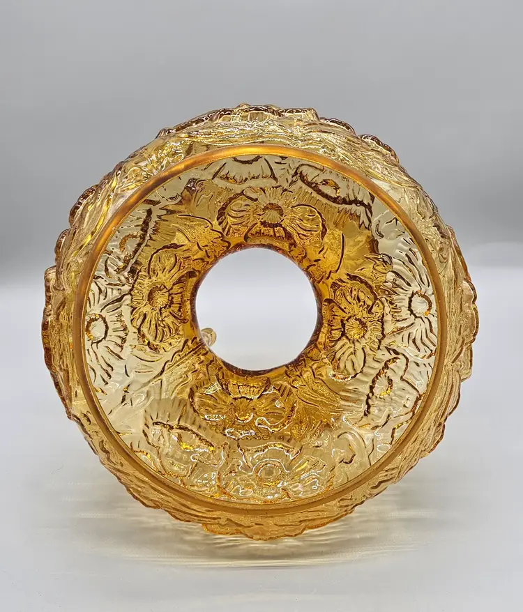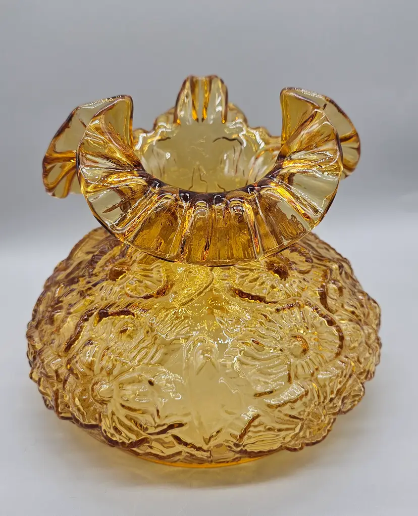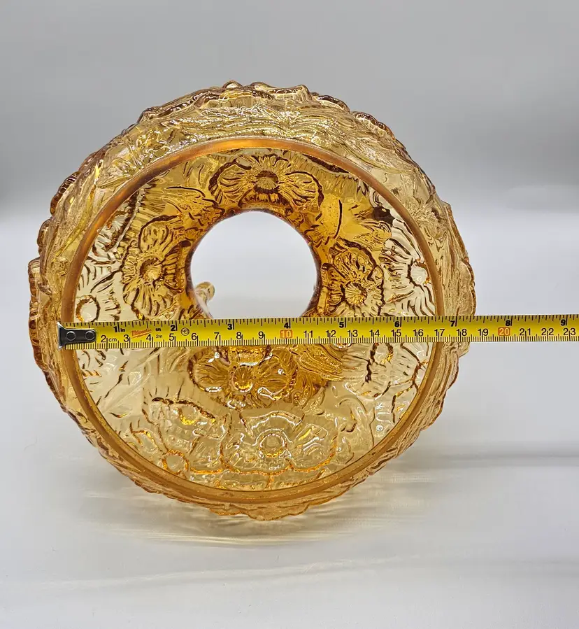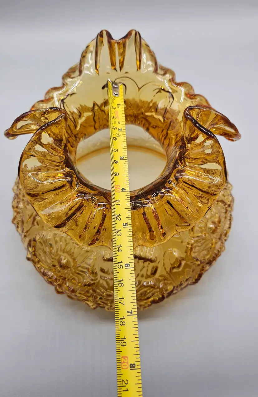 A vintage Fenton Glass Lamp Shade, Amber Colored with a ruffled top and embossed poppy pattern. It measures approximately 8" tall. The bottom is approximately 6 3/4" in diameter and the top opening is approximately 4" wide. There are a few some flea bite sized chips on on the bottom rim that inserts into a lamp so wouldn't. It is in Excellent Pre-owned condition, showing minimal wear from age and previous use. There are no breaks, no cracks.
