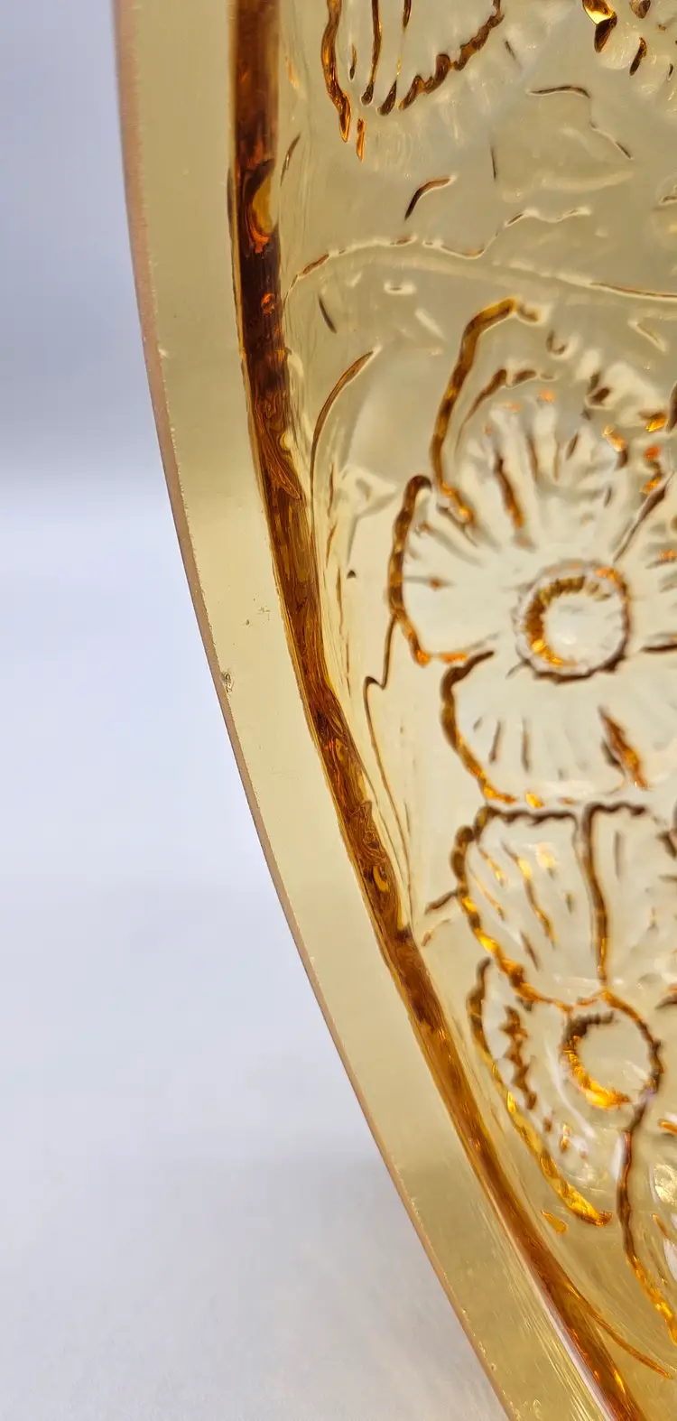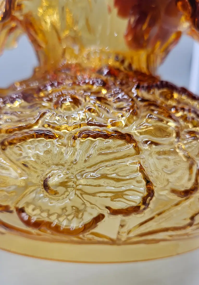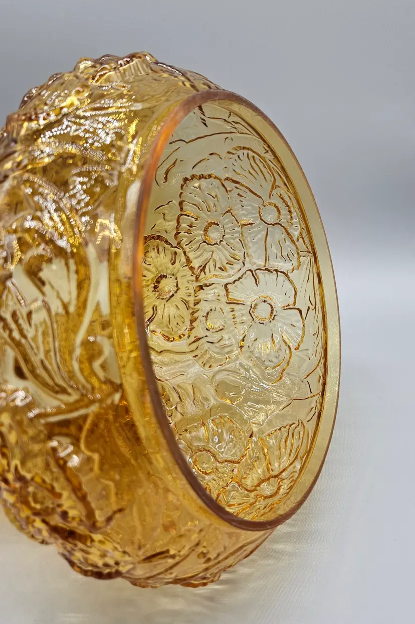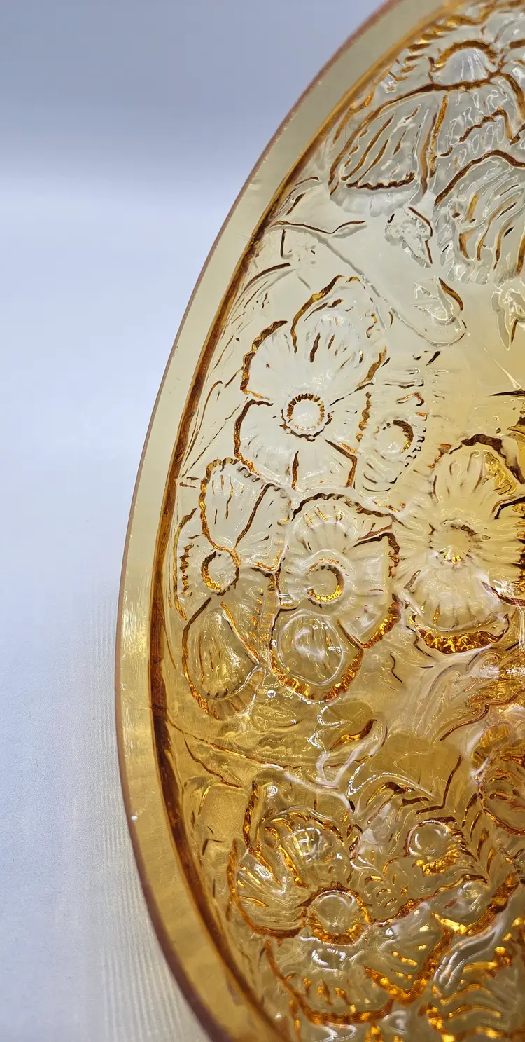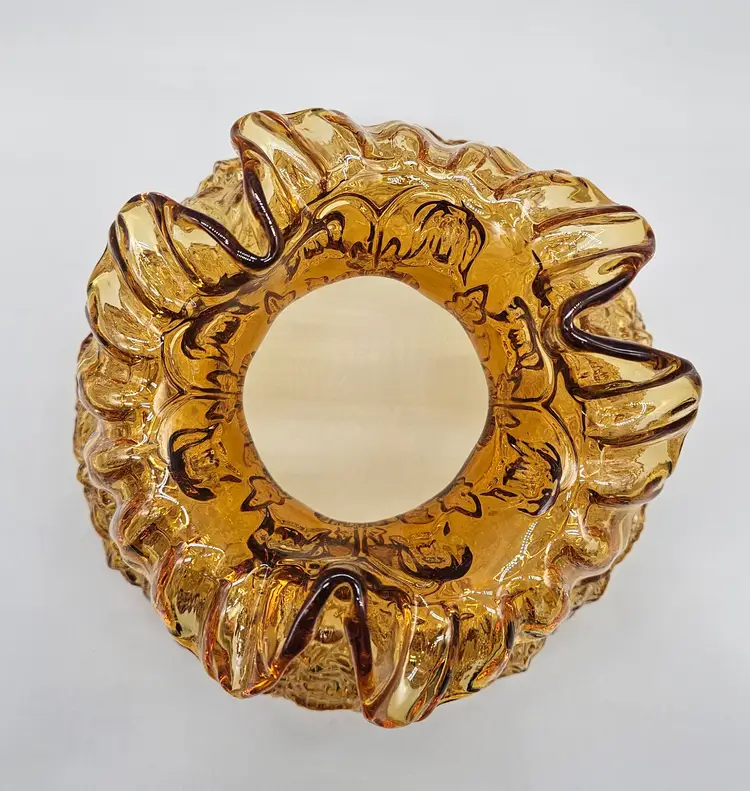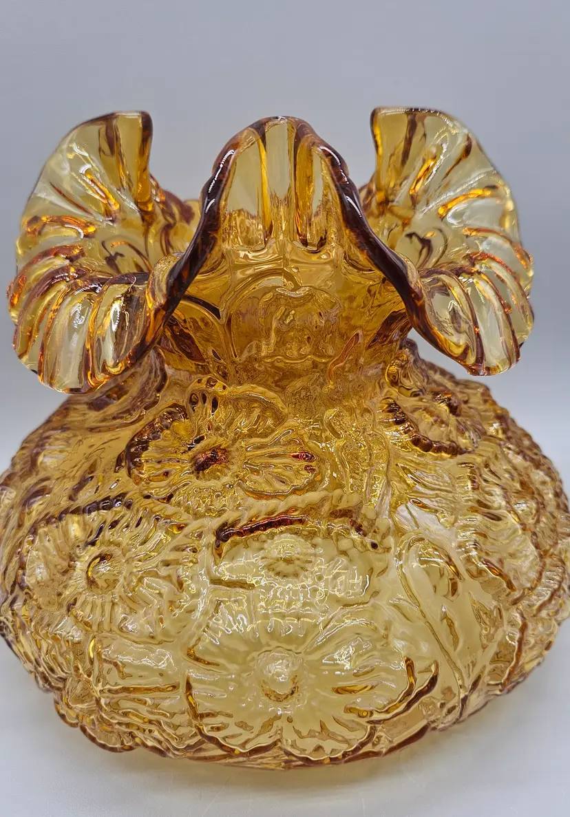 A vintage Fenton Glass Lamp Shade, Amber Colored with a ruffled top and embossed poppy pattern. It measures approximately 8" tall. The bottom is approximately 6 3/4" in diameter and the top opening is approximately 4" wide. There are a few some flea bite sized chips on on the bottom rim that inserts into a lamp so wouldn't. It is in Excellent Pre-owned condition, showing minimal wear from age and previous use. There are no breaks, no cracks.
