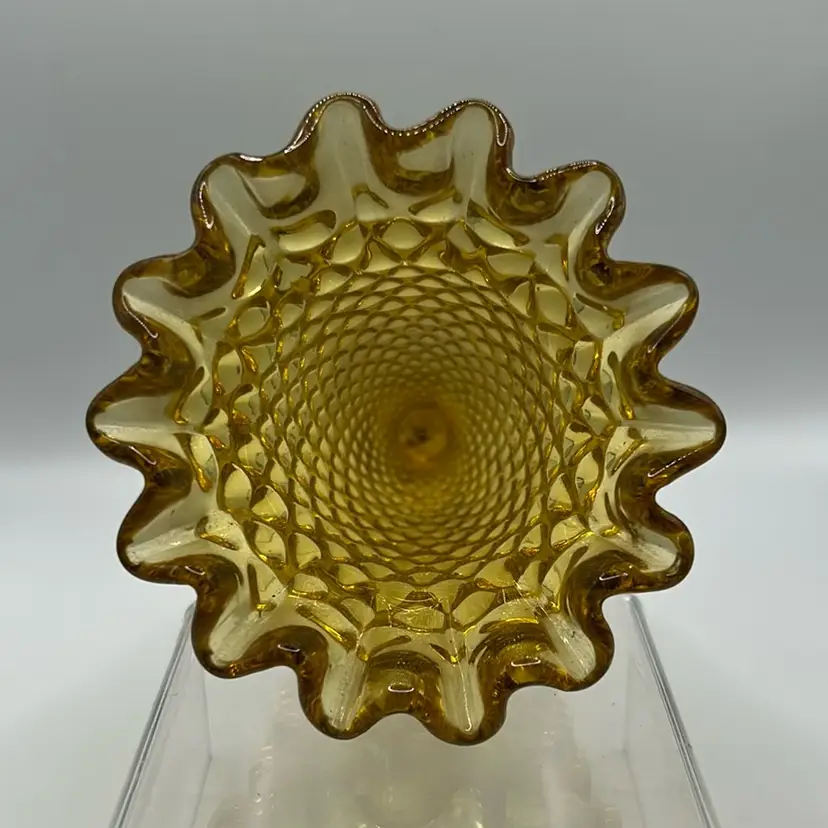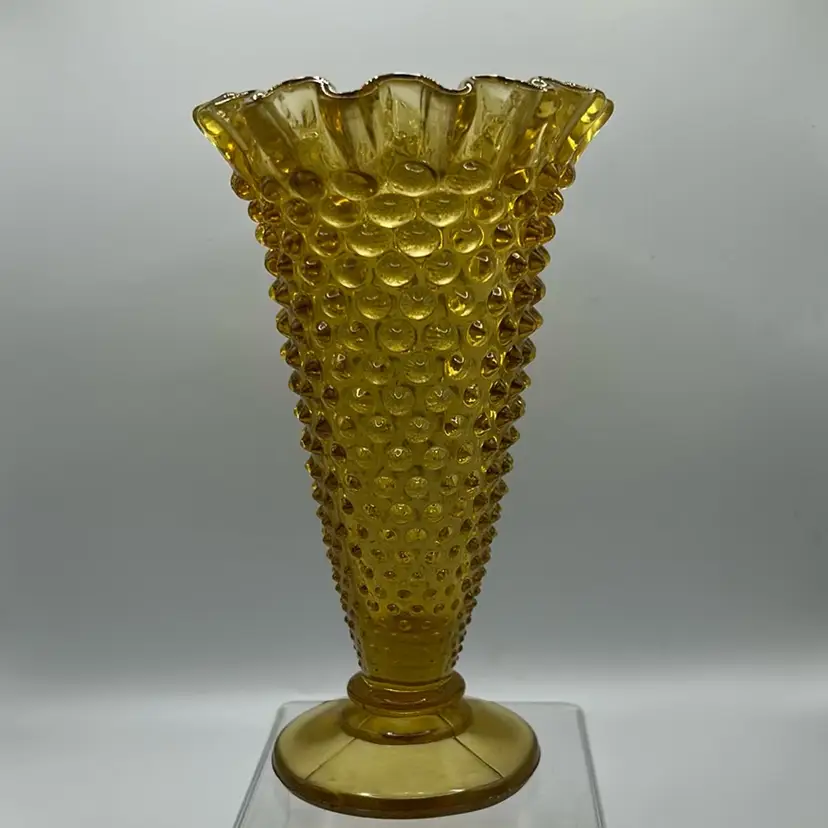 This page is in it MCM Fenton art glass vase in a hobnail pattern it has a ruffled rim and a bulbus texture. It stands just over 6 inches tall and 3.5 inches across. There are chips or cracks.