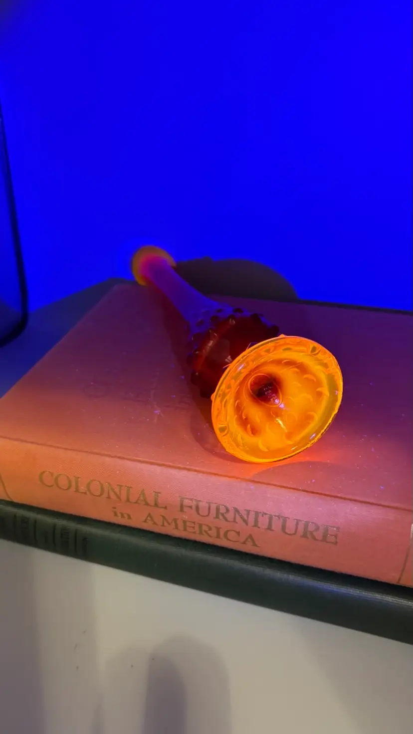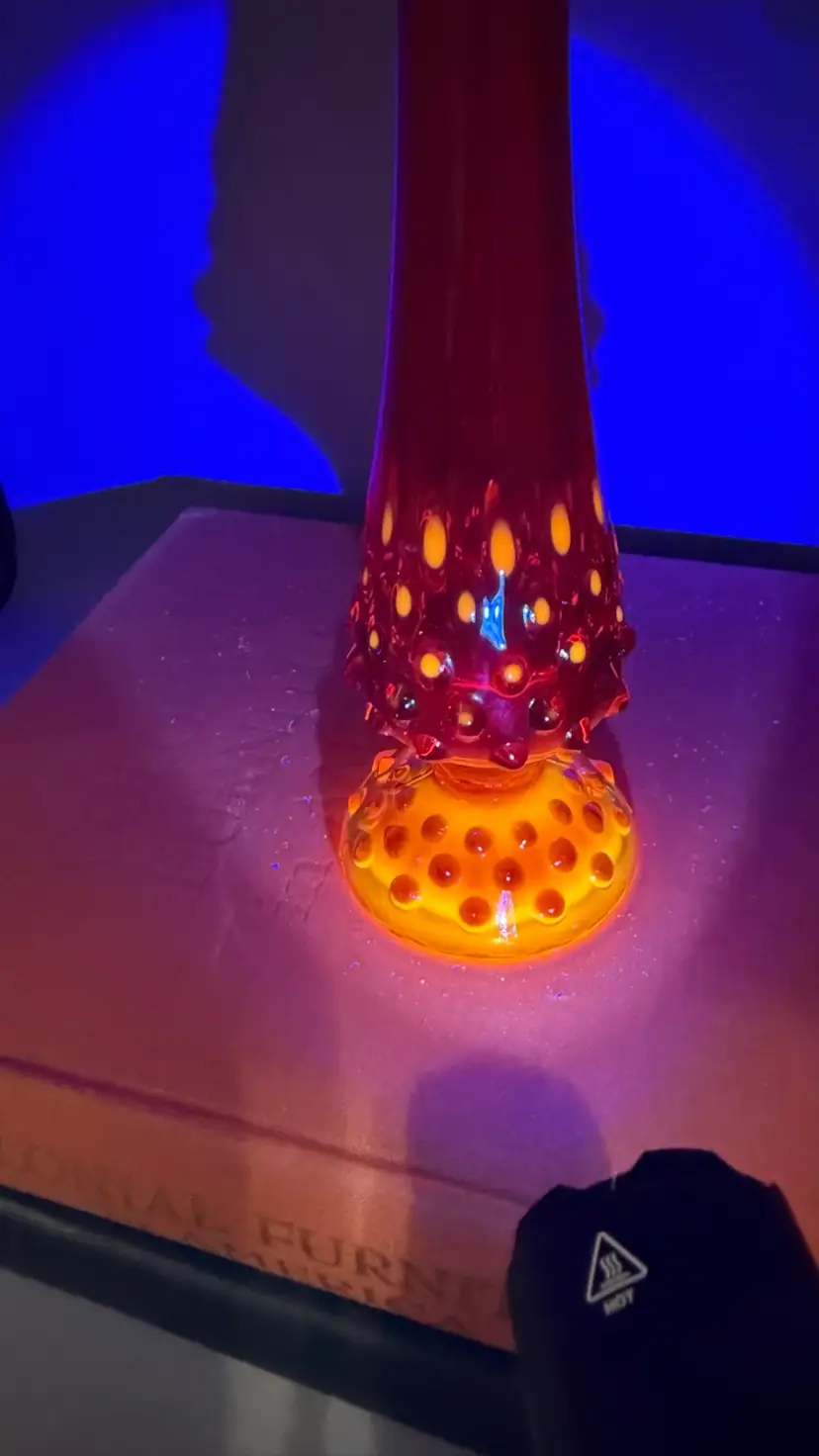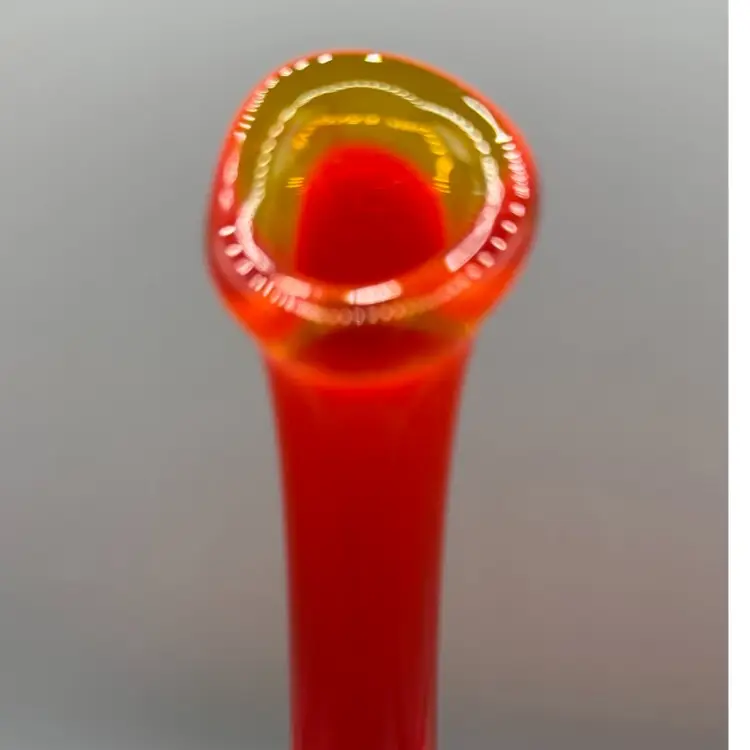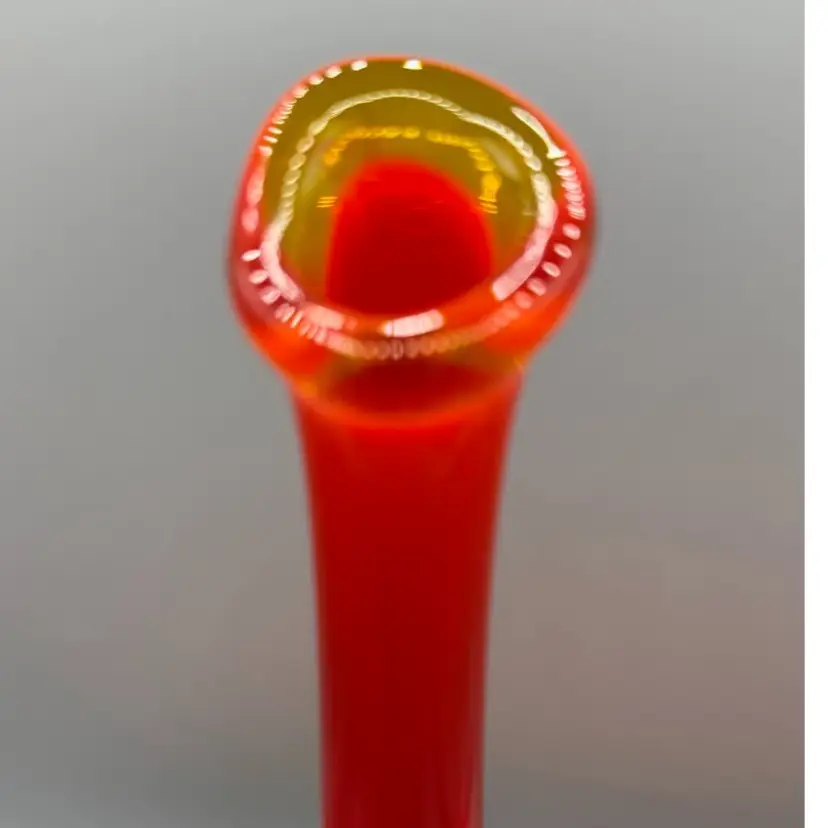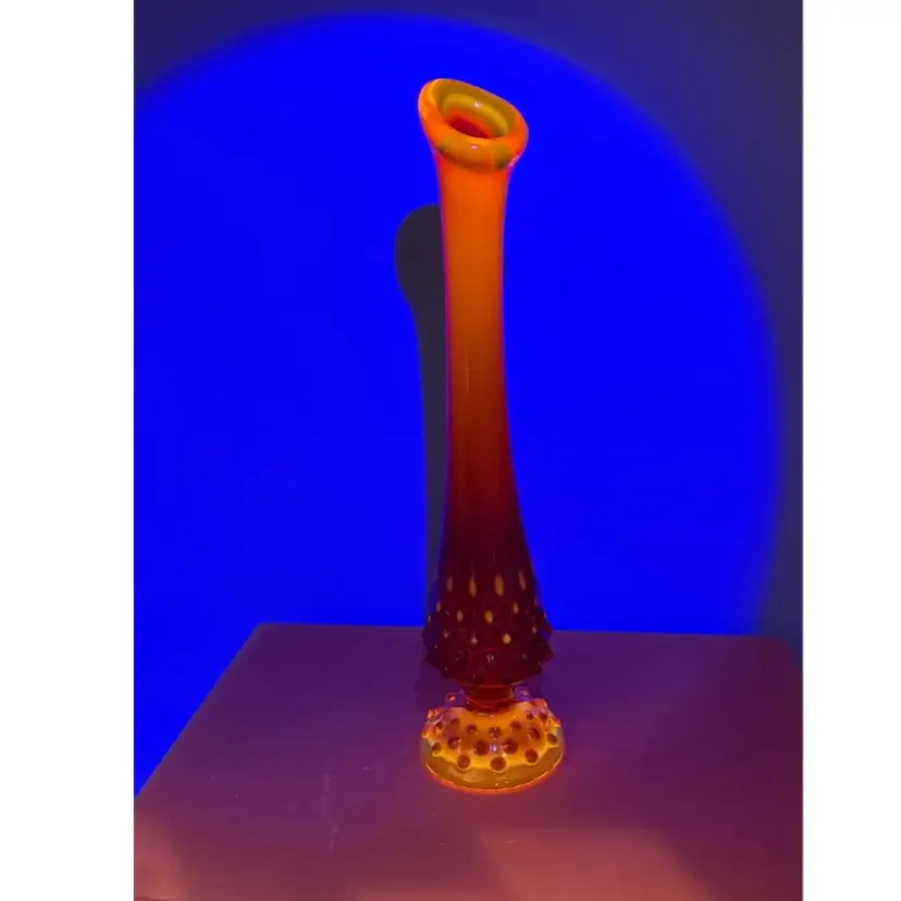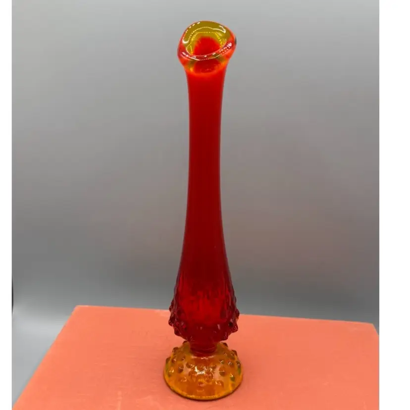 MCM Fenton Art Glass vase has a vibrant Amberina colorway, transitioning from a deep ruby red at the top to a bright orange/yellow base. It is designed in the classic Hobnail pattern with a hand-stretched "swung" smooth neck. Excellent condition no chips or cracks