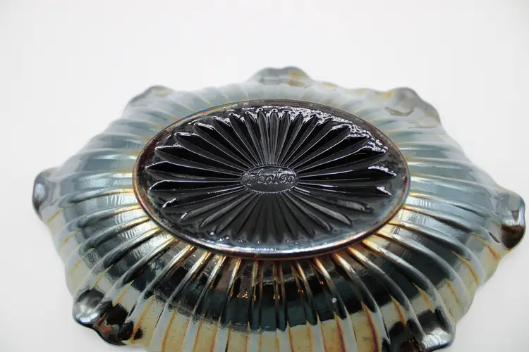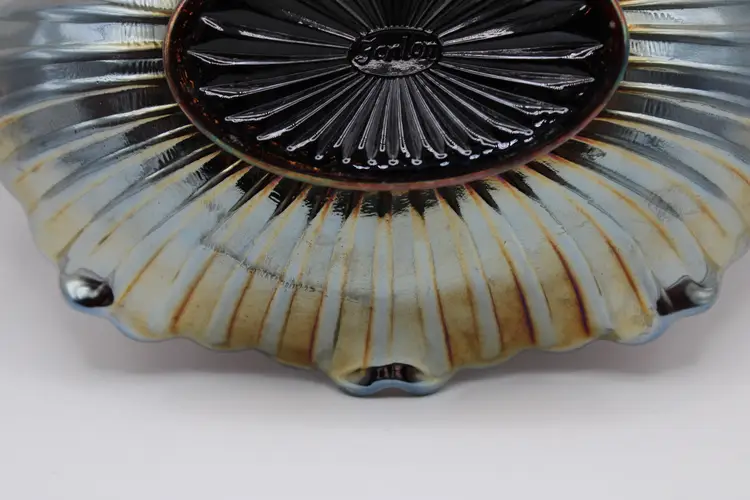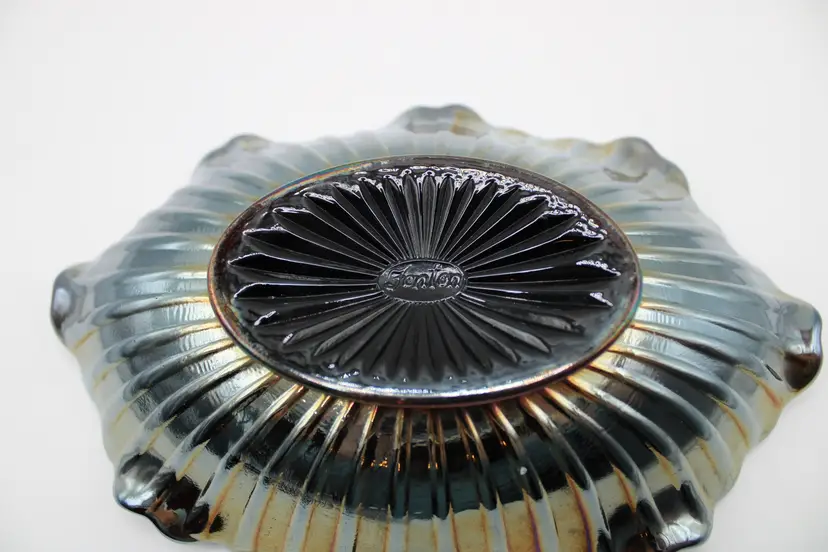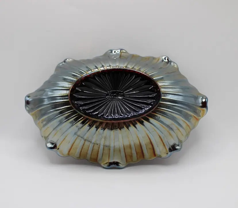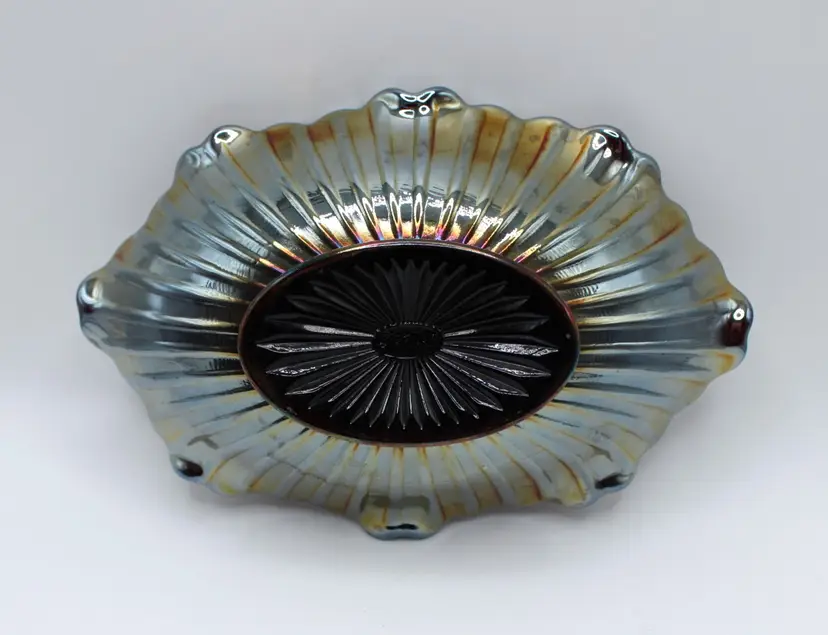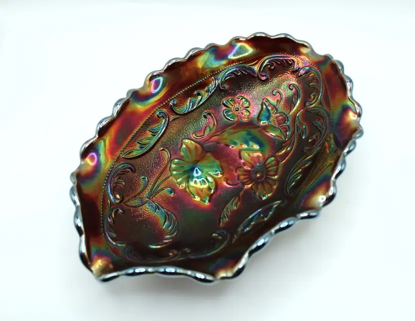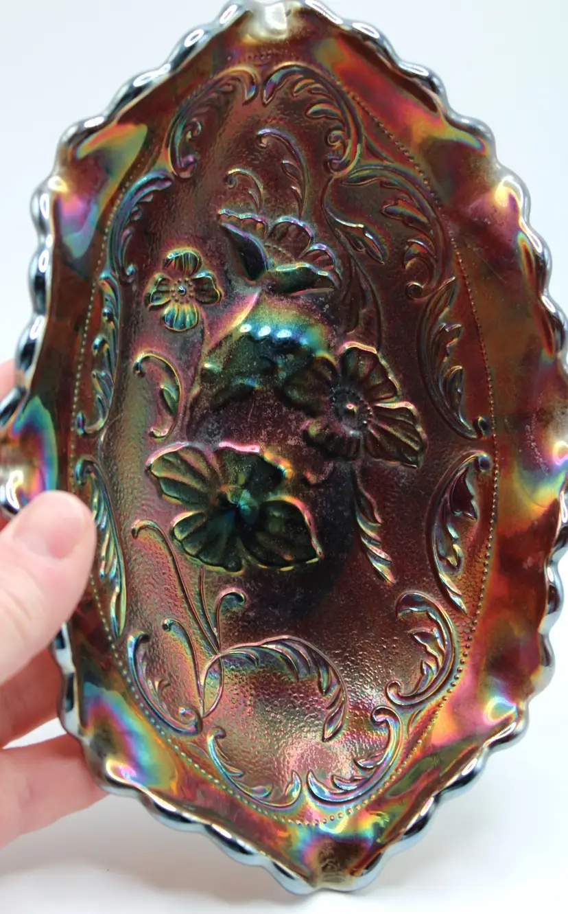 Lovely vintage Fenton amethyst carnival oval glass pickle/relish dish in poppy pattern. Oval 7 5/8" x 5" x 2" bowl, embossed Fenton mark inside an oval, indicates production in the 1970's. No chips or cracks. Some surface wear to bottom commensurate with age/use.