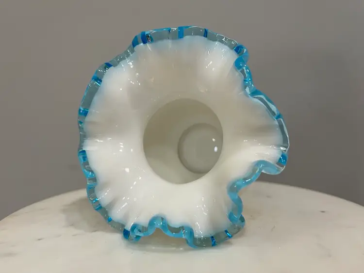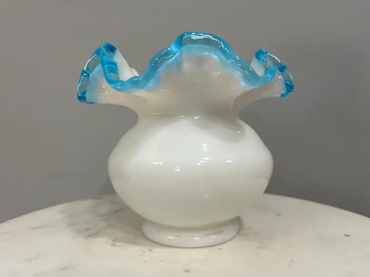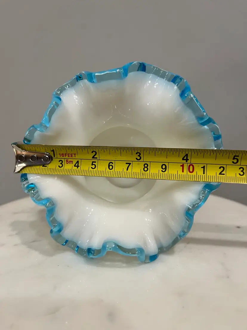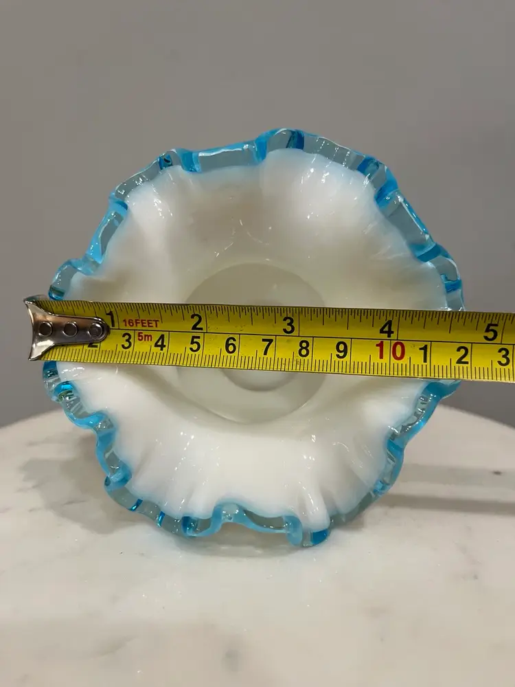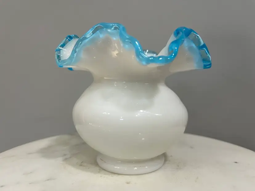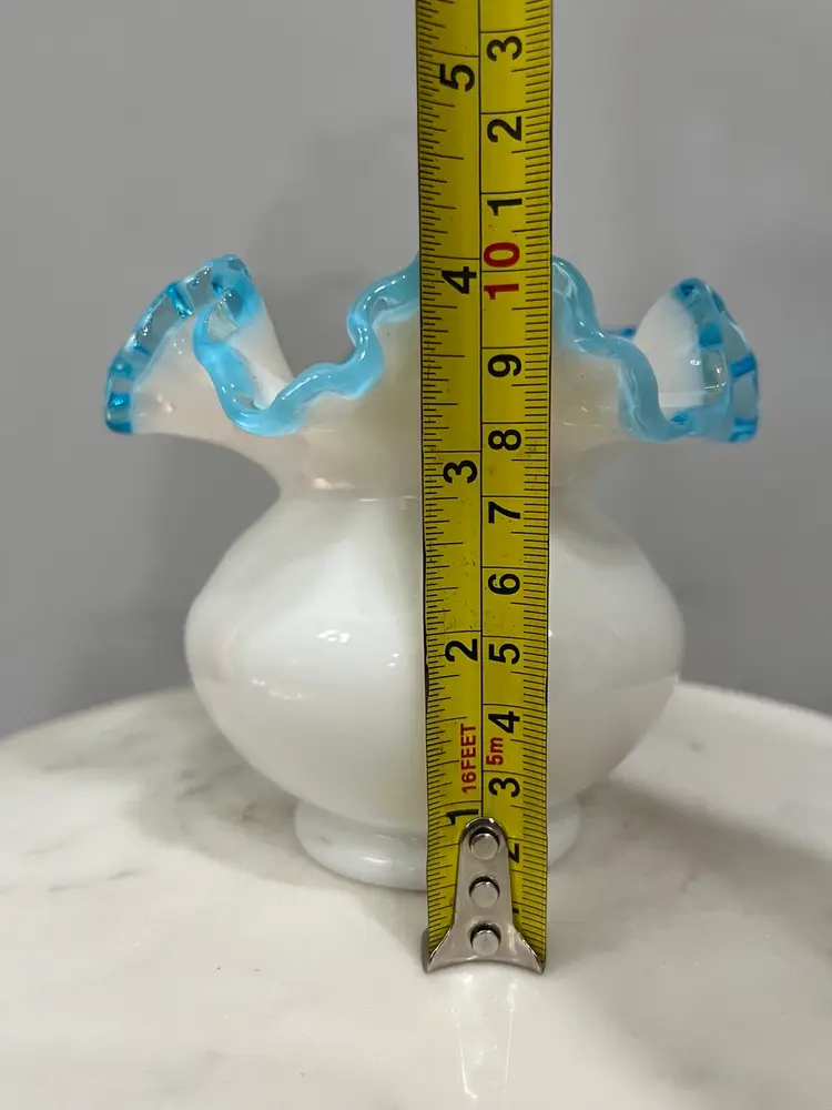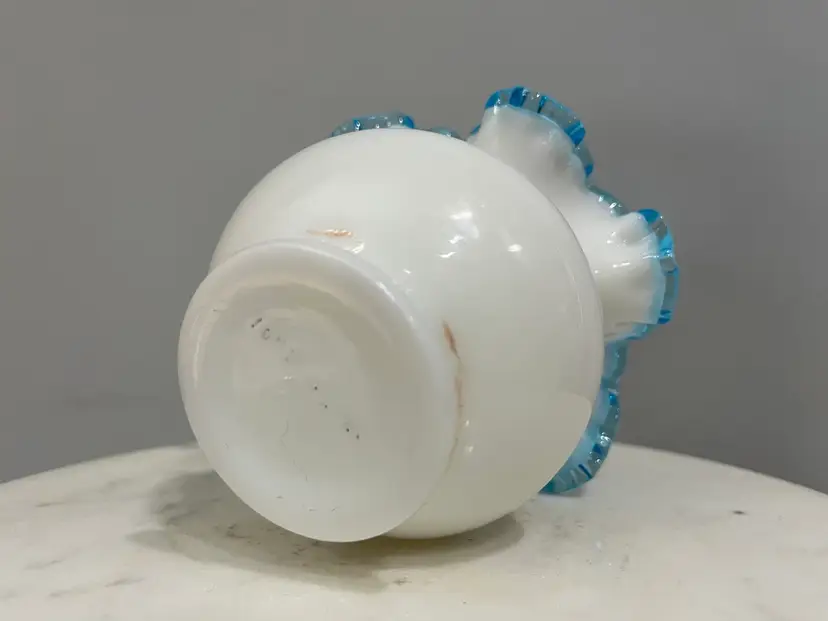 No chips or cracks. There is discoloration on the inside bottom and the outside bottom of the vase as shown. Approximate measurements can be found within the photos. Message me with any questions.