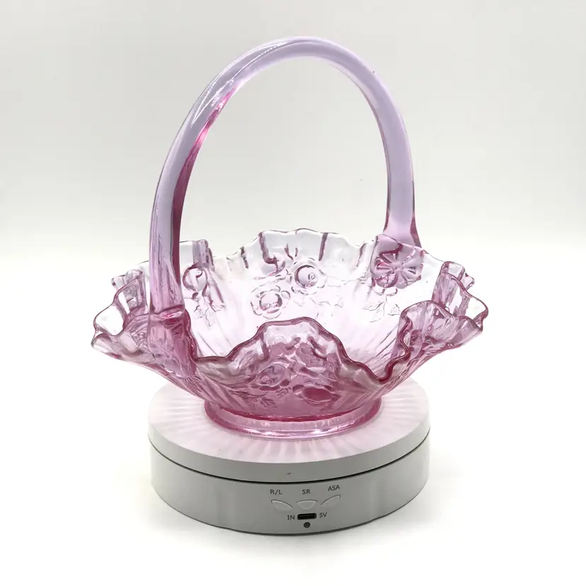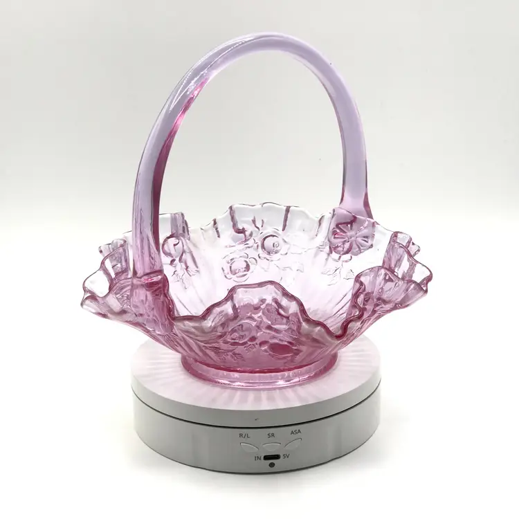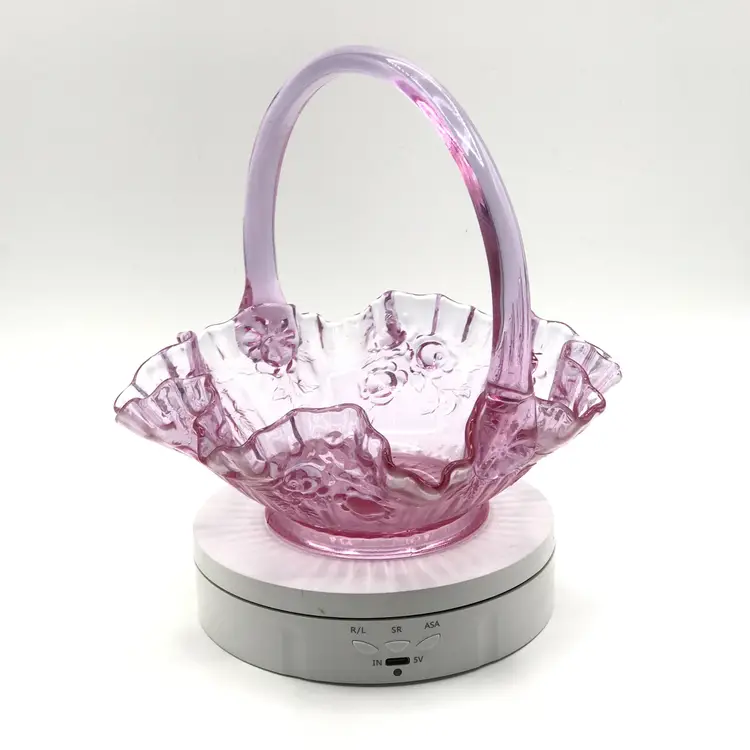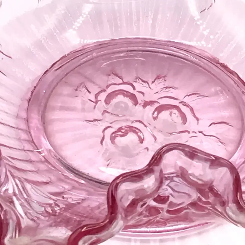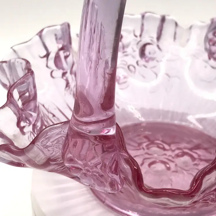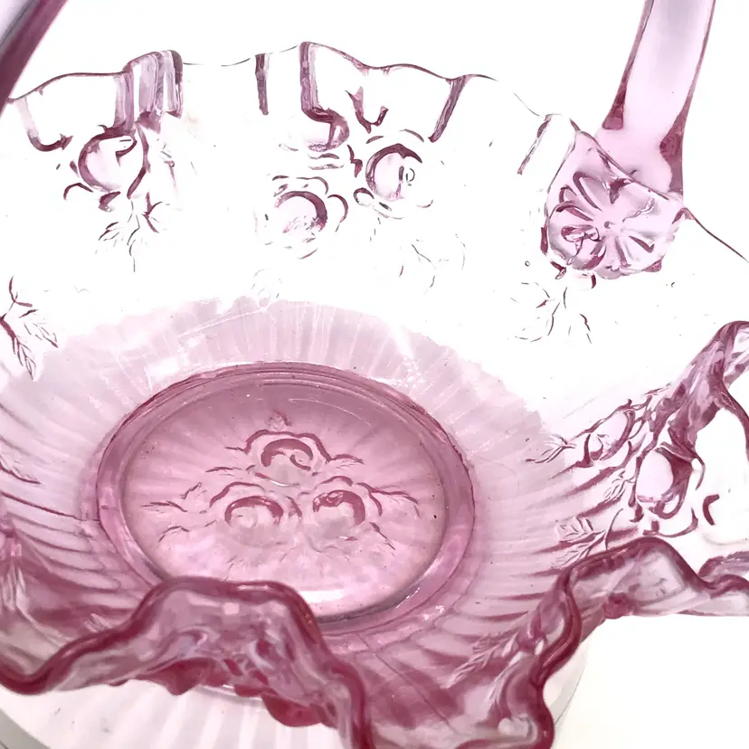 The Vintage Fenton Art Glass Cabbage Rose Basket from 1967 is a beautiful collector's item. This elegant piece features a delicate cabbage rose pattern and a ruffled edge, all in a lovely dusty rose pink color. Handcrafted with attention to detail, this basket showcases the exquisite craftsmanship Fenton is known for, making it a charming addition to any vintage glass collection.