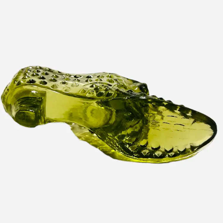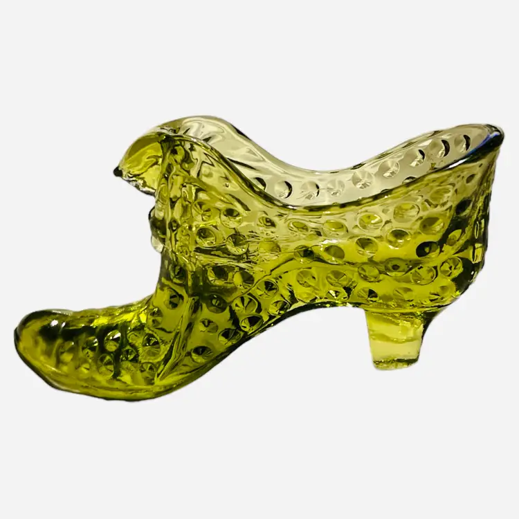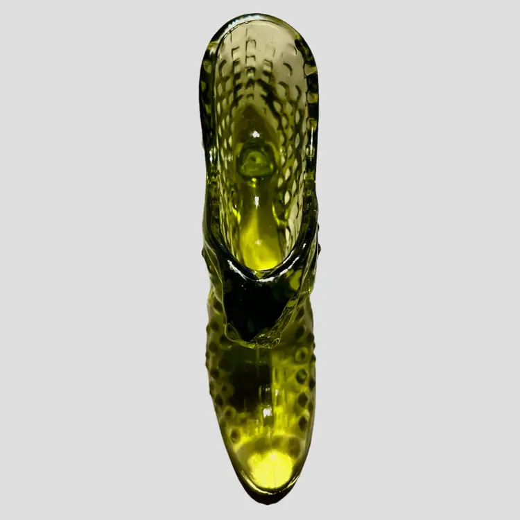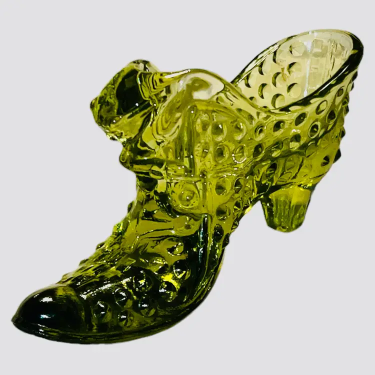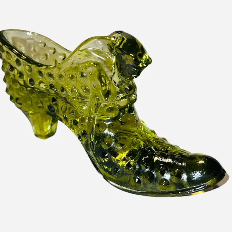 Add a touch of elegance to your collection with this vintage Fenton Art Glass figurine. This olive green hobnail shoe slipper features a cat head design and a heel boot style. Made with fused glass production technique, this art glass piece is a perfect addition to any Victorian-themed decor. The shoe is 6 inches long, 3 inches high, and 1.5 inches wide, making it a perfect decorative piece for your shelves or display case.