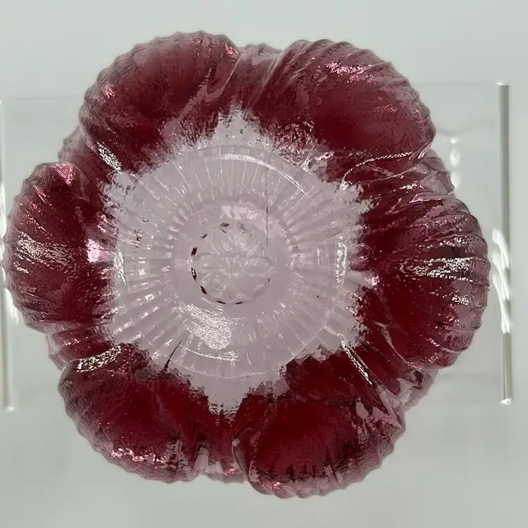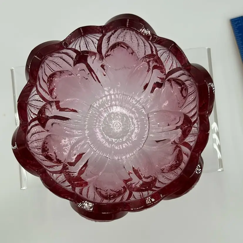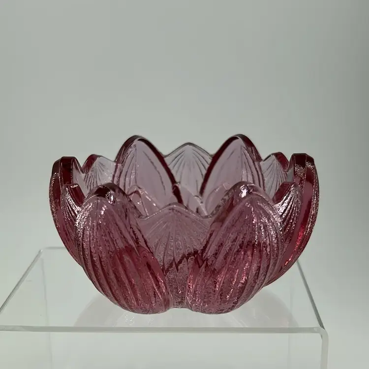 This item is a Fenton glass cranberry tulip leaf load of candle holder. It stands 2 inches tall and 4 inches across an excellent condition. No chips no cracks.