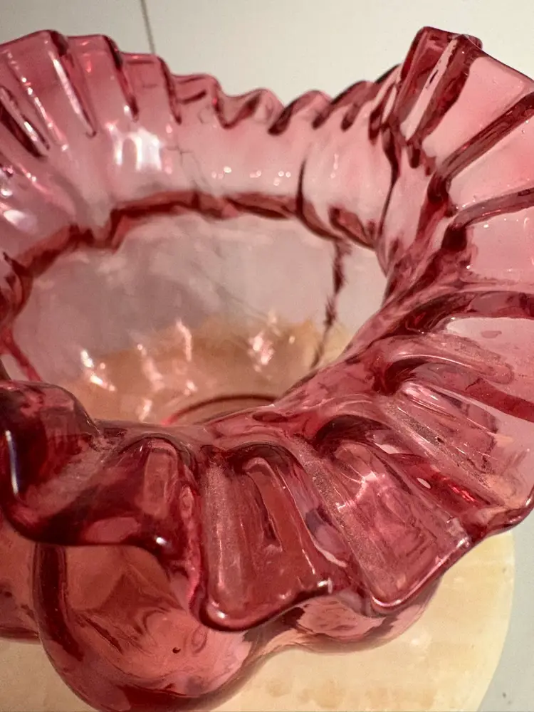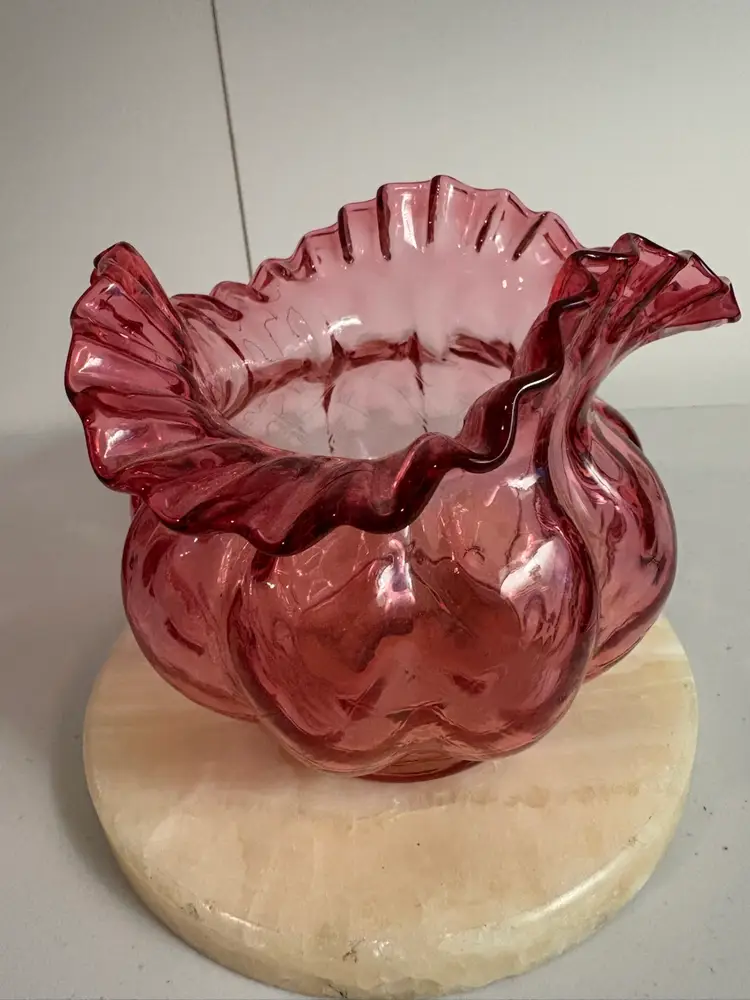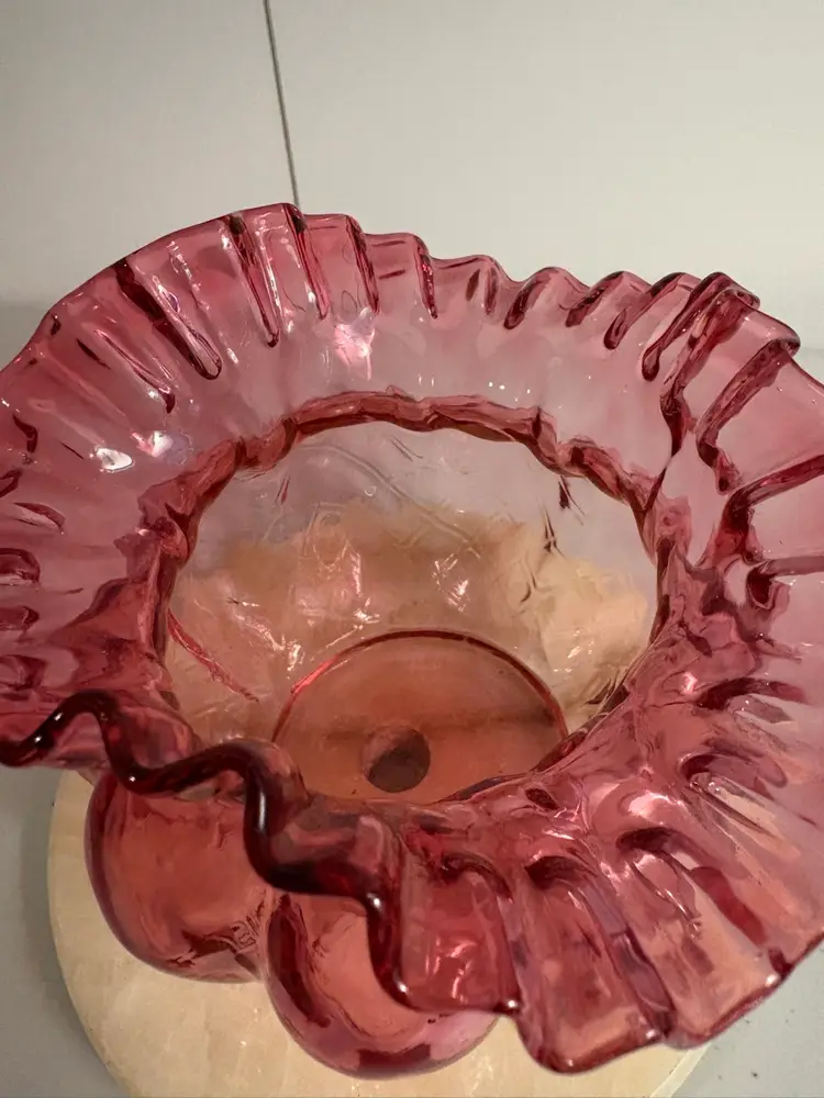 Lovely vase for Valentine’s Day. Pretty cranberry Fenton ruffled edge art glass vase.