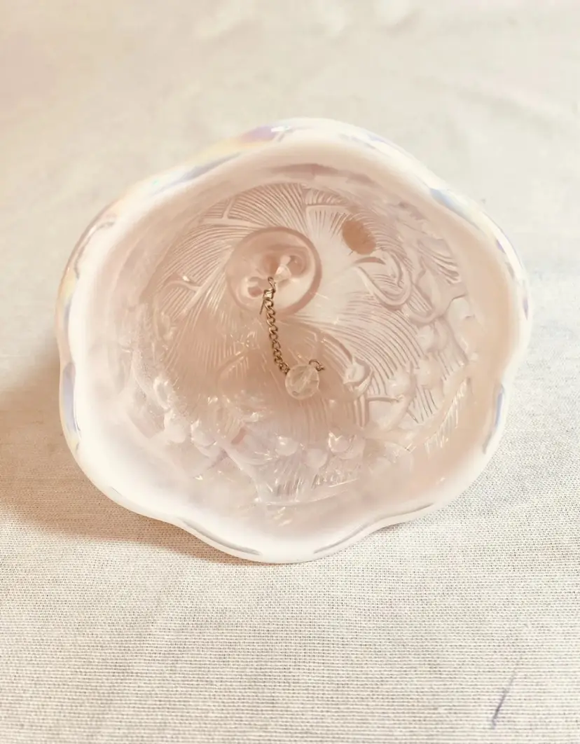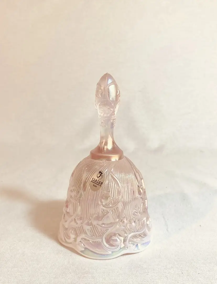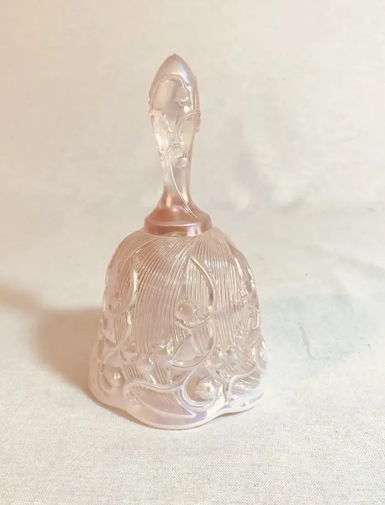 This beautiful vintage Fenton Art pink opalescent glass bell features a stunning Lily of the Valley pattern 1970-1979. Standing at 6.5 inches tall with a base diameter of 3.5 inches, no chips, cracks or repairs.