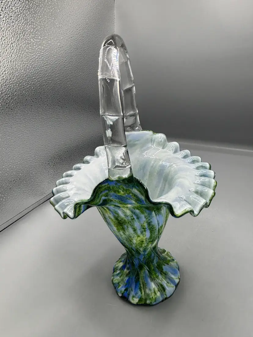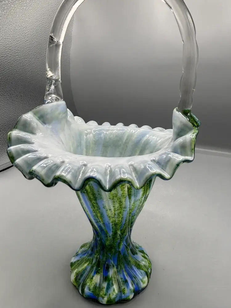 This exquisite Fenton piece showcases the coveted Aventurine green hue paired with striking blue accents, a hallmark of mid-century glasswork. The segmented handle demonstrates the craftsmanship characteristic of Fenton's production era. A refined addition for serious collectors of vintage art glass.