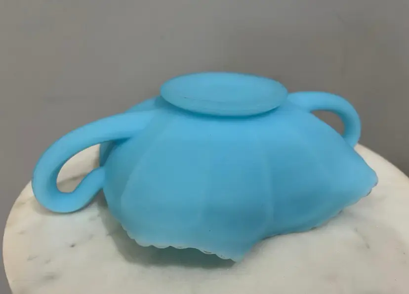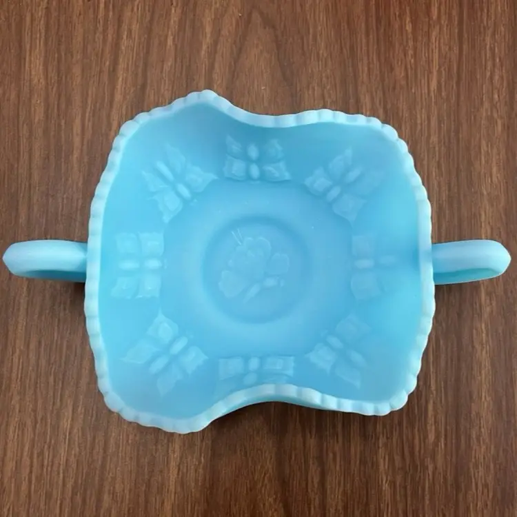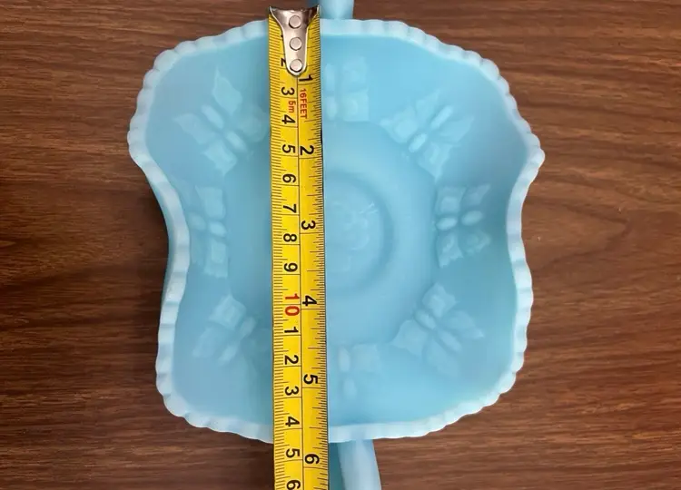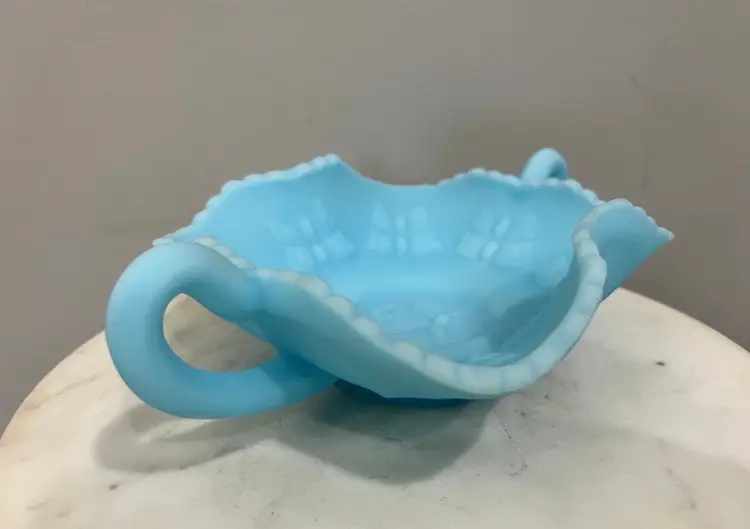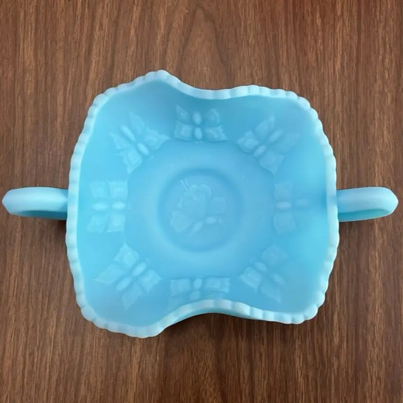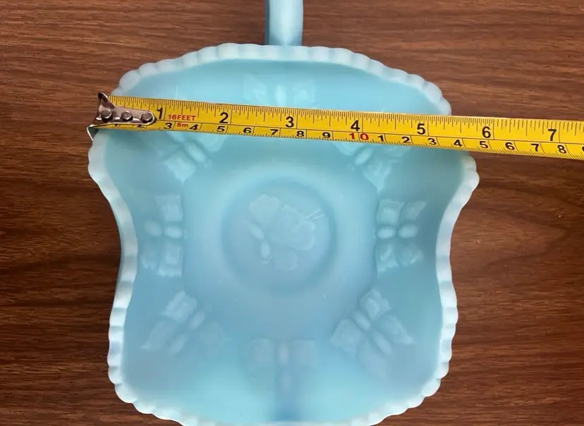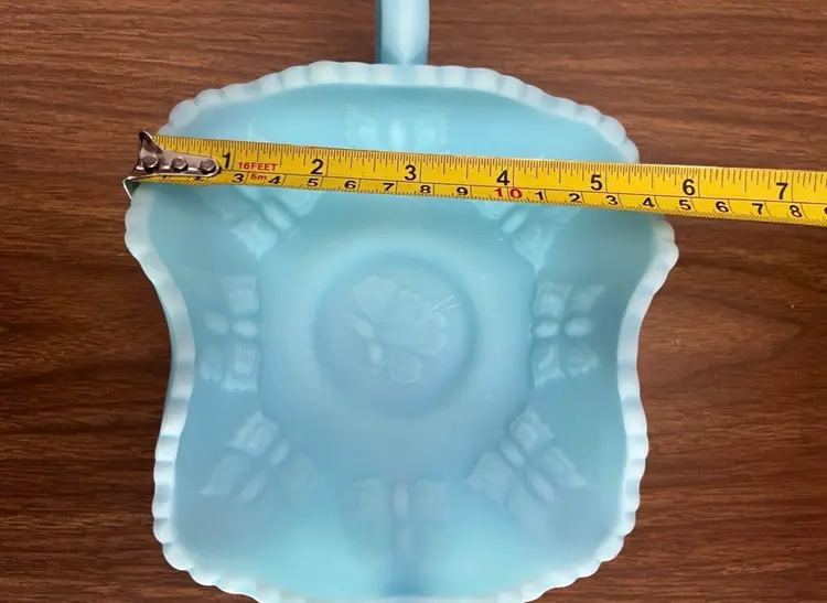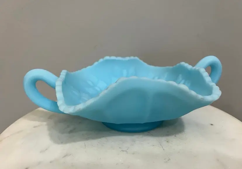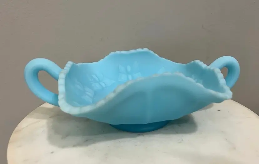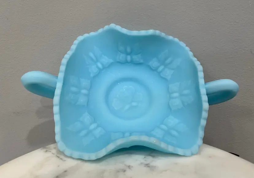 Good preowned condition with no chips or cracks. Some areas of discoloration to the satin finish as shown. Measures approximately 2.75” tall and 8.25” wide including the handles. Message me with any questions.