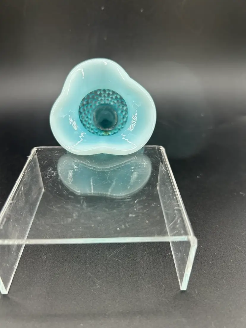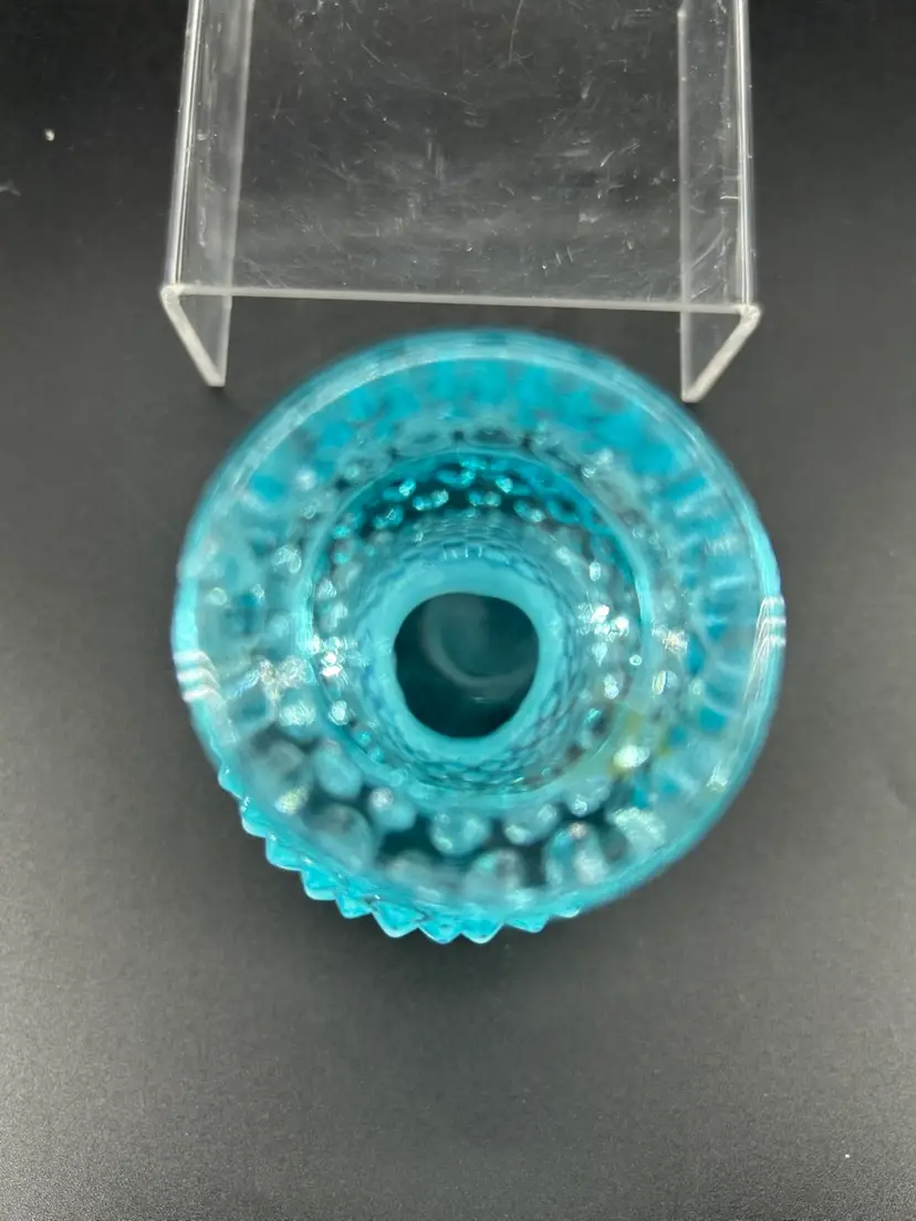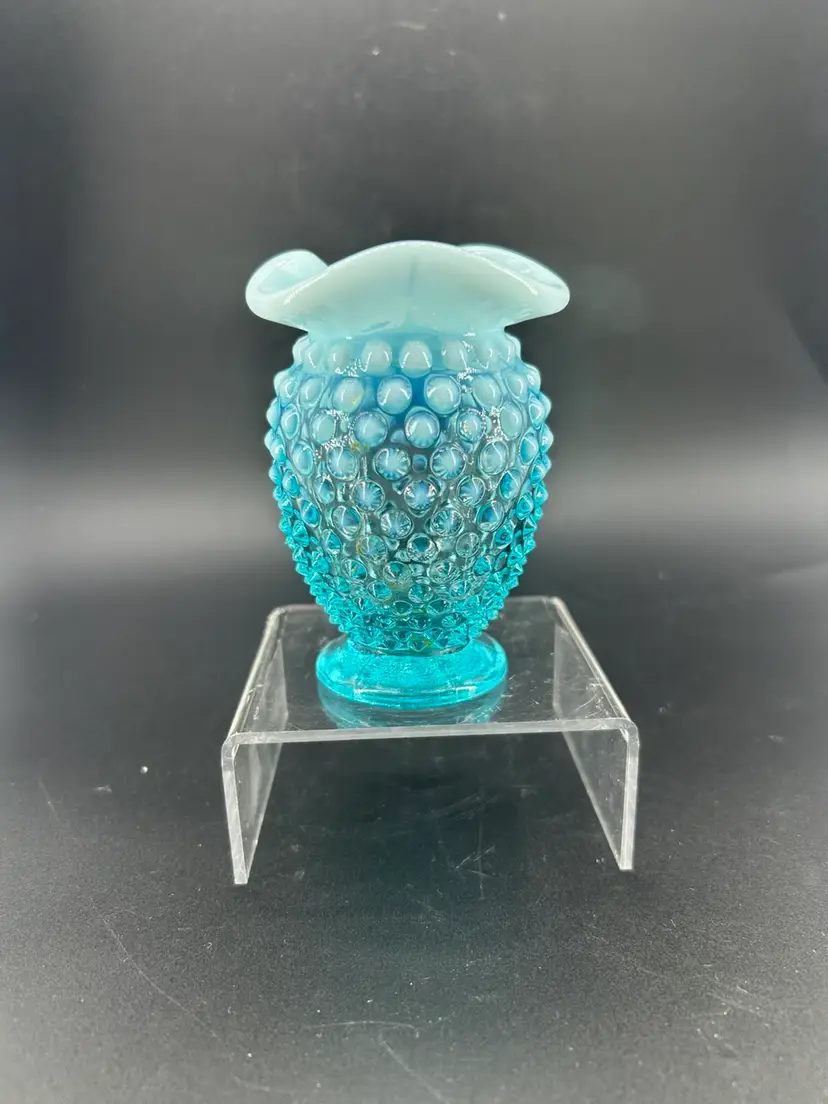 The hobnail pattern, characterized by raised glass studs, was a signature design for Fenton. It was often combined with opalescent glass which gives a milky, translucent appearance This piece is associated with the mid-20th century. It measures 3.5 inches tall.