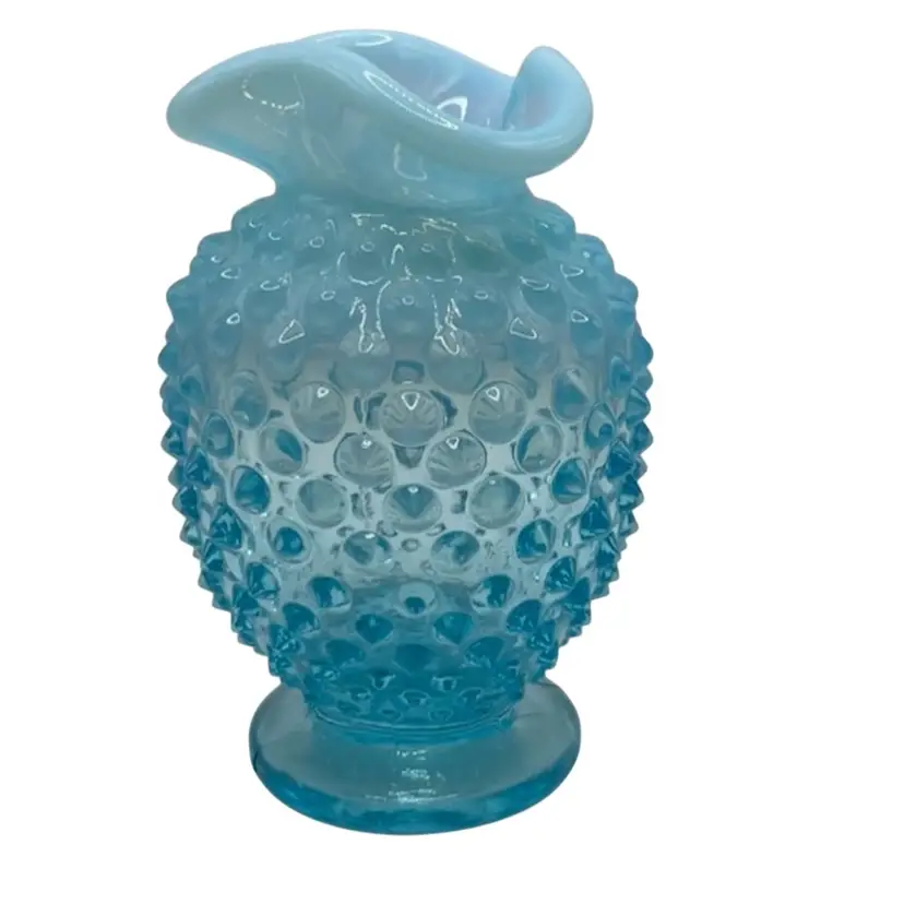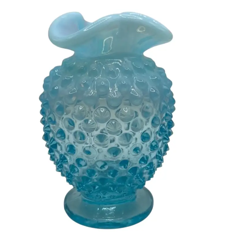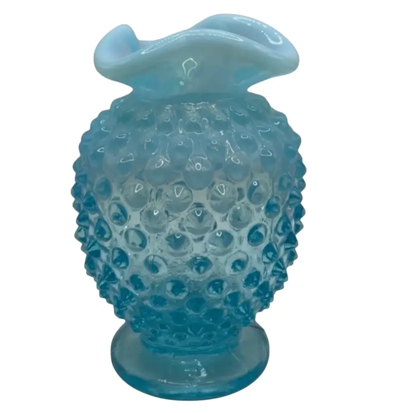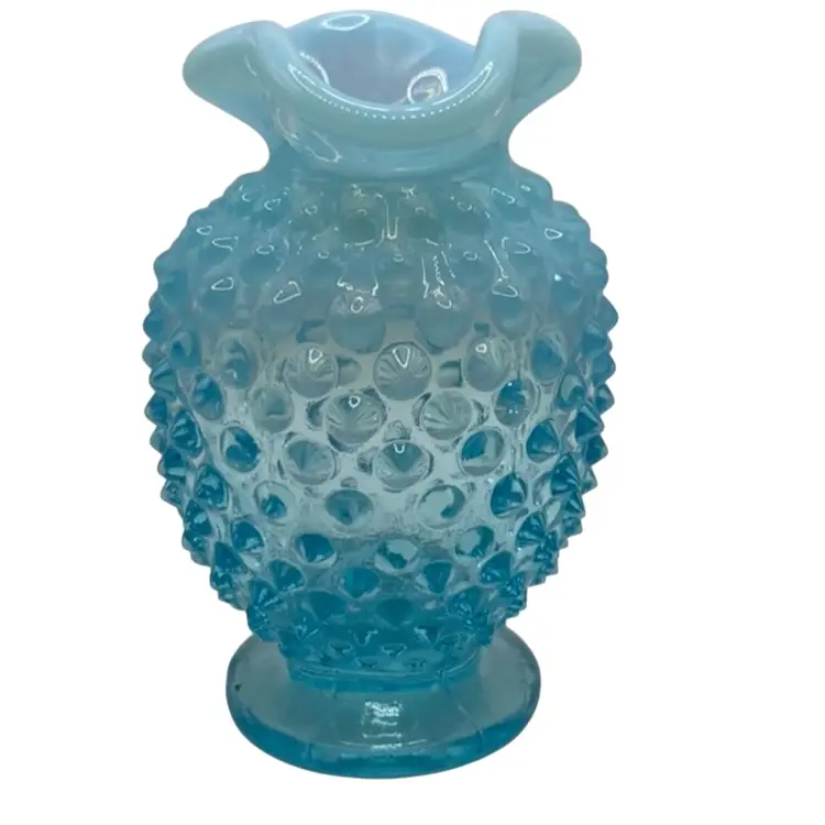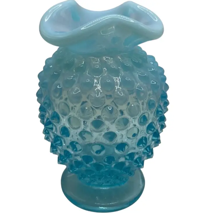 This vintage hobnail Fenton glass vase features a stunning aqua blue opalescent color with a ruffled edge design. The hand blown glass technique used to create this mid-century modern piece makes it a unique addition to any art or flower themed décor. The vase measures 3.5 inches and has a brand name of Fenton.
