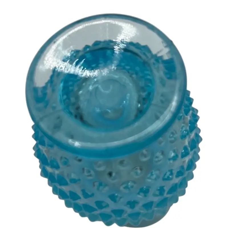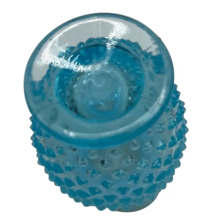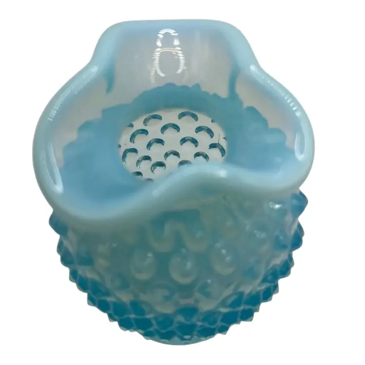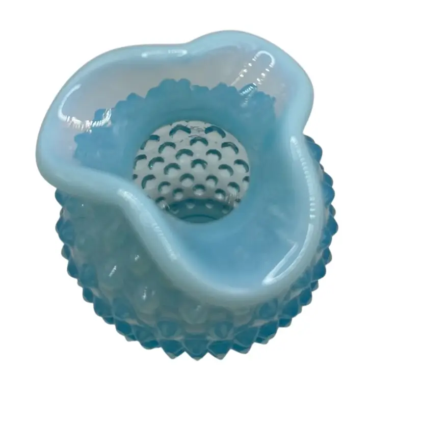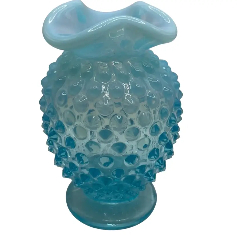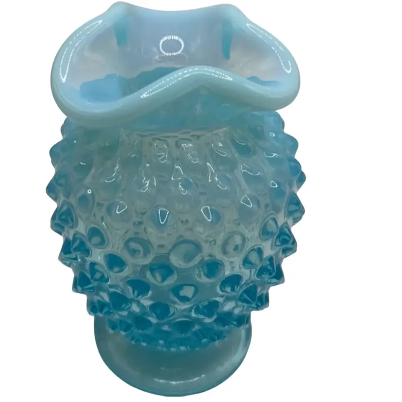 This vintage hobnail Fenton glass vase features a stunning aqua blue opalescent color with a ruffled edge design. The hand blown glass technique used to create this mid-century modern piece makes it a unique addition to any art or flower themed décor. The vase measures 3.5 inches and has a brand name of Fenton.