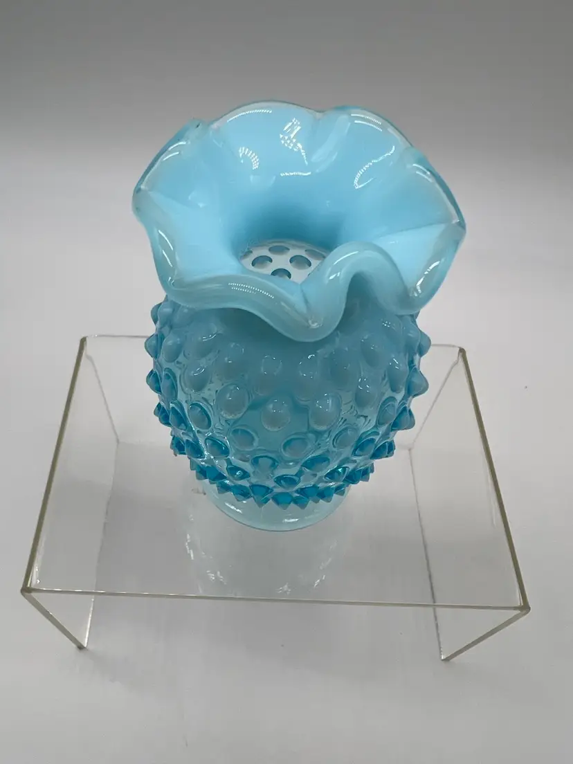 This Vintage Fenton Blue Opalescent Ruffled Hobnail Small Glass Bud Vase is a stunning example of Fenton's craftsmanship, featuring the iconic hobnail pattern that adds texture and charm. The beautiful blue opalescent finish transitions gracefully, capturing light and creating a soft, shimmering effect that enhances any floral arrangement.
