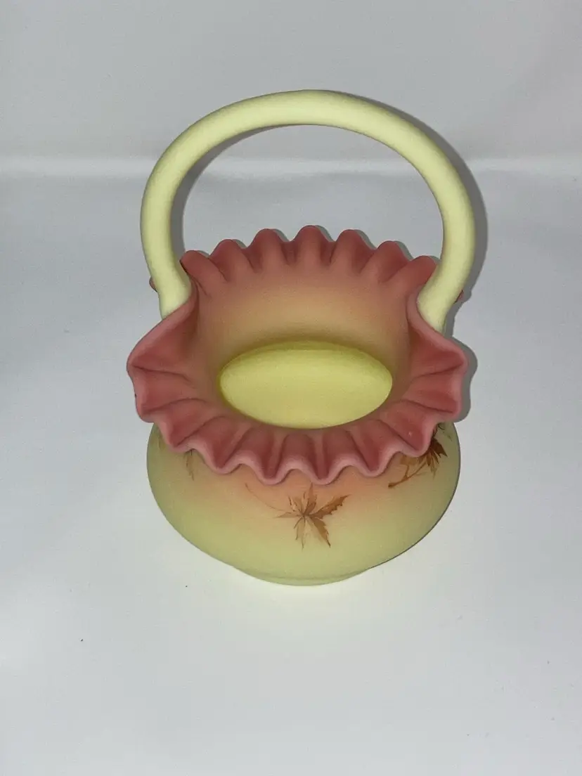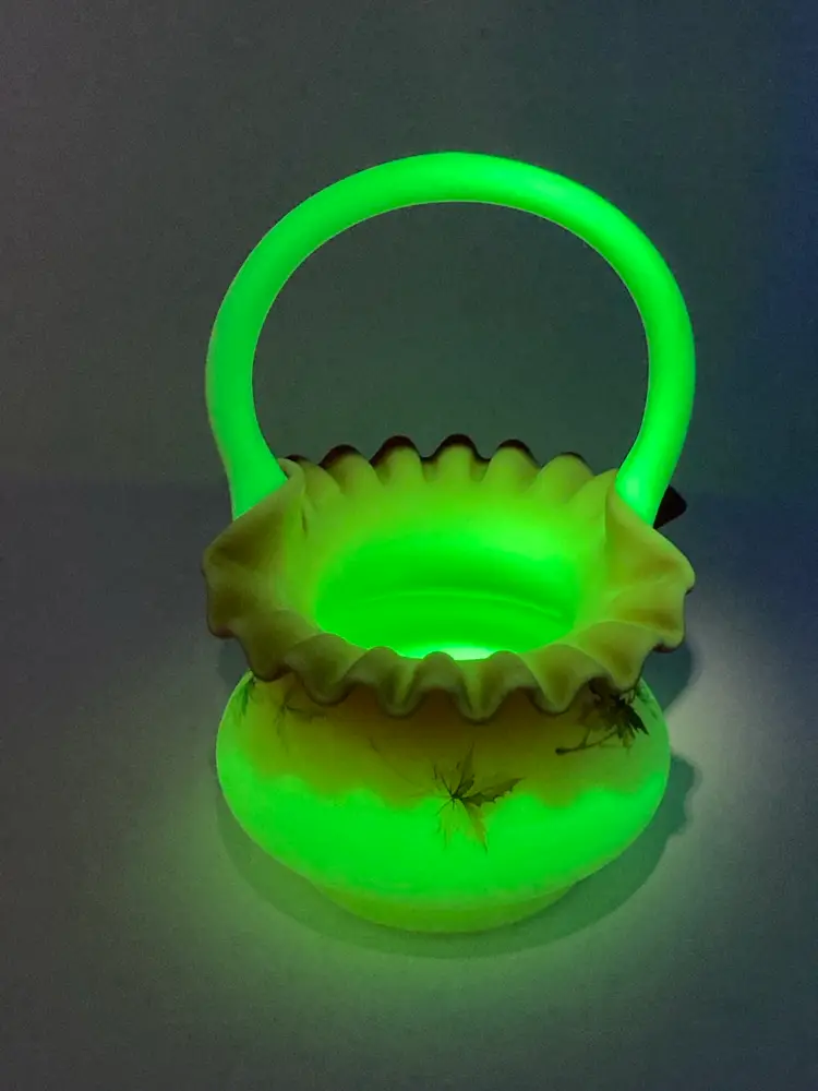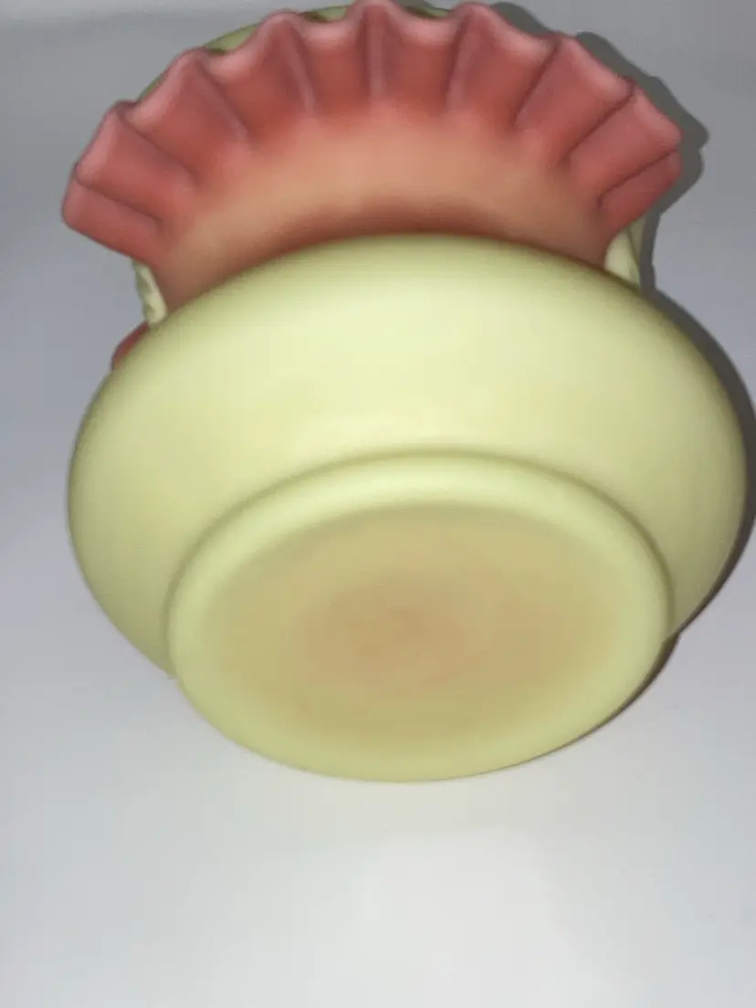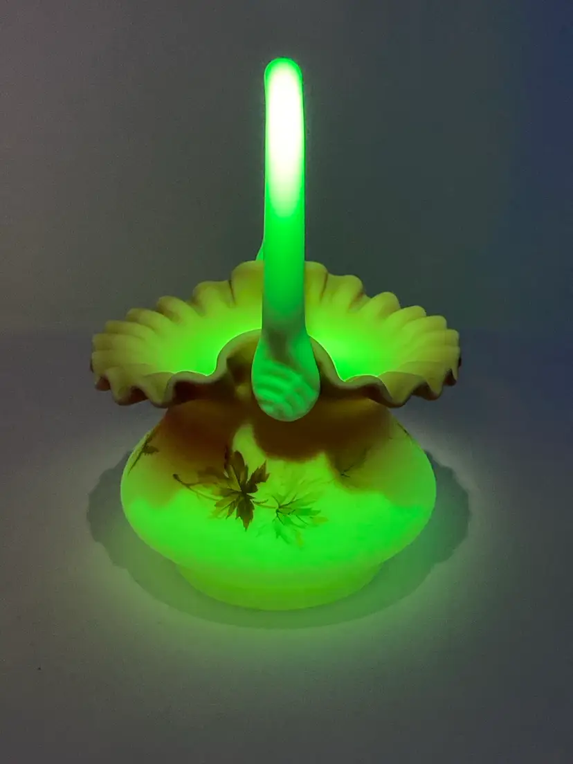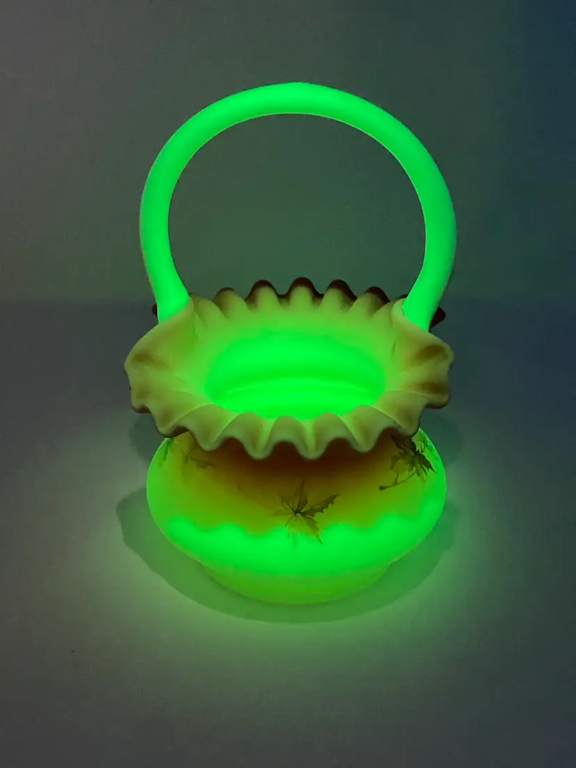 Vintage Fenton Burmese Basket! 5β Wide x 7 1/2β Tall! Fenton Embossed! UV Reactive! Glow π NEW to District? Enter code Michel42 into your wallet prior to your first ever purchase and save $5 off any $10 or more! Give me a Follow and I WILL Follow you back!