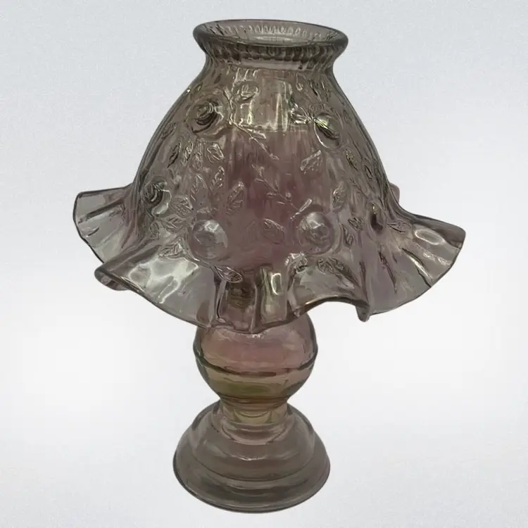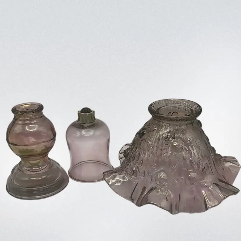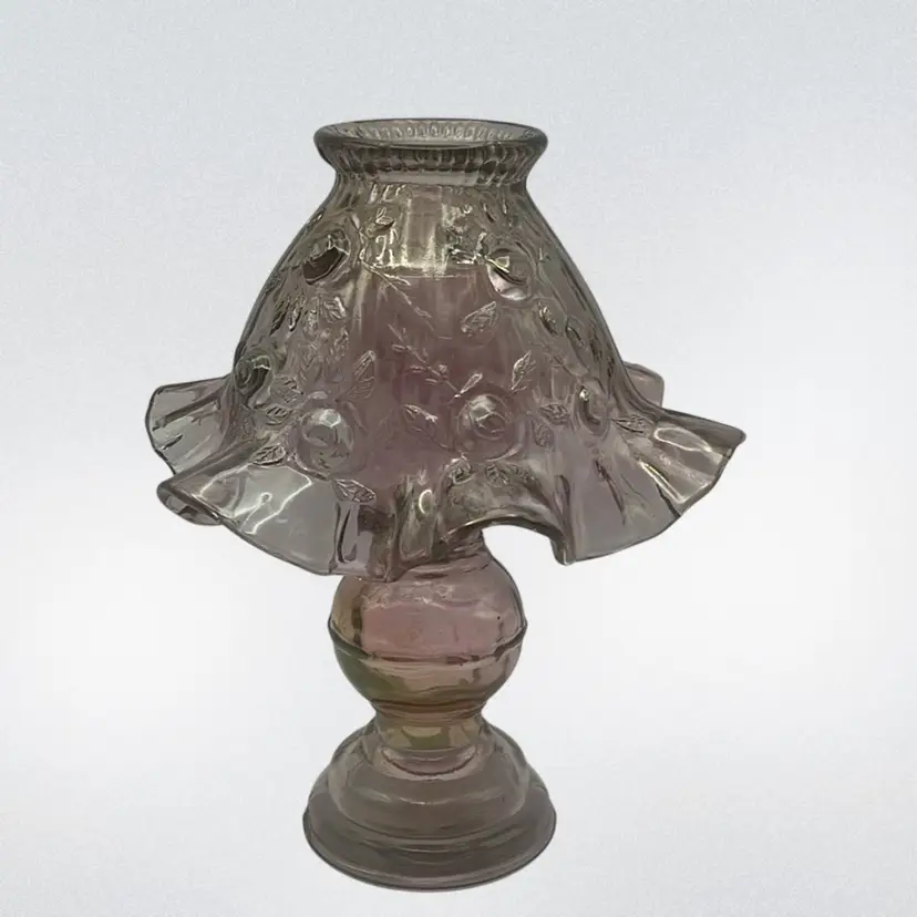 Pink art glass made in the 1970’s and in beautiful condition. Comes in 3 pieces. Shade has a stunning ruffled edge.