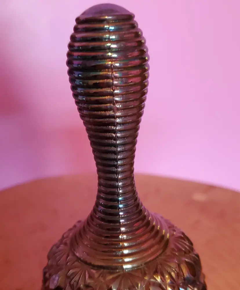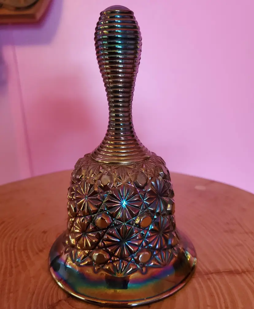 Vintage Fenton Amethyst Carnival Glass Daisy and Button pattern Bell. It measures 6” tall by 3.5” wide at the rim. Shows light ware, it's missing the dinger inside.