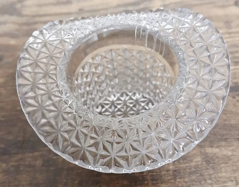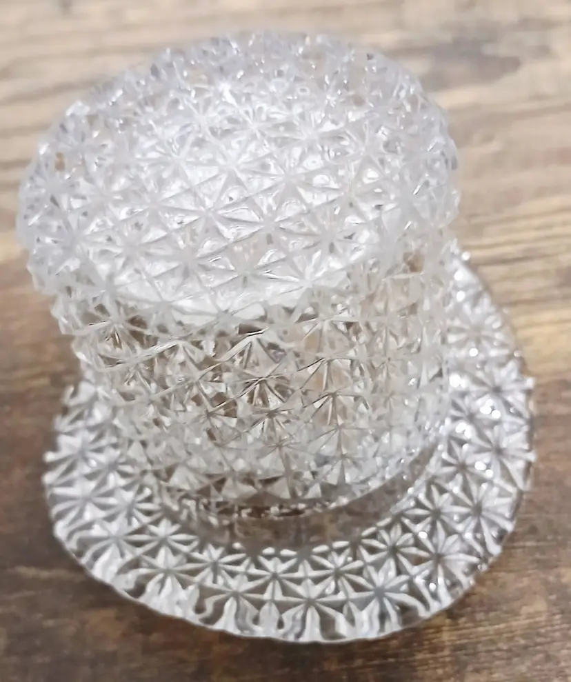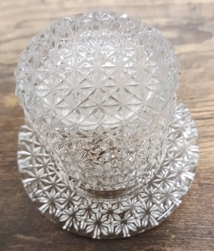 Add a touch of elegance to your decor with this vintage crystal vase shaped like a top hat. Perfect for displaying small flowers or as a unique decorative piece. Measures approximately 2 1/2 inches tall × 3