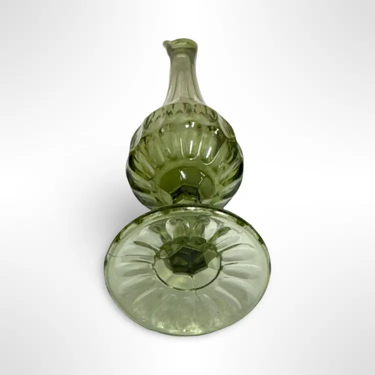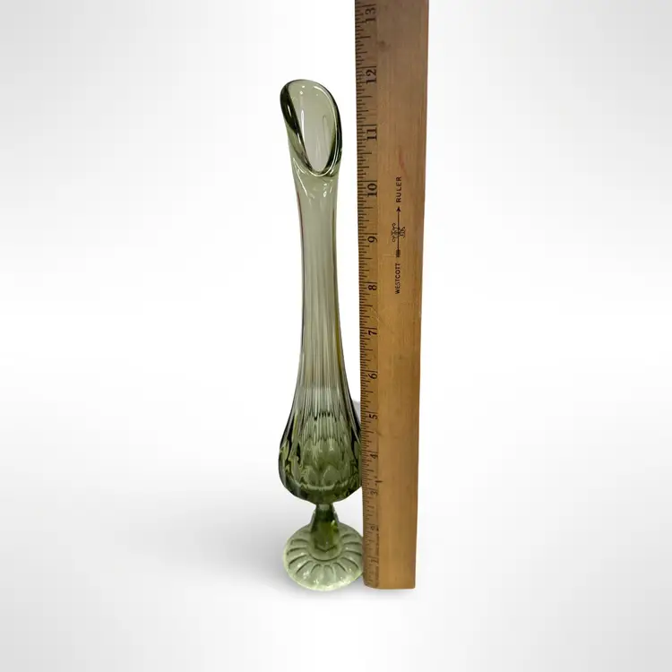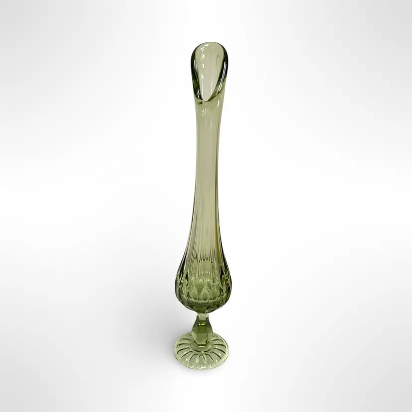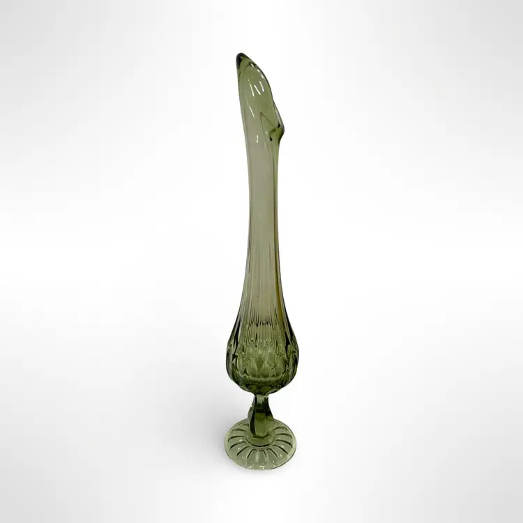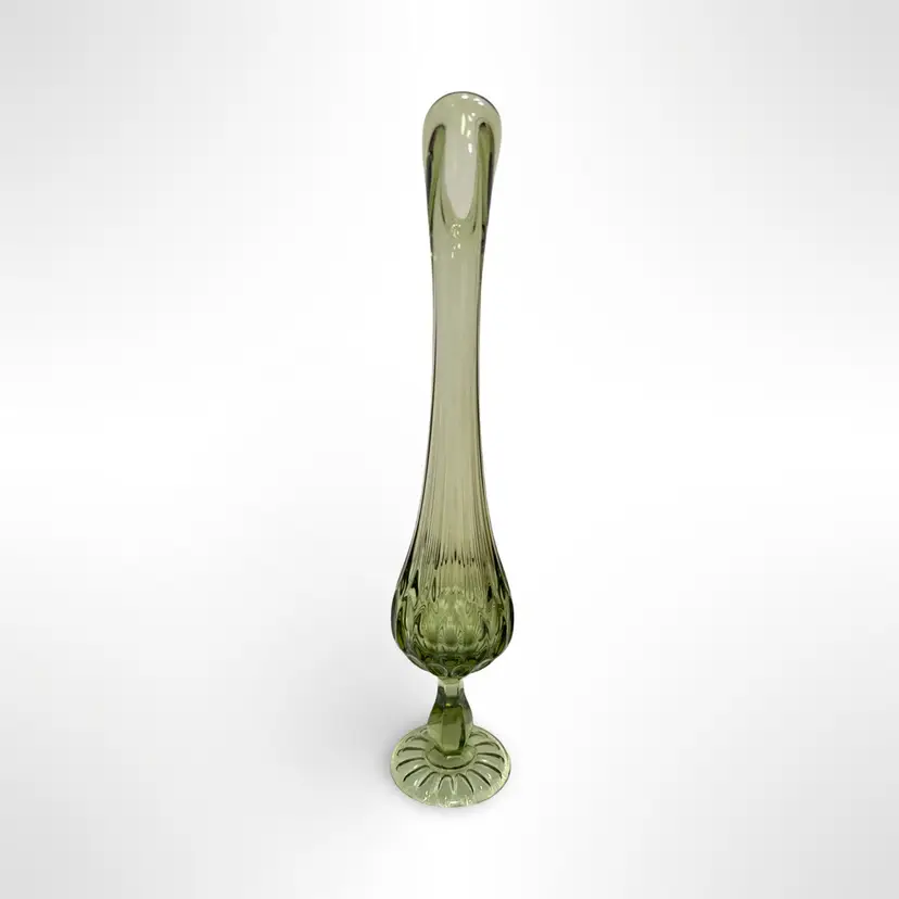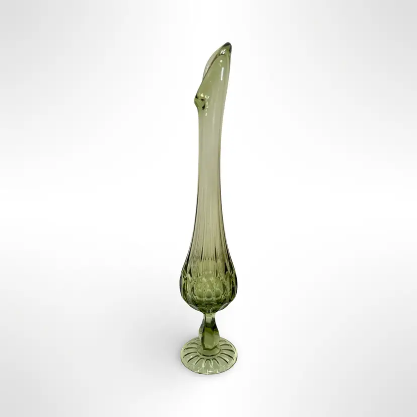 From Fenton’s colony line, this green swung glass vase features indents that look like thumbprints, lending to the name for the pattern. This piece is in beautiful vintage condition with no chips or cracks. It measures approximately 12” tall.