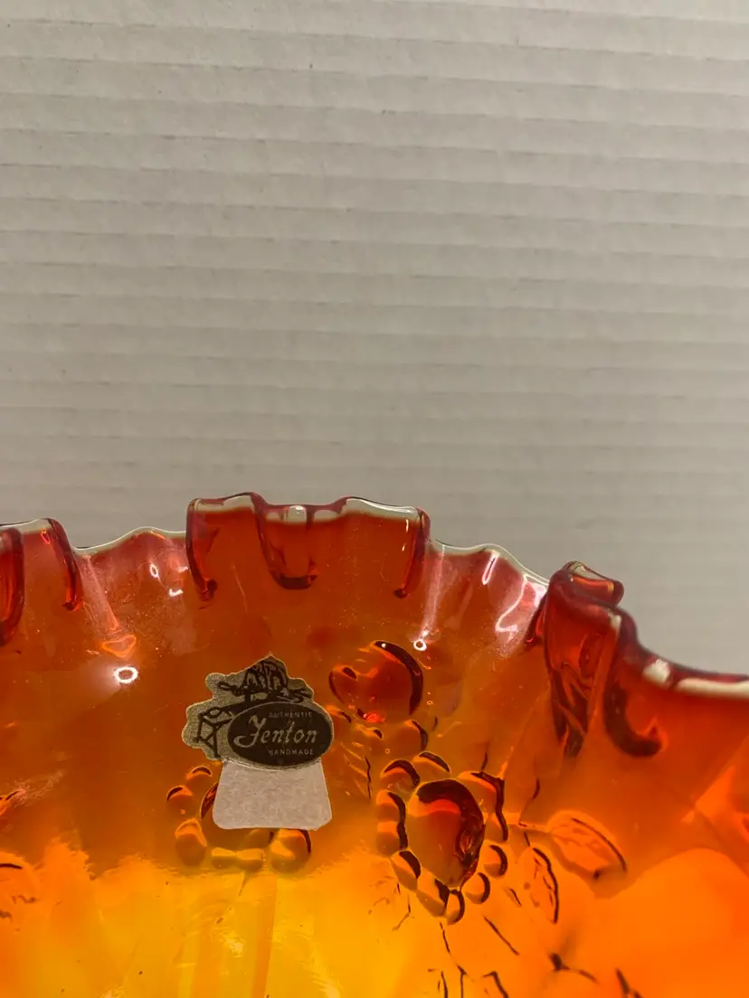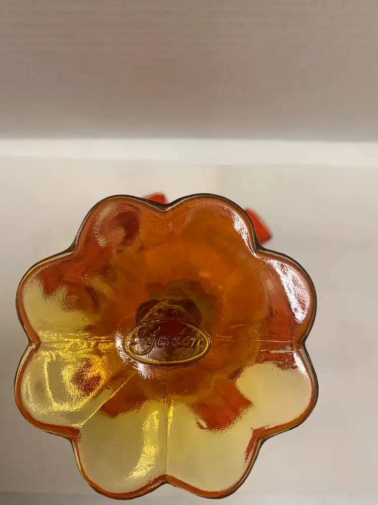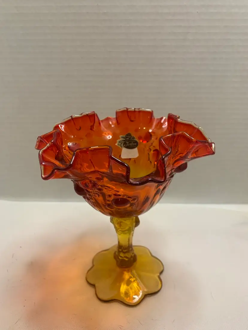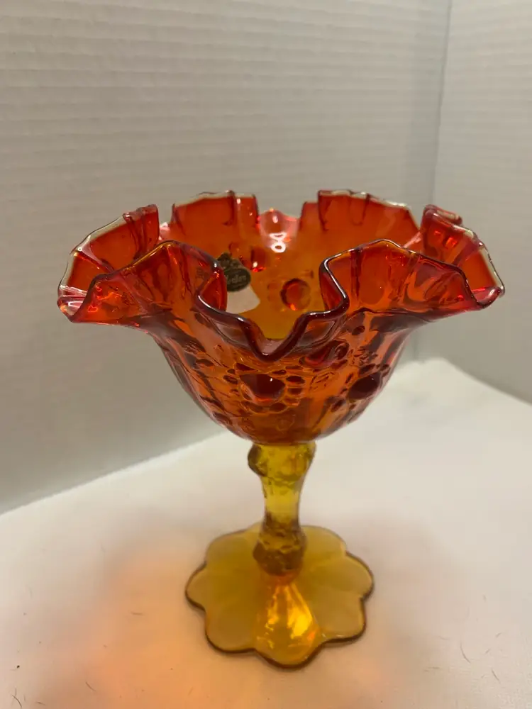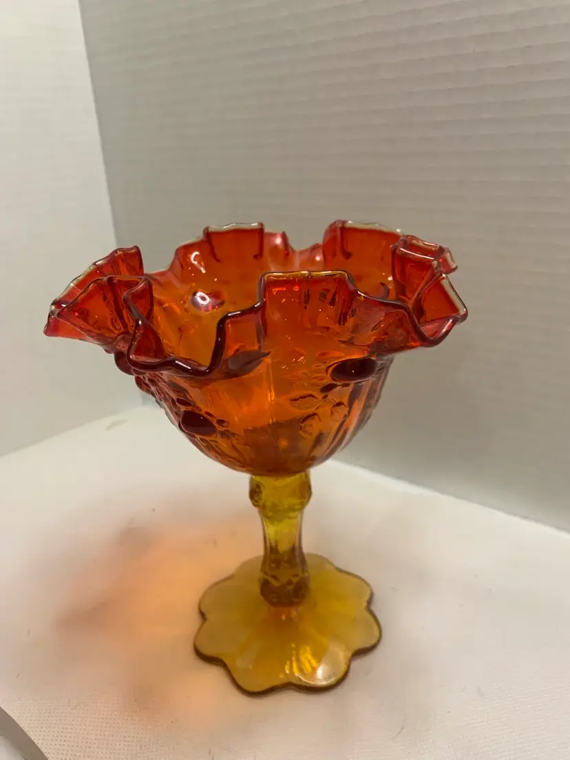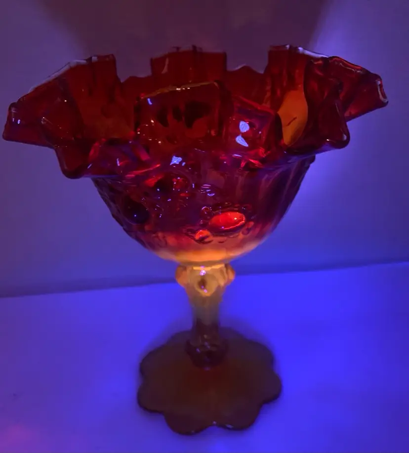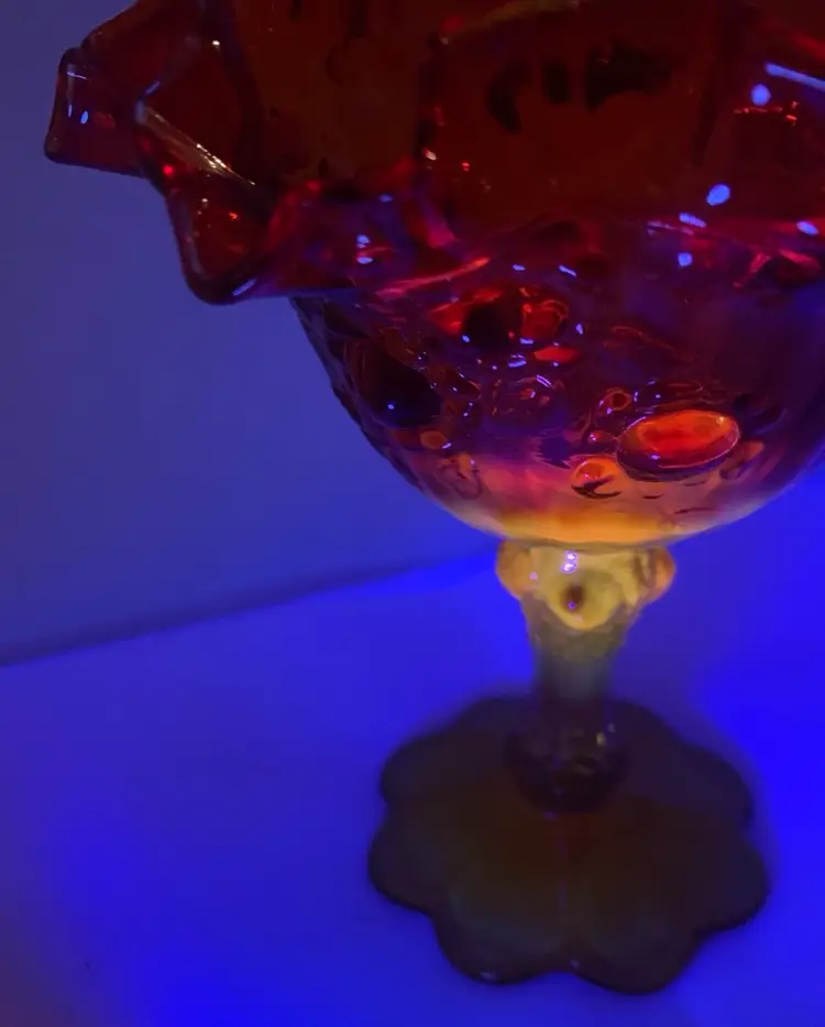 Amberina cabbage rose ruffled compote with yellow pedestal. Possibly L.E. Smith? Pedestal glows. 6.5” high and 6” wide. No chips or cracks.