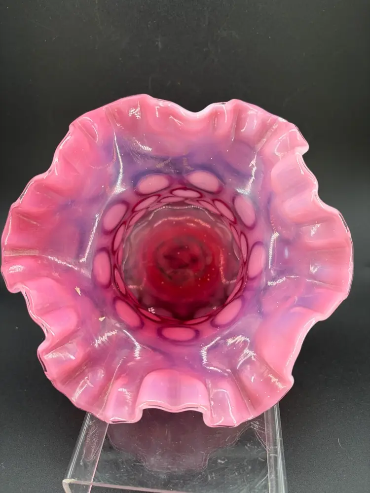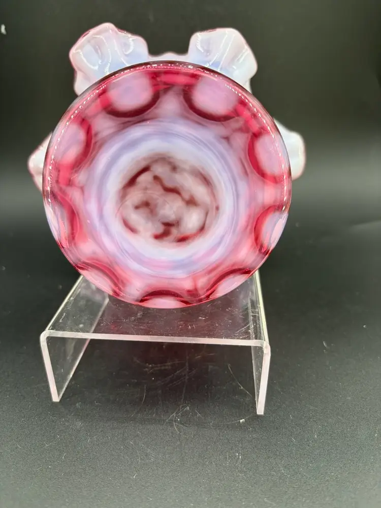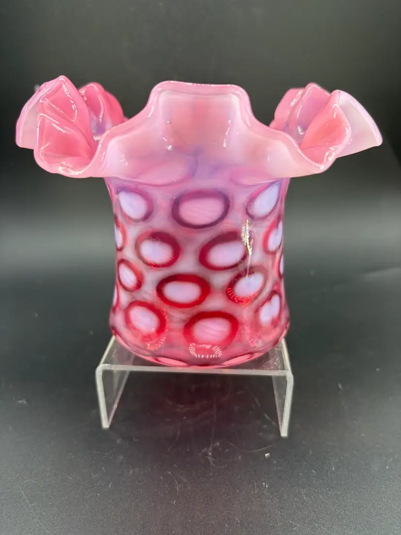 This piece is a Cranberry coin dot ruffled vase made by the Fenton Glass Company. There are no chips or cracks. It stands 4.5 inches tall and 6 inches across the top.