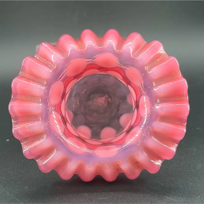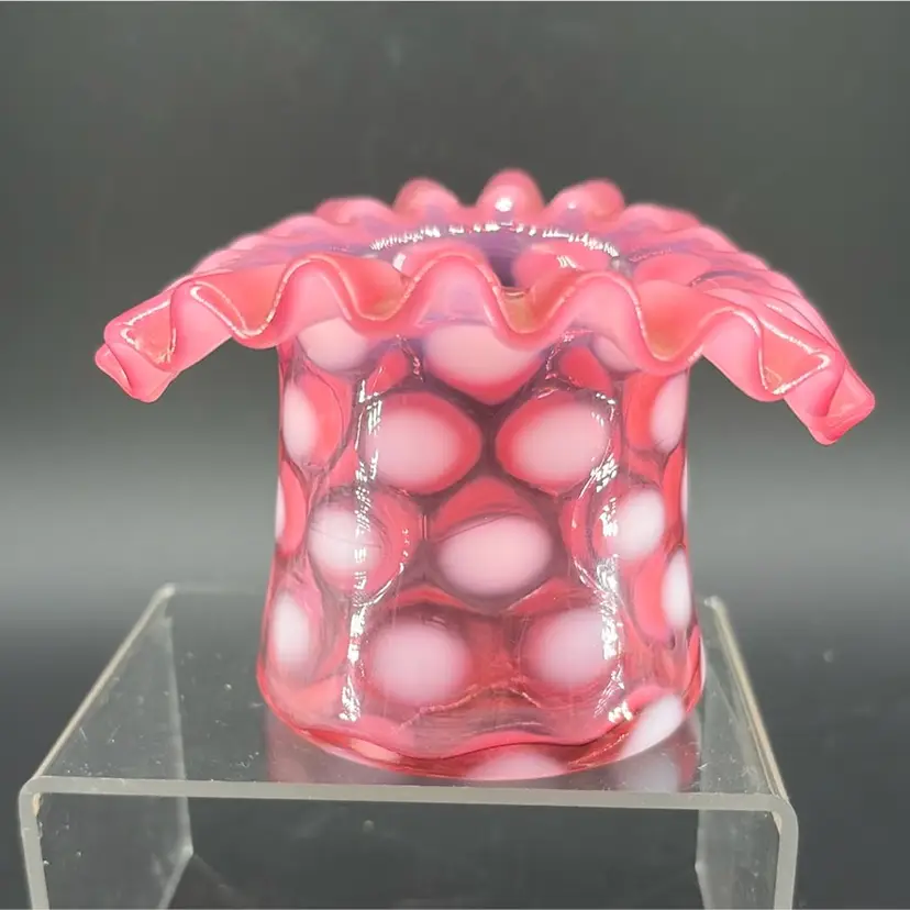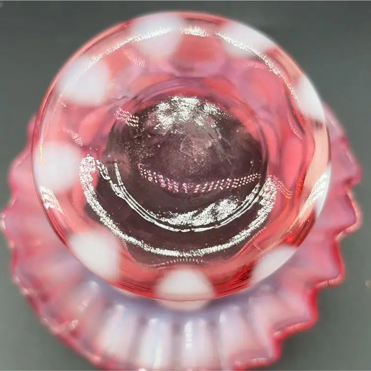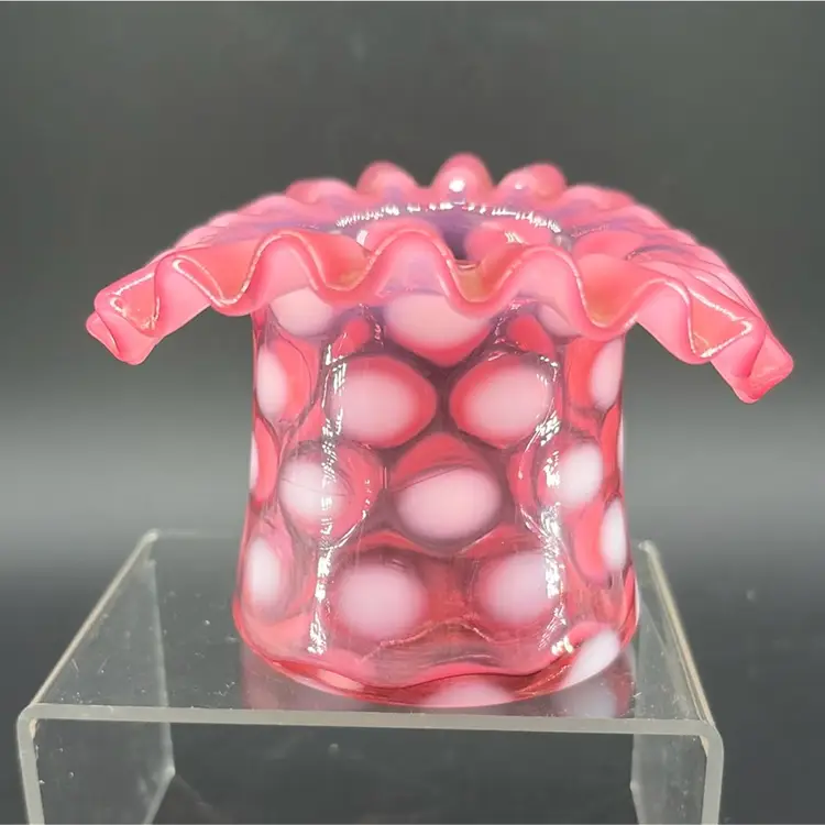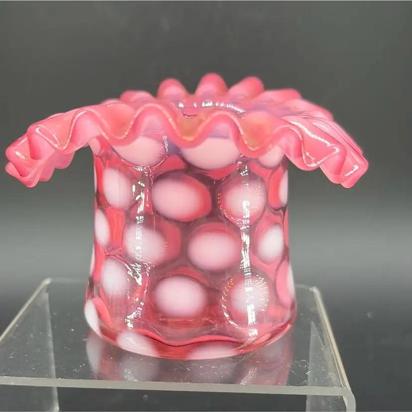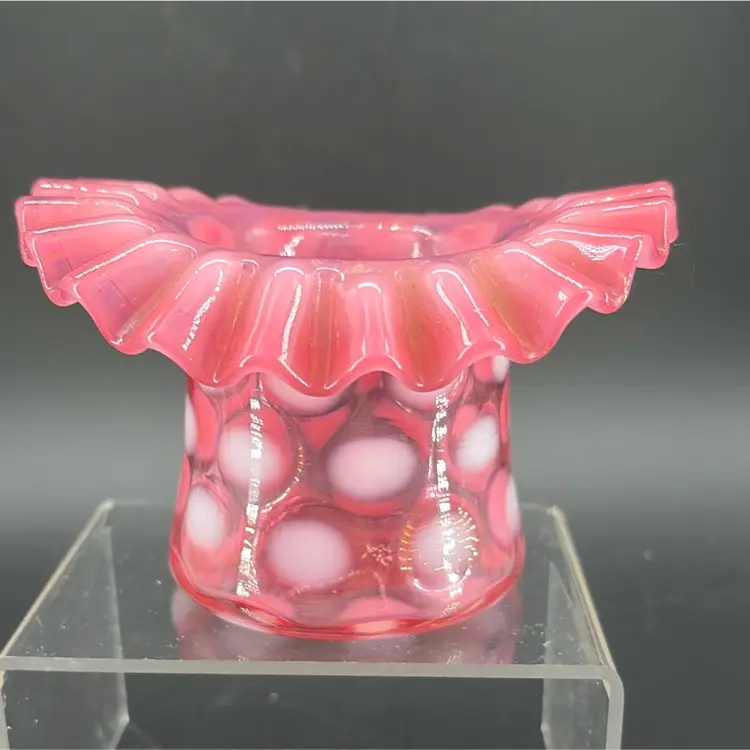 This piece is a "Coin Dot" pattern, characterized by applied opalescent glass spots that create a polka-dot effect The cranberry color, a rich pinkish-red is a classic Fenton hue. The ruffled rim adds a decorative touch.