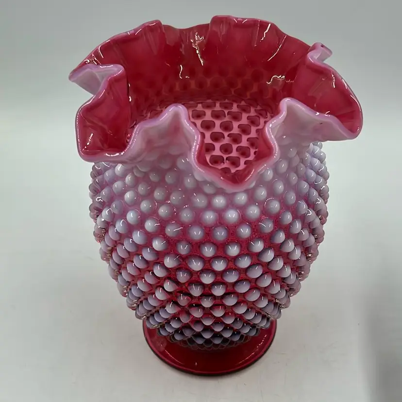 No chips or cracks Ash mark in the bottom of vase done in manufacturing Fenton Glass Vase 7.75” T 5.5” W