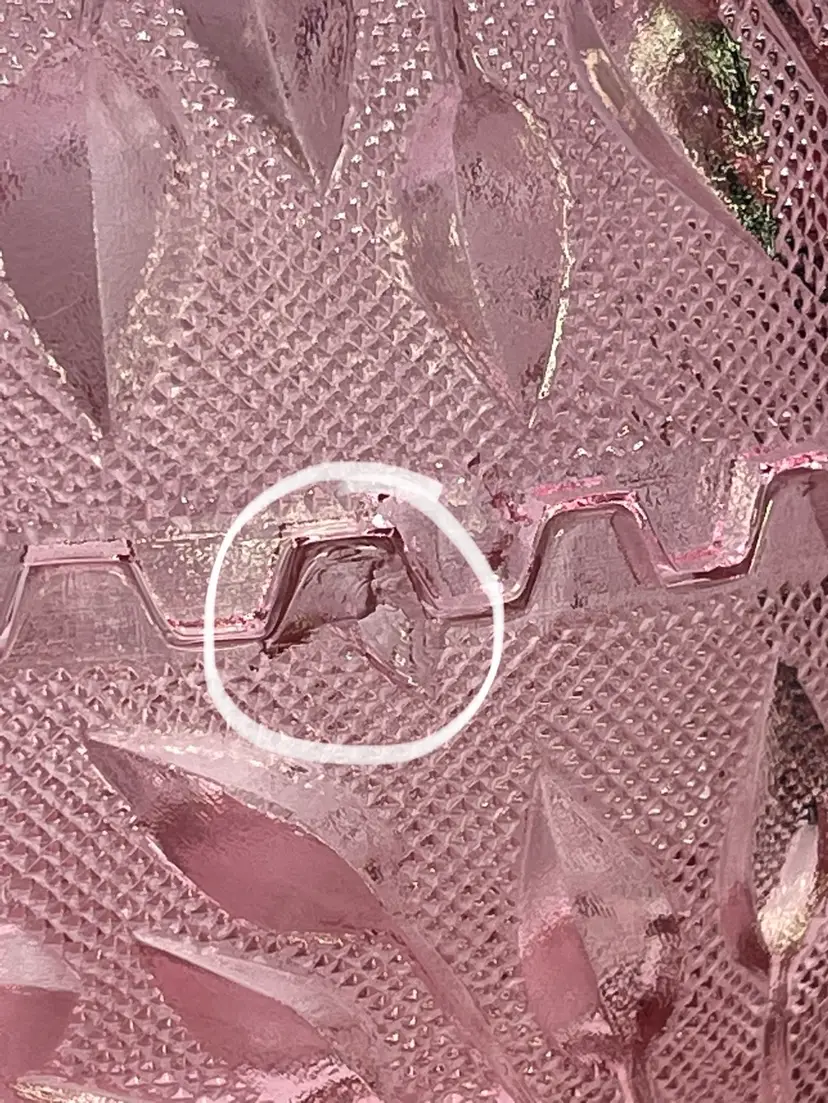 There are two small chips on what I could call the back side of this piece, roughly 2-3 inches apart. They are located where the saw teeth come together, one is slightly larger than the other but cannot be seen unless you’re looking/feeling for it. All of the teeth are intact and none are missing. They are pictured in the photos but do not take away from its beauty.