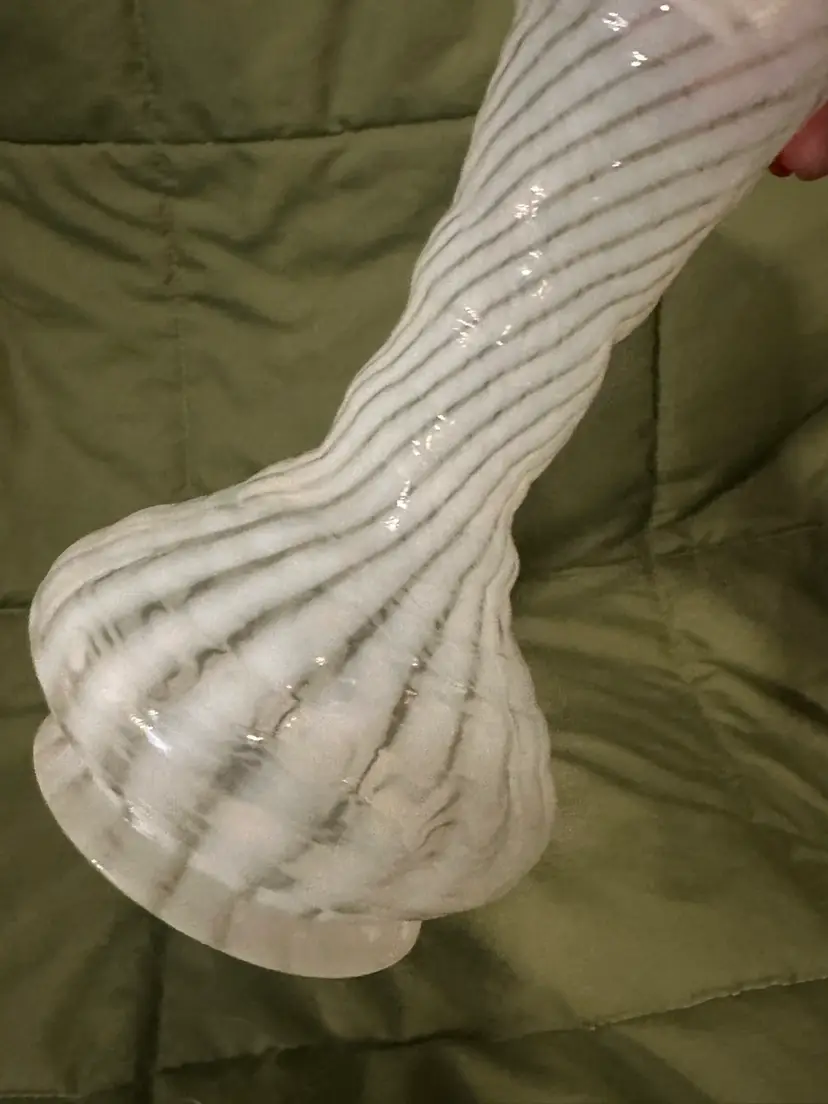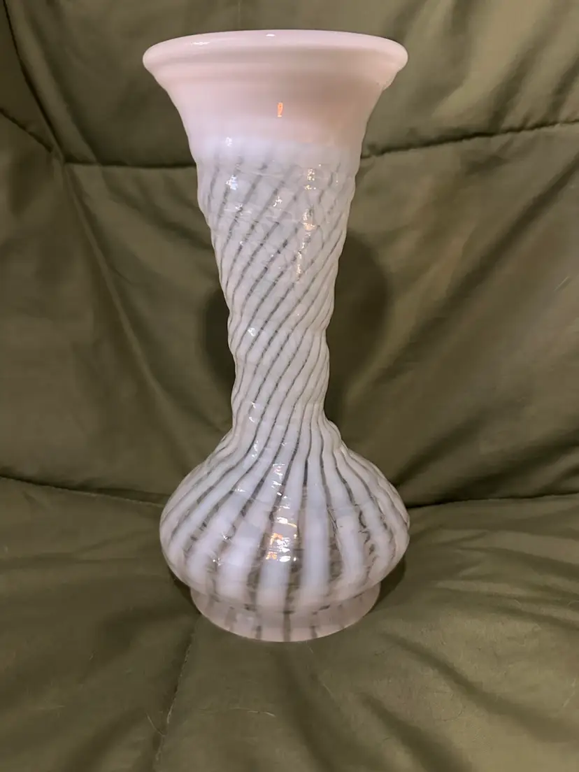 The Vintage Fenton French Opalescent Glass Spiral Vase stands at 8 inches tall, featuring a ruffled pattern in a Victorian style design. Made in the United States, this hand-blown glass vase exudes a timeless elegance with its white color and intricate craftsmanship. A vintage original piece from the renowned Fenton brand, this vase is a beautiful addition to any collection of decorative pottery and glassware.