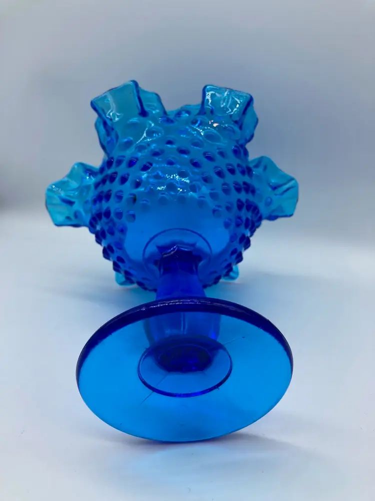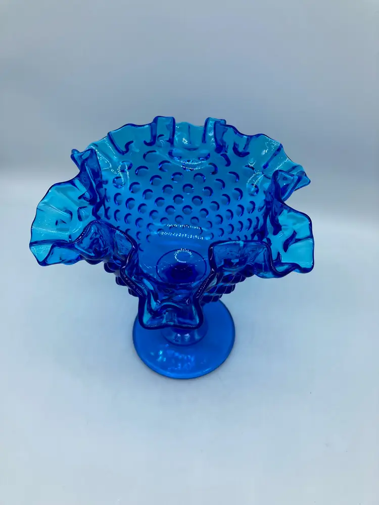 Vintage Fenton Glass 6" Blue Hobnail Ruffled Compote Candy Dish