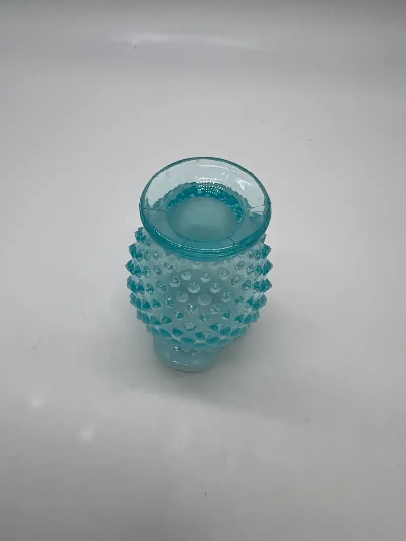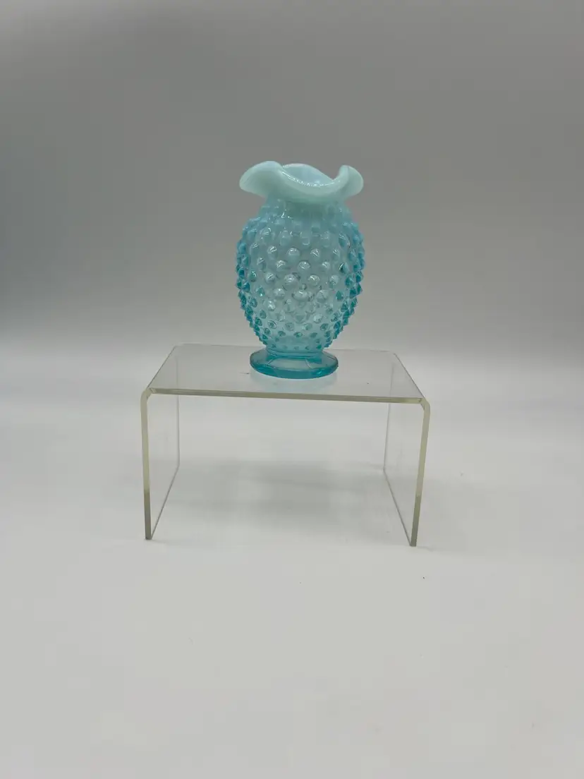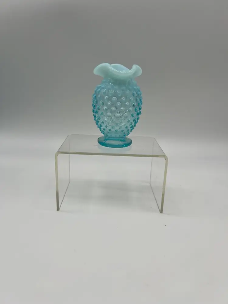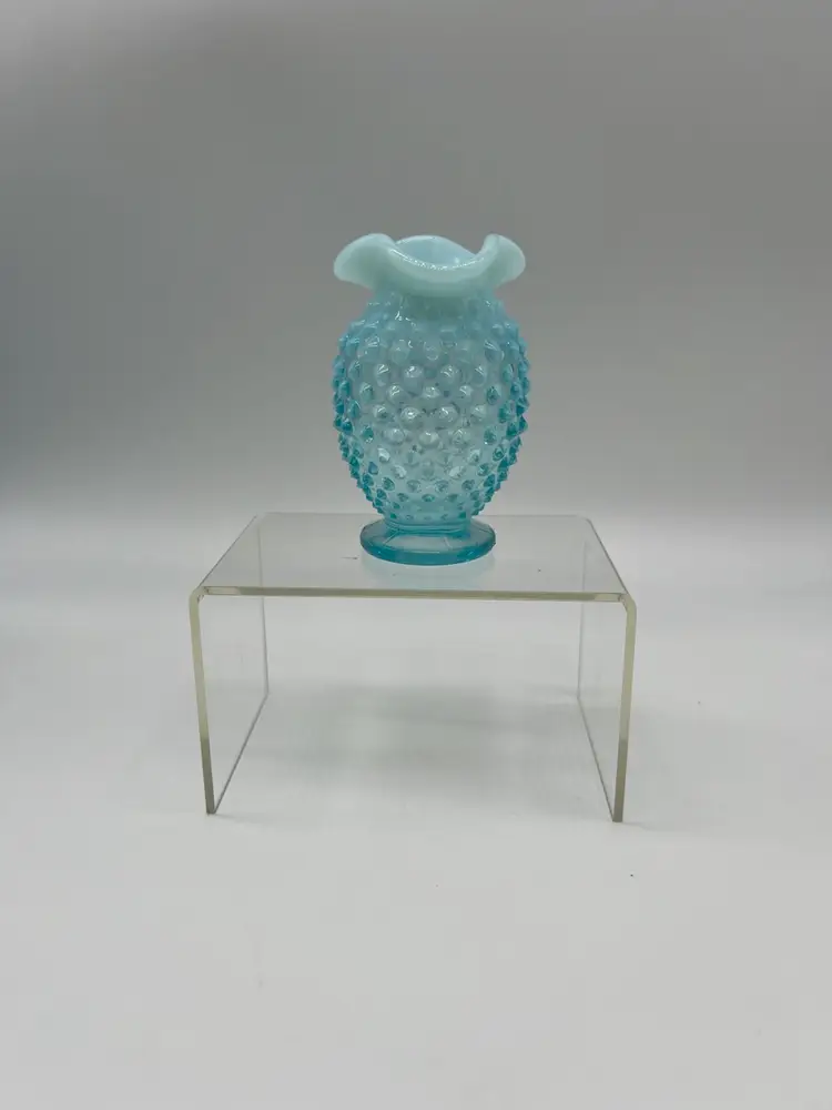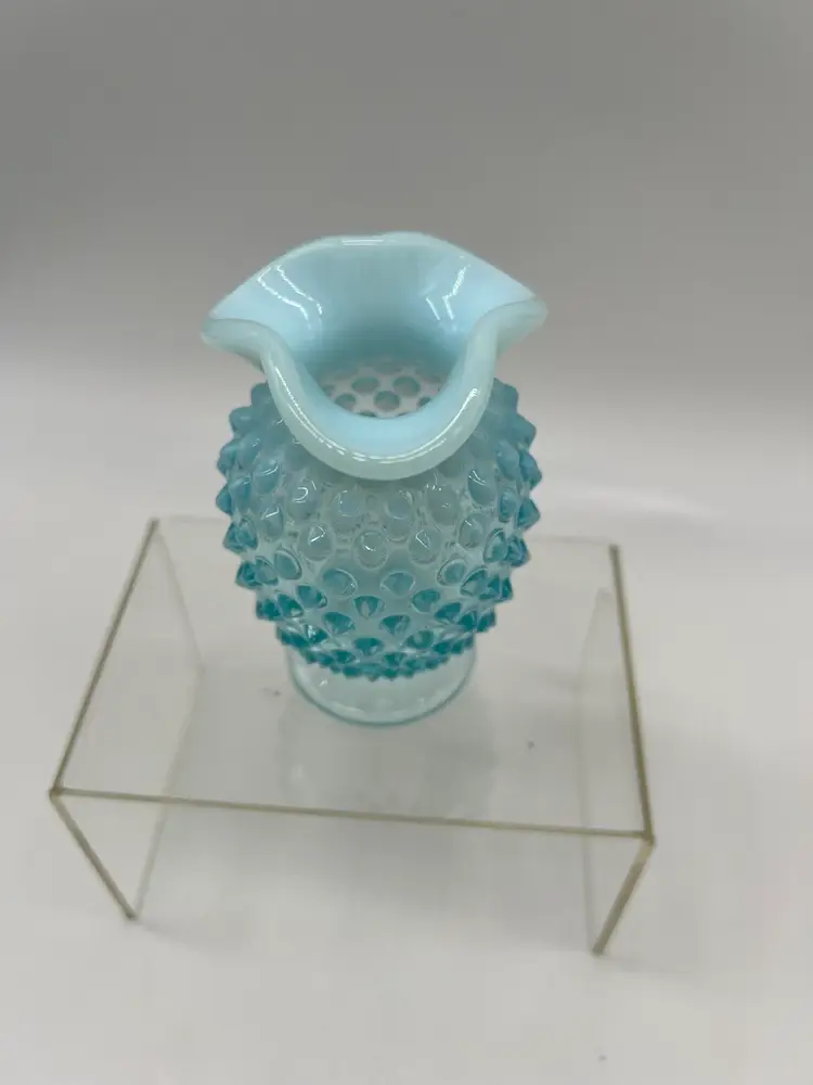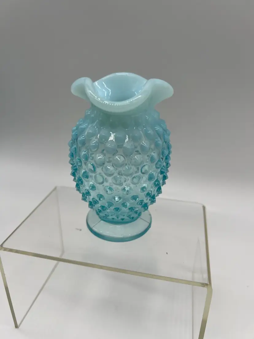 ...This exquisite piece showcases the classic hobnail pattern synonymous with Fenton's artistry, featuring a stunning aqua blue hue that transitions beautifully to an opalescent finish. The ruffled edge adds an elegant touch, making it a perfect accent for any home decor or a thoughtful gift for collectors.