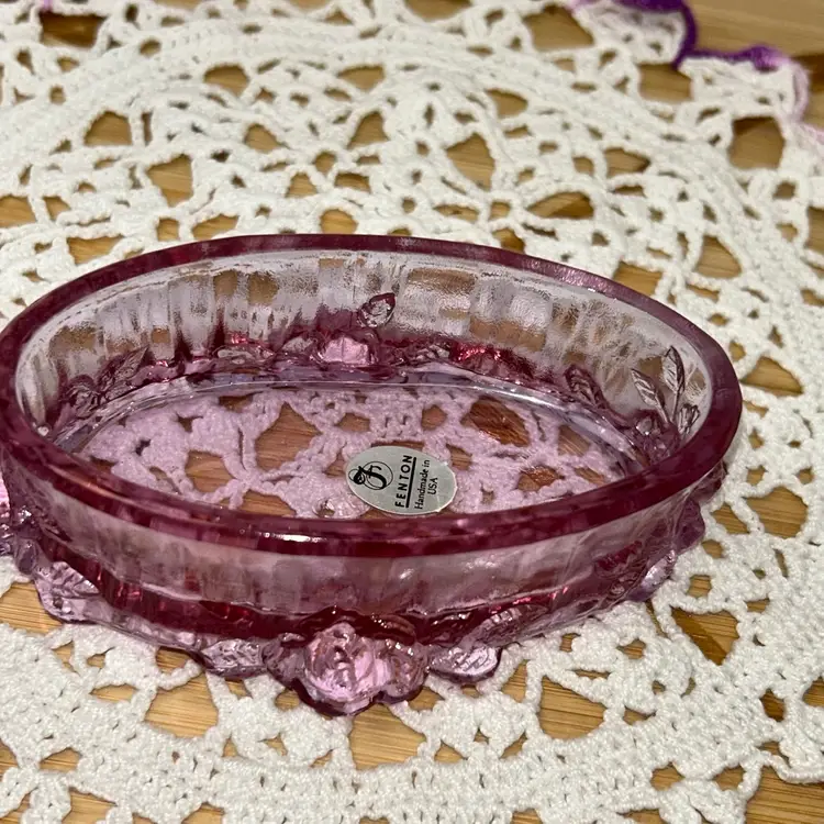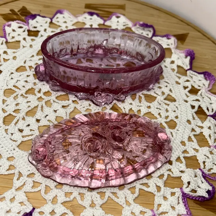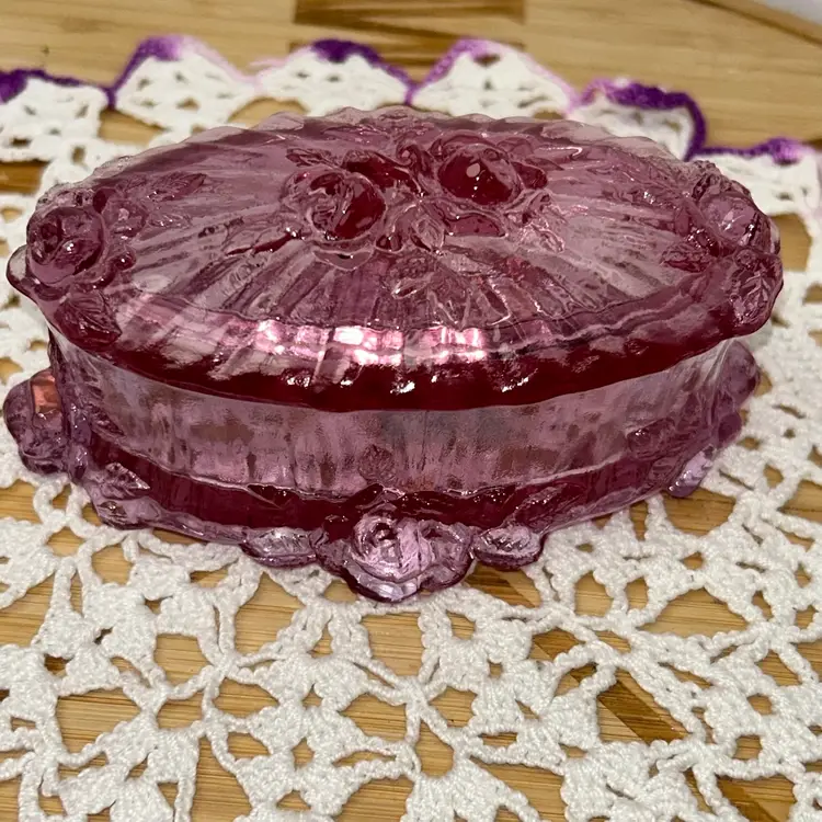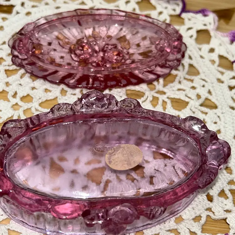 Dusty Rose was a limited edition color introduced in the 1980s. This piece was made in limited quantities. Box is in excellent condition, with no issues. It is 4.75” long x 2.75” wide x 2.5” tall to top of box. Both embossed mark and foil label are present. Pattern is also known as “Sharon”.