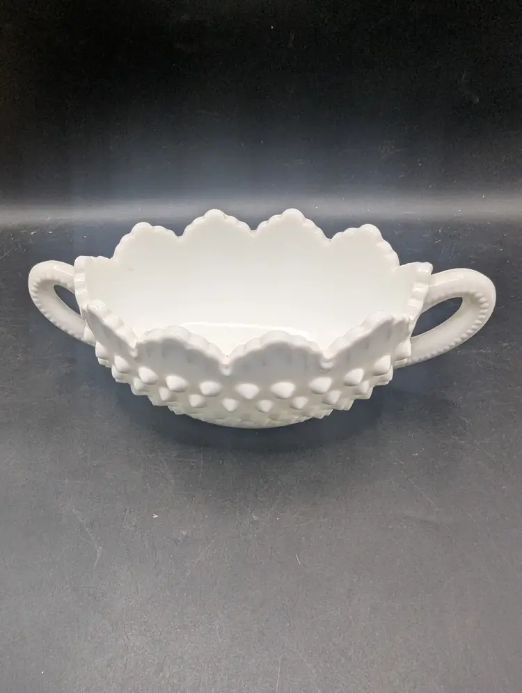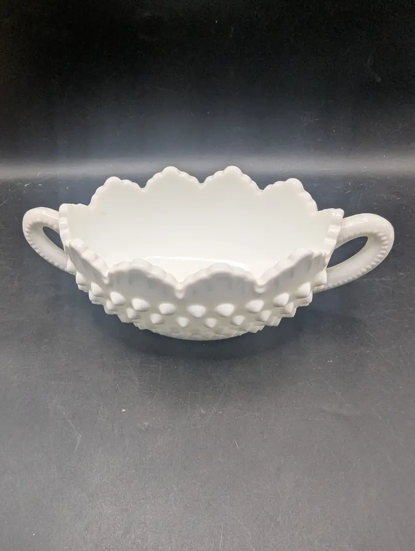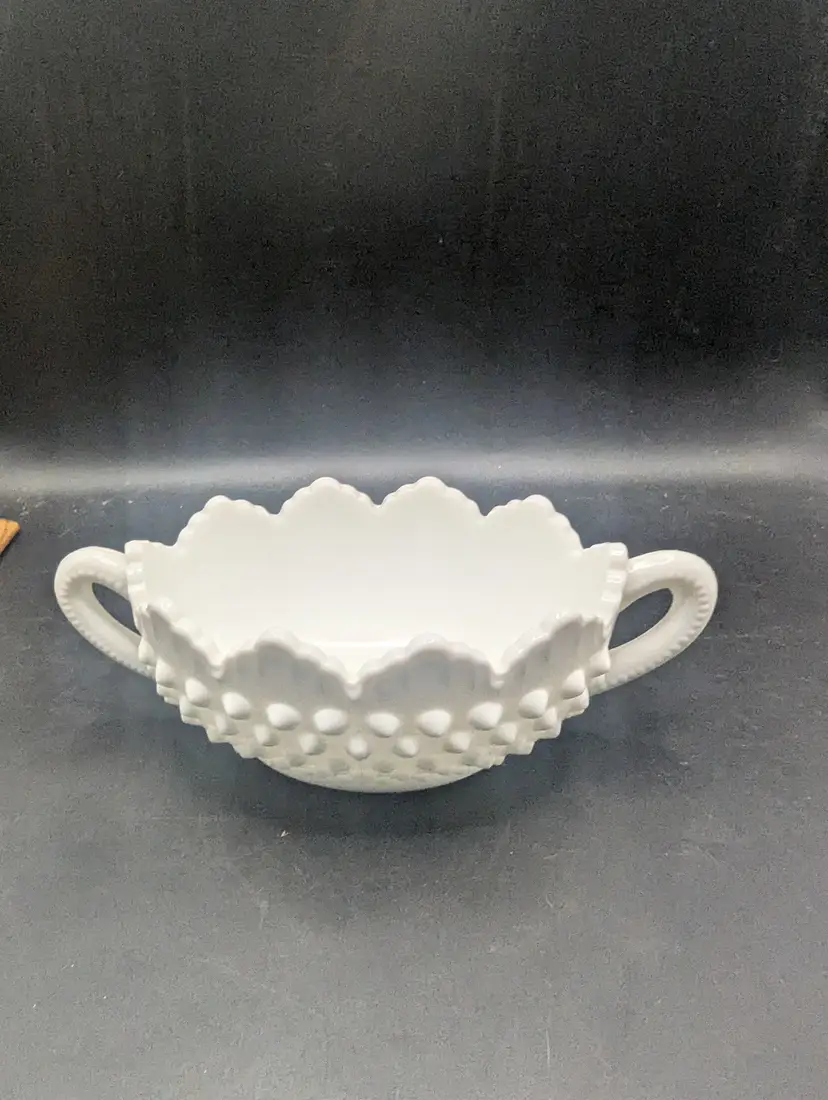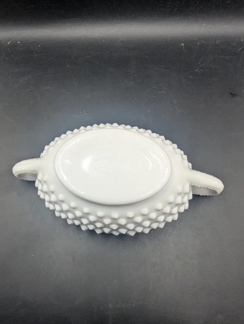 This is a lovely Vintage Fenton Glass Oval Nut or Candy Dish 2 Handles Hobnail White Milk Glass. No chips or cracks. Please see all pictures for condition and measurements.