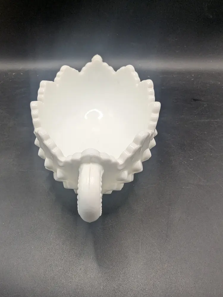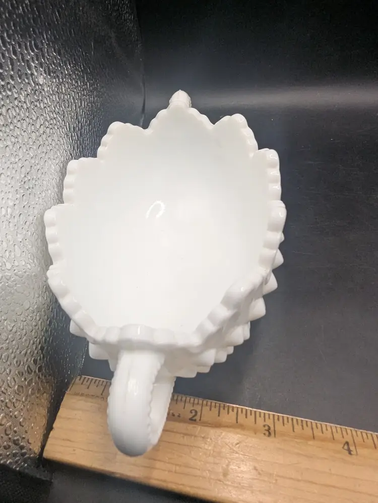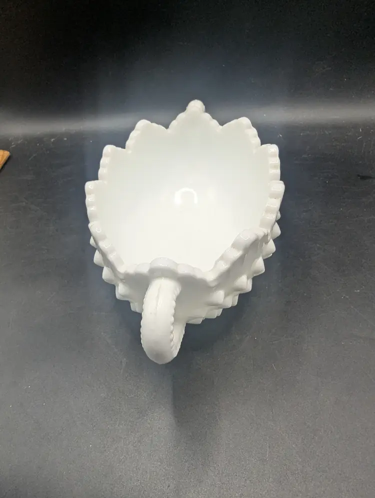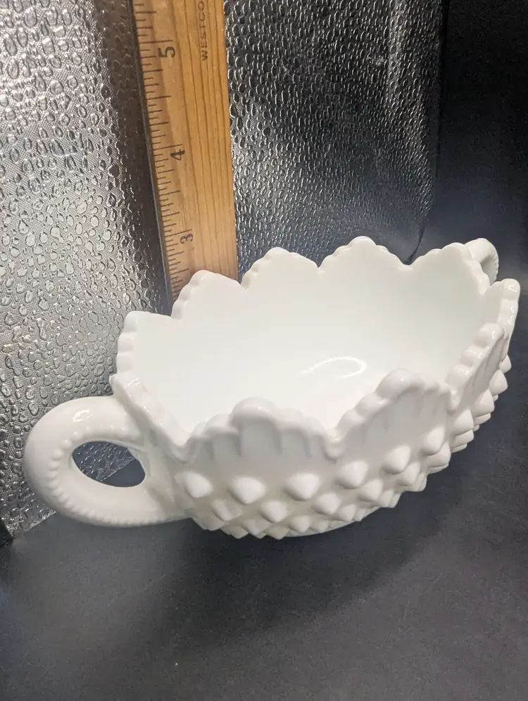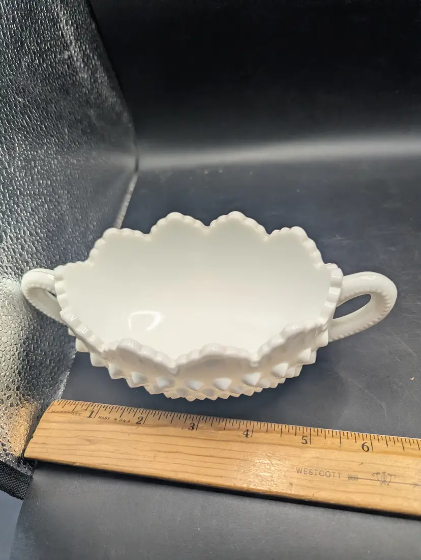 This is a lovely Vintage Fenton Glass Oval Nut or Candy Dish 2 Handles Hobnail White Milk Glass. No chips or cracks. Please see all pictures for condition and measurements.