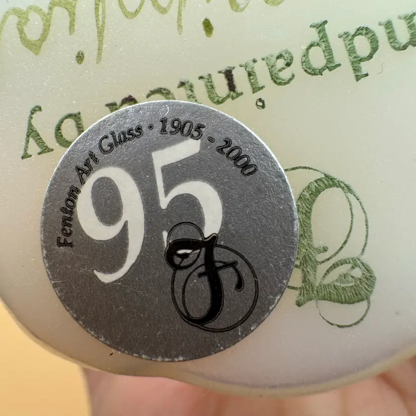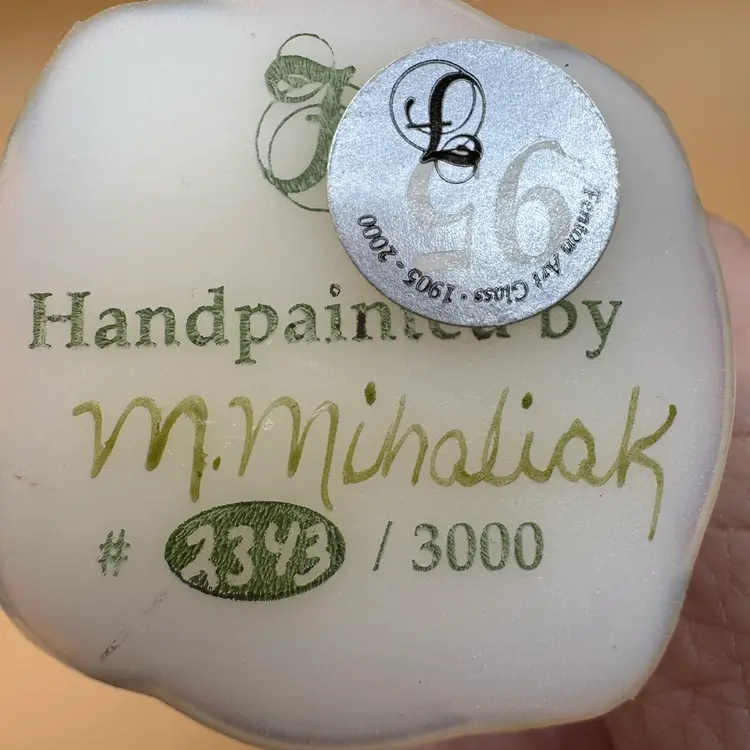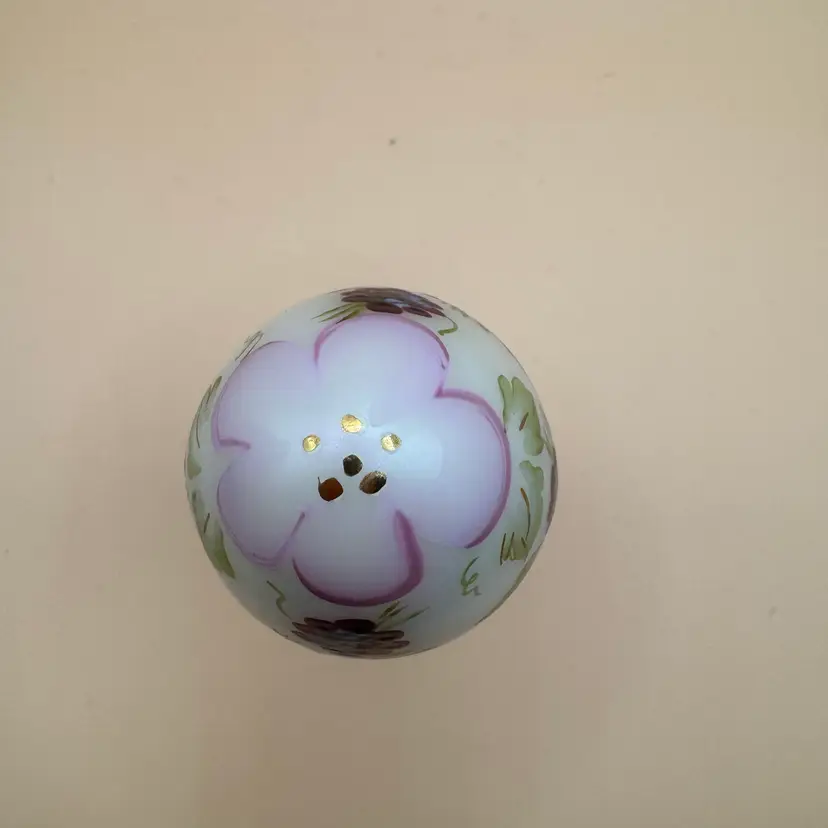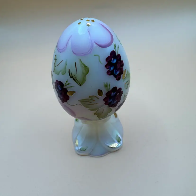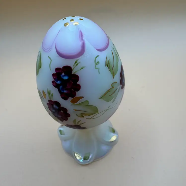 vintage Fenton Art Glass pedestal egg features a hand-painted floral or berry design on a white iridescent glass body