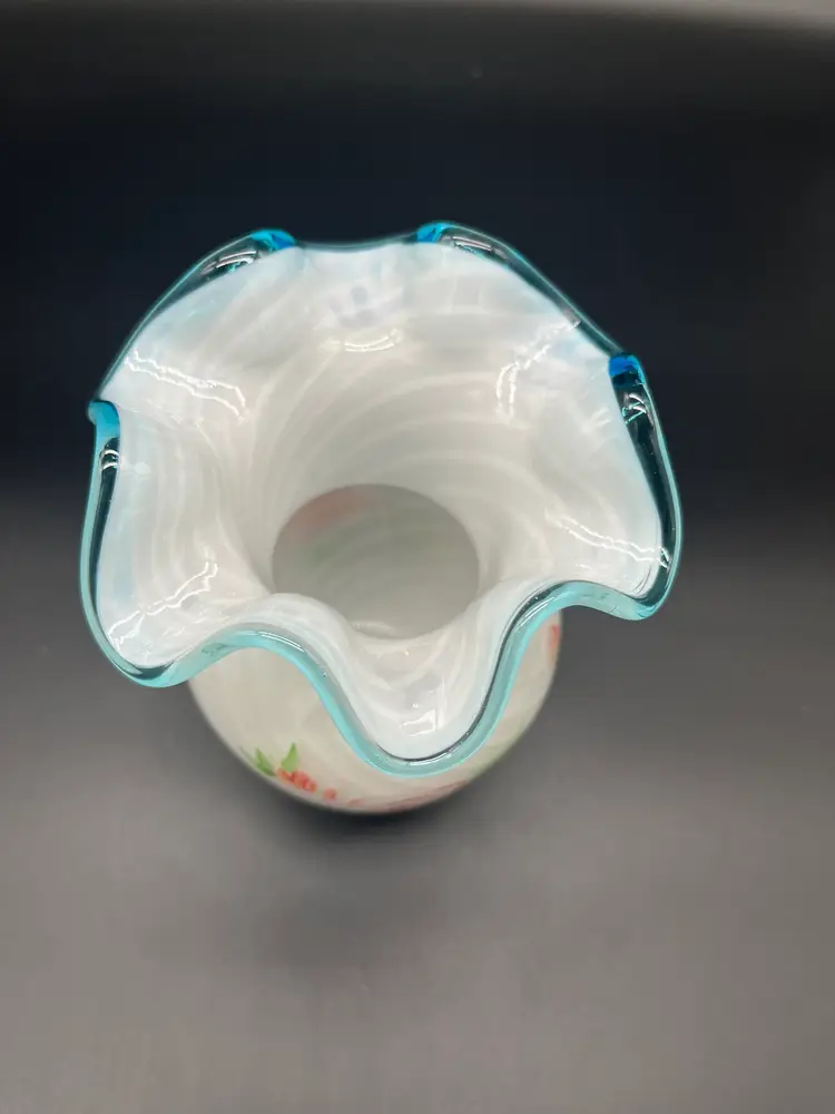 Likely from 1970s, this hand-painted floral Fenton Art Glass vase may have been made specifically for Teleflora. The ruffled, crimped rim is an aqua crest, and the vase base is adorned with a floral design of pink roses and green leaves.
