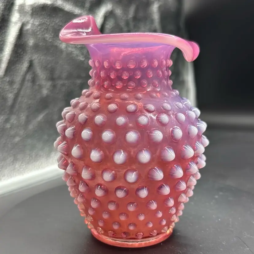 Vintage Fenton Hobnail Cranberry Opalescent Vase Triangular Ruffled Rim 5 3/4"