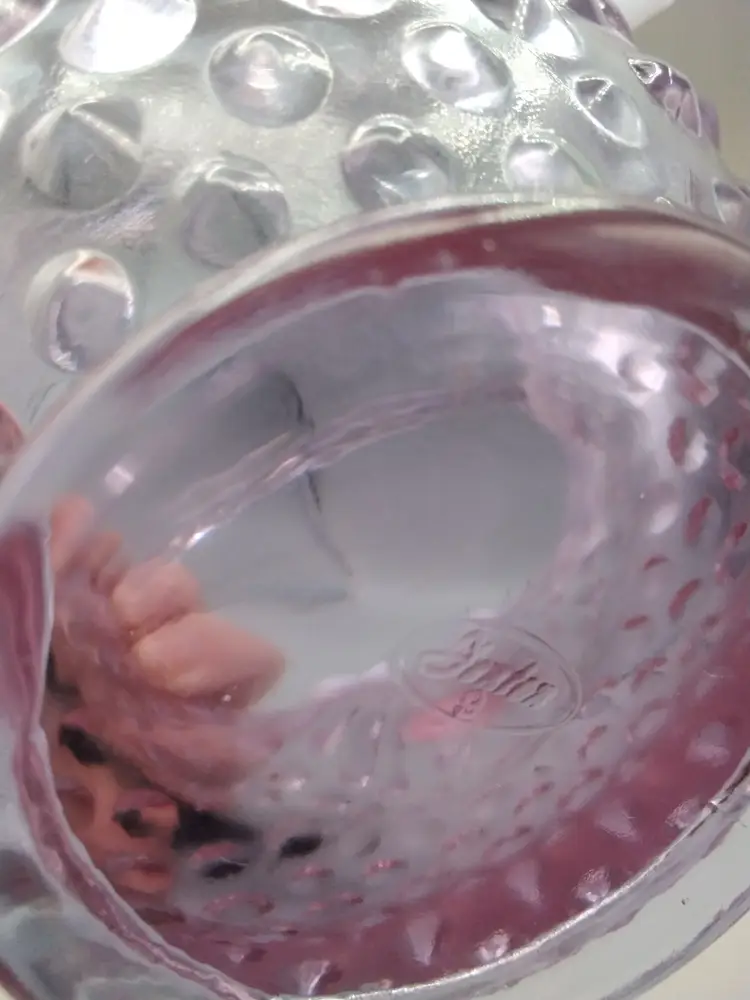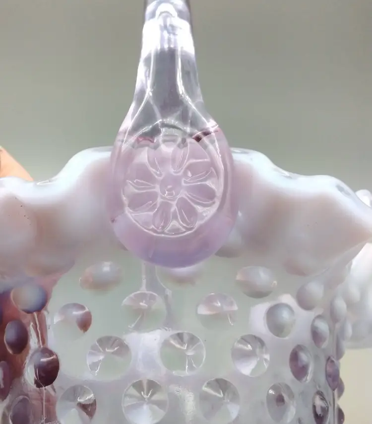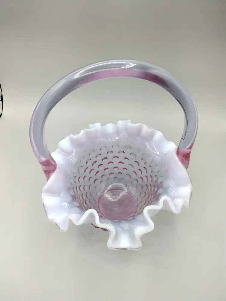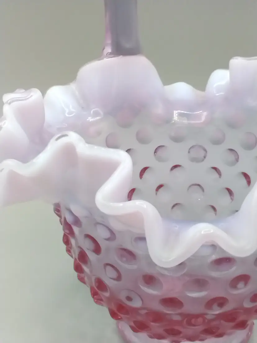 This vintage Fenton hobnail glass basket features a delicate ruffled edge and a sturdy handle. The intricate hobnail pattern and the beautiful blend of colors make it a charming addition to any collection. Perfect for displaying flowers or as a decorative piece.