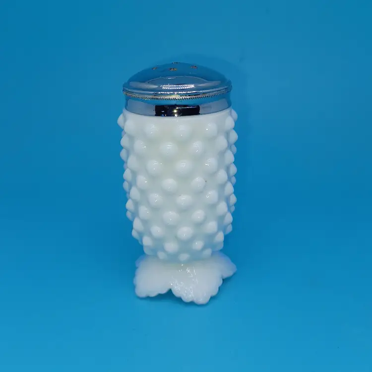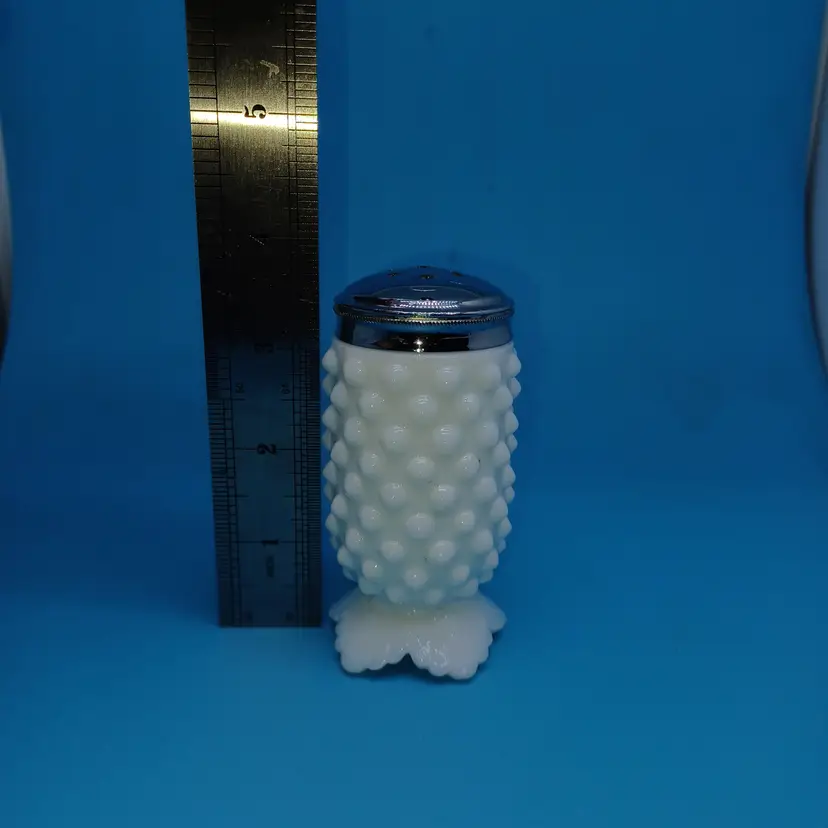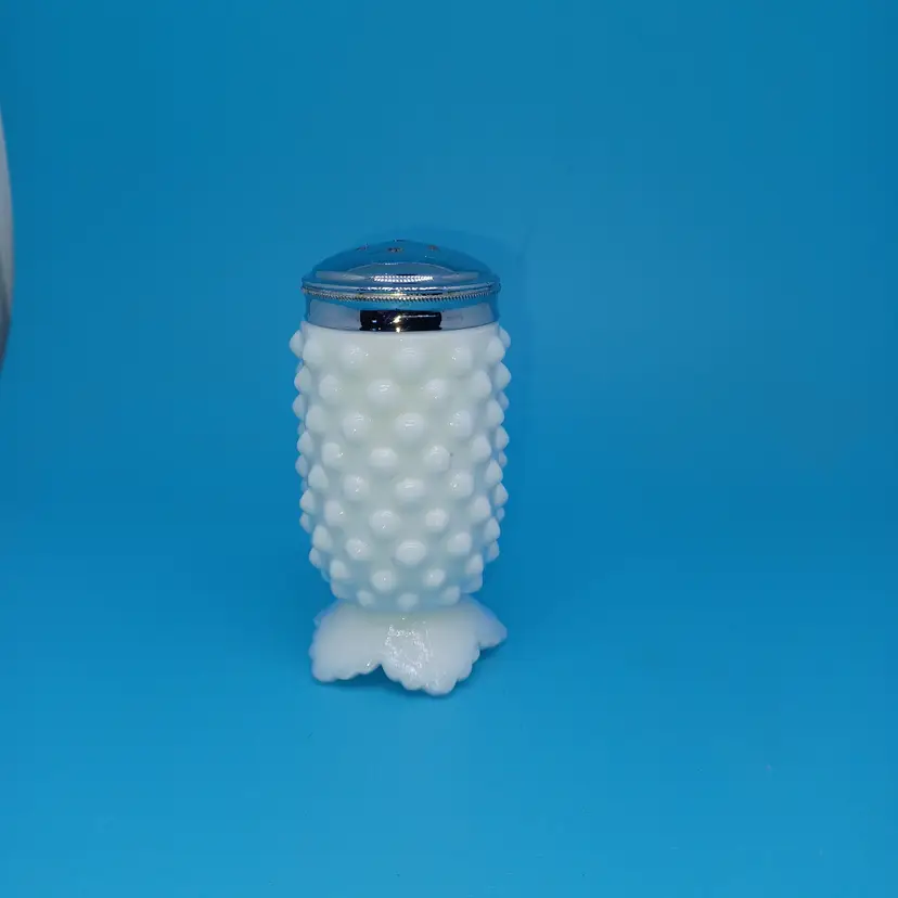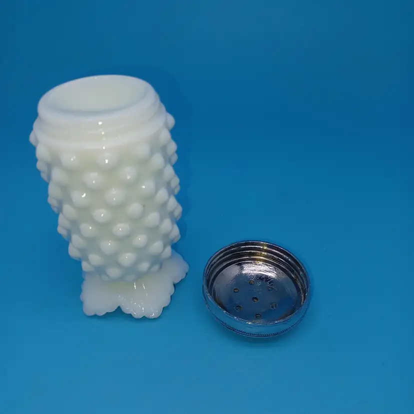 Vintage Fenton milk glass hobnail Shaker with metal lid Height: 3 3/4 in Pressed/Pat Gls, Milk Glass Crafted In United States Discontinued Piece In good vintage condition with no chips or cracks the metal lid does have a manufacturing flaw of a swirl and possibly a little corrosion from salt on the inside lid but still displays great please see all pictures as they are the best description all items from a smoke-free home with pets experienced fragile shipper
