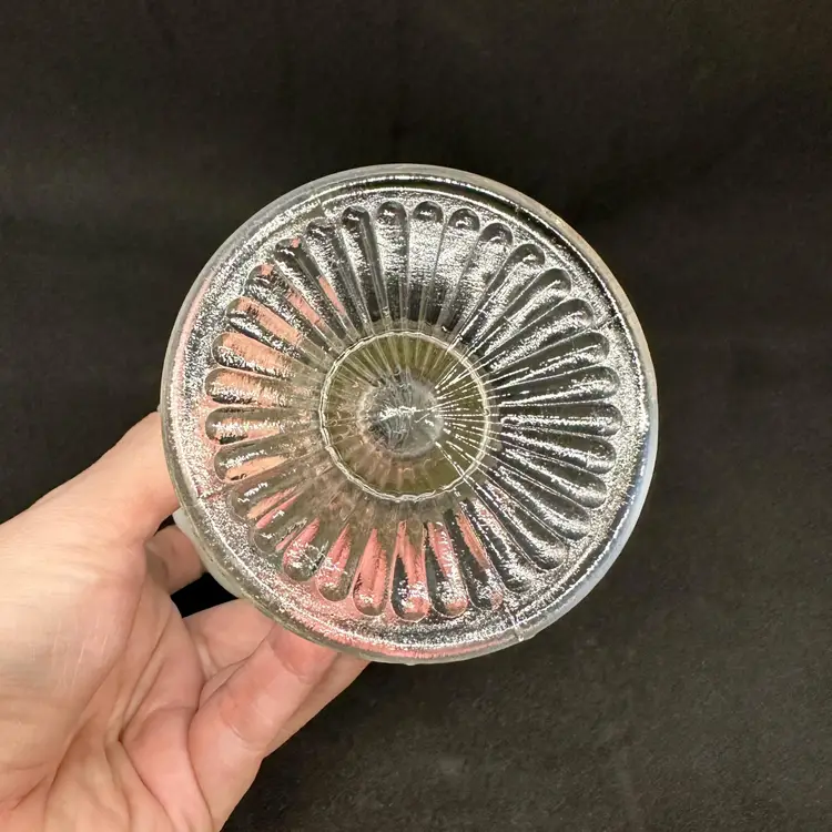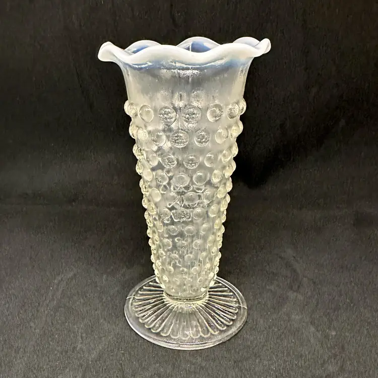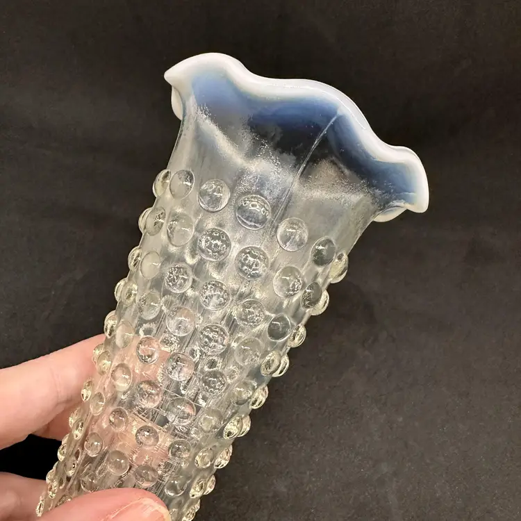 Vintage Fenton hobnail bud vase. Clear with opalescent ruffled edge. Seems foggy/sick overall. No chips or cracks. About 5.5" tall x 2.5" round.