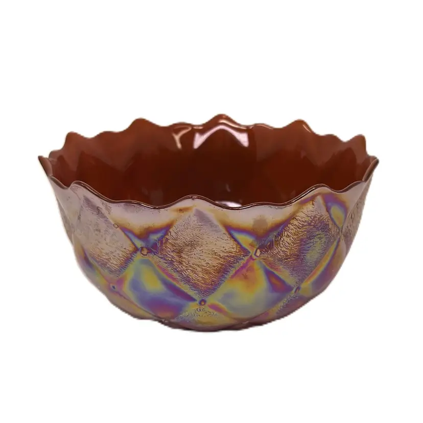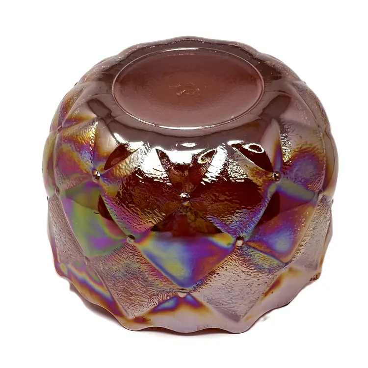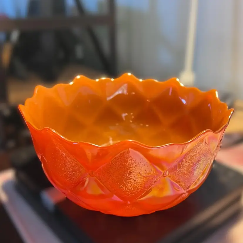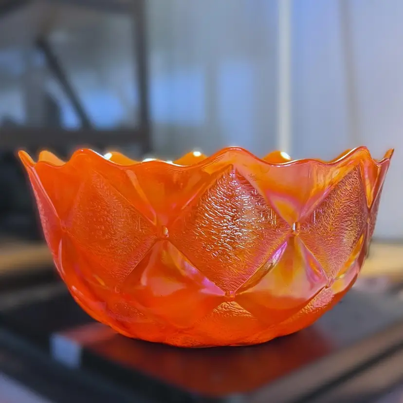 DETAILS: • Dimensions: Height: 3.25", Diameter: 6.75", Weight: 1lb • Manufacturer: Fenton • Design: Deep Serving Bowl • Pattern: Quilted Diamonds • Markings: None • Place of Origin: Williamstown, West Virginia • Date of Manufacture: c1960s-1970s • Materials: Pressed Glass • Color(s): Marigold (Amber Orange) Iridescent